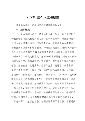 2023年度个人述职报告根据通知要求,现将2023年履职情况报告如下。一、履职情况(一)加强理论学习,提升综合素质。作为一名党员领导干部我坚信学习是成长的必由之路,在平时生活中,始终坚持把学习作为生活习惯的追求,作为安身立命、履职尽责的内在需求,不断提高自身修养和履职能力。一是始终把贯彻XXX新时代中国特色社会主义思想和党的XX大精神作为首要政治任务,深刻领悟两个确立的决定性意义,把对XXX的强烈情感认同理性认同转化为行动自觉,把忠诚拥护、坚定捍卫两个确立体现在理想信念、政治生活、立场定力、担当作为上,把增强四个意识坚定四个自信、做到两个维护融入血脉灵魂,始终做到忠诚核心、信赖核心、紧跟核心、维护核心。二是XXX新时代中国特色社会主义思想内容涵盖广泛,我始终坚持原原本本学,读原著、学原文、悟原理,坚持联系工作实际,把全面学习和重点学习结合起来,坚持干什么就重点学什么、缺什么就重点补什么,既增强学习的全面性、系统性,又增强学习的针对性,做到常学常新、常悟常进。三是积极参加政府机关党支部的主题党日、三会一课、组织生活会、专题培训班等学习活动,不断增强自身理论知识。闲暇时间主动充分利用学习强国、云岭先锋等平台开展学习,进一步拓展视野,开阔眼界,优化知识结构,提升能力素质。(二)严于律己,筑牢廉洁防线。一是筑牢思想防线。作为一名党员干部,必须时刻把维护党的利益,国家的利益和人民的利益作为实现人生价值的最高追求,牢固树立正确的人生观、价值观、世界观。在工作中,始终坚持艰苦奋斗的光荣传统和作风全心全意为人民服务。二是注重行为规范。时刻按照党员干部标准来严格要求自己,时刻保持自重、自警、自醒、自励。严格执行党风廉政建设的各项规定,从小事做起,防微杜渐。堂堂正正做人,清清白白为官,对违背人民群众意愿的事,坚决不做。三是塑造良好格品德。我始终恪守为人以真,待人以诚,处事以公的原则,不断强化自身修养,培养自己的良好品德,对待同志坚持以诚相待;四是强化家庭管理,树立良好家风。与家人共同研究制定了符合家庭实际的家训家风,经常与家人谈心谈话,观看相关相关视频,加强家人的管理,做到不拿,不吃,不用,树立干净的家庭风气。(三)认真履职尽责,扎实推进任务落实。一是综治中心的实体化运行。制定了以联调,联防、联治的工作机制,对于矛盾纠纷和不稳定因素,调度相关村、职能部门,及时参加协调处理妥善化解矛盾纠纷,保证了综治中心高效、有序运行。二是严格落实保山市域社会治理智慧系统应用推广,截至目前,累计录入家庭5271户,录入进度达100%,动态据实采集处理相关事件录入矛盾纠纷121件、民众诉求1678件、安全隐患106件。三是坚持以防范化解矛盾纠纷为抓手,深入开展大排查大化解专项行动截至10月份,共排查和受理各类矛盾纠纷71件,化解69件,化解率达97.18%。对排查出来的矛盾纠纷,及时召开专题会议进行研判,安排包保化解责任领导进行处理,由乡村组三级联合组织调解小组进行调解,确保将纠纷大事化小,小事化了,避免矛盾冲突的进一步激化,对暂未化解的纠纷,安排村级综治员定期走访,做好稳控工作。四是强化风险管控。按照一月一研判的工作要求,集合各班子成员、各部门负责人、各村(社区)党总支书记等相关人员对辖区内风险家庭户222户(高风险23户、中风险33户、低风险166户)、婚姻家庭36户(高风险5户、中风险9户、低风险22户)、138名精神病患者、重精病人31人、八类重点人员147人,社区矫正对象11人,纳入安置帮教的刑释解教人员113人128名在册吸毒人员开展全面分析研判,防范化解风险,明确乡村组三级包保责任人,定期开展走访、清楚掌握动向,确保特殊人群管控到位。五是建立长效信访工作机制,截止2023年10月,共办理上级交办来信来访来电7件,目前办结6件,办结率85.71%。六是配合县级相关部门完成2个垃圾热解处理站的建设,目前正常运营,极大地改善了群众生产生活环境。七是严格落实耕地保护制度。在乡党委、政府的领导下,年内,对XXXX乡涉及的2021-2022年耕地流出图斑728个,3647.94亩,全部完成整改举证并通过省级审核;完成稳定耕地、基本农田核实处置相关工作。八是旗帜鲜明地站在意识形态工作第一线,带头抓思想理论建设,按照一岗双责要求,抓好分管部门和所挂村的意识形态工作,对职责范围内的意识形态工作负领导责任,切实推动意识形态工作责任制落细落实、落地生根,形成常态长效工作机制。九是牢固树立法律至上的意识,注重在日常工作中学习法律知识。通过学习,强化法学理论素养,提高遵纪守法、廉洁奉公的自觉性,提高依法决策、依法管理、依法行政的能力和水平,自觉依法行使手中的权力,争取做学法、懂法、守法的表率。十是严格落实自己职责范围内的安全生产责任,特别