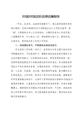 XX县XX镇述职述德述廉报告一年来,在县委、县政府坚强领导下,我认真贯彻落实党的XX大精神,坚持以XXX新时代中国特色社会主义思想为指导,将XX主题教育与中心工作相结合,以强烈的事业心和责任感,认真履职尽责,尽心竭力工作,团结带领全镇人民,解放思想,求真务实,较好地完成了各项工作任务。一、加强理论学习,不断提高自身综合能力作为政府工作的第一责任人,在身体力行率先履行政府的各项职能的同时,不忘坚持学习,增强自身的政治素养和服务于社会经济建设的能力,切实提高政治站位,同党委保持高度一致。我始终坚持把理论学习和提高理论修养放在首位,努力提高政策理论水平和自身综合素质。加强党性修养,牢固树立正确的世界观、人生观、价值观、权力观、地位观和利益观,着力解决自己在思想观念、工作作风、领导水平等方面存在的问题,增强领导科学发展的能力和水平。认真学习贯彻党的XX大精神和习XXX系列重要讲话精神,认真落实县委和镇党委的决策部署,学透吃透精髓要义,确保党的各项路线方针政策不走样、不变形,在政府实际工作开展中得以践行,努力提高服务基层群众、服务社会经济稳步发展的能力。二、突出中心,全面做好政府各项工作过去的一年,认真落实县委、县政府和镇党委各项部署要求坚决贯彻高质量发展理念,扎实推进XX工程,统筹开展改革发展稳定各项工作,圆满完成年初制定的目标任务。全镇完成国内生产总值XXXXX万元;固定资产投入XXXX万元,同比增长XXX.X%;公共财政收入XXXX万元。1.有力推进乡村振兴,产业发展成果突出。坚持农业农村优先发展,稳步推进农业项目建设。深入推进米袋子工程,完成XXXX余亩粮食生产功能县划定工作,切实扛稳粮食安全重任。扎实开展菜篮子工程,强力助推投资XXXX万元的XX果蔬种植项目落地,龙头带动作用逐步凸显。投资XXX万元完成XX合作社农业产业化经营体系建设,产业化水平明显提升。积极调整农业种植结构,粮豆轮作补贴面积XXXX亩。立足地县优势,大力培植特色产业,拓宽销售渠道,产业优势更加明显。加快构建新型农业经营体系,农民专业合作社发展势态良好,创建市级及以上合作社X家,国家级合作社X家,累计流转土地面积达万亩。2.深入推动企业提质增效,园县提升改造工作有序进行。企业管理规范化水平稳步提高,镇域内XX家工业企业,XX%以上取得审批备案。强化企业品牌建设,xxx被评为XXX市名牌产品。坚持走出去与请进来相结合,招商引资实际到位XXXX万元超出任务XX.X%。深入开展双万双服,严格落实三级包联制度,深入企业现场服务XX家次,召开企业家座谈会X次,利用政企平台线上解决问题XX个,当好服务店小二,营商环境持续优化。3.持续深化绿色发展,环境质量显著改善。坚持生态优先、绿色发展,深入贯彻绿水青山就是金山银山的发展理念,坚决打好污染防治攻坚战,全镇环境水平稳步提升。散乱污企业两断三清一净工作持续巩固,排查企业XXXX家次,地条钢排查始终保持高压态势。企业环境投入持续加大,XX家企业投入XXX余万元完成污染物处理设施改造提升。圆满完成蓝天使命行动各项任务,XX家企业全部落实减排措施,空气质量同比名次稳步提升。全力推进清洁能源替代工程,积极开展X个村煤改电工作,累计安装壁挂炉XXXX台。大力实施农村人居环境整治,持续开展全域清洁化大清整,XX个村地埋式垃圾箱投入使用,基本实现农村生活垃圾村收集、镇运输、县处理。坚决落实河(湖)长制工作要求,健全河长组织体系,清理河道、坑塘问题点位XXX处、各类垃圾漂浮物XXXX余平方米,拆除沿河垃圾池X个协调县水务局完成XX清淤工作。4.加快补齐民生短板,群众幸福感、获得感显著提升。坚持民心是最大的政治,立足民生痛点,将着力满足人民群众对美好生活的向往作为政府的奋斗目标和根本追求。全力推进乡村路网建设,新建、大修、扩建乡村公路X条X.XX公里。大力开展乡村公路生命安全防护工程,组织XX次安全隐患排查,协调县交通局新增防护栏X处。投资XXX万元,推动XXXX美丽村庄建设,硬化主干路XXXX平方米,硬化里巷XXXXX平方米,安装太阳能路灯XXX盏,村级基础设施日趋完善。加快推动农村污水处理项目建设,采用管网+村污水处理站模式,实现XXX村污水管网全覆盖。完成危房改造XX户,同比上升XX个百分点。树牢宗旨意识,解决XXX生活用气难问题。加大教育投入力度,出资XX万元完成对XX镇中学南教学楼及供暖系统修缮工作。累计开展各类文化娱乐活动XX余场,不断满足人民群众精神文化生活新期待。坚持按照兜底线、织密网、建机制的工作要求,精准规范落实民生政策。扎实推动社会救助,新办低保XX户,特困供养X户,申报临时救助XX户,发放救助金XX.X万元。深入开展困难群众排查解困,入户访查XXXX户,对