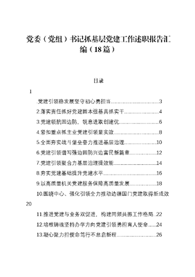 党委(党组)书记抓基层党建工作述职报告汇编(18篇)目录1.党建引领稳发展坚守初心勇担当..32.落实责任抓好党建固本强基真抓实干43.党建领航固边防,锐意进取创建优.64.紧扣重点抓主业党建引领显实效85.全面夯实战斗堡垒奋力推进基层治理.106.党建引领谱写强边固防兴边富民新篇章..127.党建引领聚合力基层治理提效能.148.夯实党建基础提升党建水平.169.以高质量机关党建服务保障高质量发展..1810.围绕中心、强化引领全力推动边疆国门党建取得新成效2011.推进党建与业务双促进,构建同频共振工作格局..2212.培根铸魂坚持办学方向党建引领勇担育人使命.2413.凝心聚力担使命笃行不怠启新程.2614.党建赋能暖新聚力.2815.苦干实干谋健康踔厉奋发向前行.3016.抓党建促发展强服务惠民生.3217.党建引领提升市场监管效能.3418.党建引领聚合力履职尽责促发展36党建引领稳发展坚守初心勇担当一、工作成效一是坚持党的政治建设,政治三力不断提高。二是全力以赴打好疫情防控攻坚战、乡村振兴持久战、平安稳定保卫战三场战役。三是织密建强组织体系神经末梢。成立勐卯街道两新组织党委,优化机关支部党员结构,以站办所为基本单元增设党小组。四是聚焦问题抓整改,强化措施促提升。解决民生实事xxx件。五是严格抓好党风廉政建设,落实一岗双责。二、主要不足一是统筹疫情防控和社会发展方面还存在差距。二是基层人力资源的配优配强方面存在短板。三是干部队伍的作风建设仍需加强。原因:在抓党建与疫情防控、经济发展工作方面思考和探索不足。三、下步打算一是提升政治领导力,全面落实意识形态工作责任制。二是提升思想引领力,全力解决基层难点痛点。三是提升群众组织力,统筹社会资源推动强基固本。四是提升社会号召力,配齐配强社区党建工作力量。五是深入开展两个革命,推动各项工作一抓到底。落实责任抓好党建固本强基真抓实干一、工作成效一是履责从严。专题研究农村基层党建工作xx次,多次深入基层开展工作督查及调研指导。二是组织强基。对xx个基层党组织全覆盖开展规范化摸底排查。年内发展xx名预备党员,处理x名违规违纪党员。探索开展六个先锋党员积分制,xx小组被评为xx市基层党员教育实训基地(基础治理类)。深入开展万名党员进党校培训x场次,推动党的XX大精神在弄岛落地生根、开花结果;三是助推发展。深入开展村两委换届回头看,列出责任清单xx条,回引人才xx名。全面落实村级组织大岗位制,补选村两委委员x名,整合辅助岗位资金x.xx万元。积极争取壮大村集体经济项目x个共xxxx万元,x个村委会集体经济平均收入高达xx.xx万元。推行十联举措、x+x例会制度、xxxxxx执勤模式,切实筑牢疫情防控责任网。二、主要不足一是党建工作与中心工作融合不深。二是党员教育管理不到位。三是基层党组织战斗堡垒作用发挥不明显。三、下步打算一是严格落实党建责任清单;二是创新党建工作和服务载体,实现党建引领促进工作全域升级;三是深入实施边疆党建长廊建设,培育打造党建+基层治理模式,提升基层治理效能。党建领航固边防,锐意进取创建优一、工作成效一是抓住思想建设定盘星。打造强边固防教育实训新阵地,开展线上+线下党员教育。二是细耕基层党建责任田。党委会专题研究党建工作,制定三合一清单,排查整治xx名党员,智慧党建较上年度提升xx.x%。三是下好品牌树立先手棋。打造边疆党建长廊xx品牌,创建x个xx第一批基层党建十面红旗示范创建点