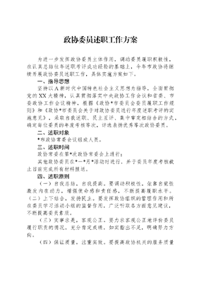 政协委员述职工作方案为进一步发挥政协委员主体作用,调动委员履职积极性,在认真总结往年述职考评成功经验的基础上,今年市政协将继续开展政协委员述职工作,具体实施方案如下。一、指导思想坚持以A新时代中国特色社会主义思想为指导,全面贯彻党的XX大精神,认真贯彻落实中央政协工作会议和省委、市委政协工作会议精神,根据《政协*市委员会委员履职工作规则》和《政协*市委员会关于对政协委员进行年度述职考评的实施意见》,采取自我述职、民主互评、集中审定相结合的方式,确定每位委员的年度考核等次,评选表扬优秀等次政协委员。二、述职对象*市政协常委会议组成人员。三、述职时间政协常委在第*次政协常委会上进行;其他政协委员在*-*月*活动时进行,并于委员年度考核截止日前完成所有材料报送。四、述职原则(一)自我总结,自我提高。要调动积极性,依靠自觉性激发内在动力,增强使命感和责任感,不断提高履职水平。(二)上下结合,发扬民主。要发挥政协组织的管理作用和所在委员学习活动小组的监督作用,广泛听取各方面意见建议,不断提高委员素质。(三)实事求是,客观公正。要力求客观公正地评价委员履行职责的情况,充分肯定成绩,如实指出不足,明确努力方向。(四)保证质量,注重实效。要提高政协机关的服务质量政协委员的述职质量、委员学习活动小组的测评质量,力求述职程序简便易行、效果实在。五、述职内容委员述职应全面反映委员本年度及自本届当选政协委员以来,在政协组织中履行职责和以委员身份参加社会活动的有关情况。述职主要内容有:1.结合第二批学习贯彻AA新时代中国特色社会注意思想主题教育,学习贯彻A新时代中国特色社会主义思想,全面贯彻党的*大精神,坚持思想政治引领,增强四个意识,坚定四个自信,自觉做两个确立忠诚拥护者、两个维护示范引领者等情况;2.参加市政协全体会议、常委会议,以及市政协组织的专题协商会、委员座谈会和各专门委员会、镇(街道、区)联络组、界别组组织的有关会议等情况;参加调研、视察、考察情况;提交政协提案和全体会议、常务委员会议、协商会发言材料,以及反映社情民意情况;参加理论研究、学习培训、界别活动等情况;参加*协商议事活动;发挥自身优势,投身公益事业,为民办好事情况;熟练掌握并主动运用*市*政协平台开展各项履职活动情况;遵守政治纪律和作风建设情况,对做好人民政协工作提出意见和建议等方面;3.委员本年度的工作情况。包括做出的主要成绩、突出的社会贡献,公益慈善、为民办实事好事,受到的各种奖励、获得的荣誉称号等情况;4.个人认为其他需要述职的内容。六、述职方式及程序委员述职采用书面材料述职与集中会议口头述职相结合的方式进行。在述职前,写好个人述职报告,政协常委填写《*市政协常委述职登记表》,政协办公室填写《*市政协常委述职汇总表》;其他委员填写《*市政协委员述职登记表》,各界别组填写《*市政协界别组委员述职汇总表》。本年度分别按照政协常委、界别组委员(不含常委)总数的*%安排委员进行口头述职。委员参与述职情况记入委员履职档案,并作为年度考核依据之一。委员述职按照以下程序进行:1.述职准备。各委员学习活动小组联络员应提前*个月通知政协委员,委员写出书面报告,并提前*天报送委员学习活动小组。委员学习活动小组做好数据汇总和工作总结。2.述职会议。以委员学习活动小组为单位召开述职会议。参加述职会议的委员达到委员学习活动小组人数的三分之二,述职会议方可举行。述职会议由委员学习活动小组组长或组长委托的副组长主持。3.述职汇报。委员学习活动小组总结小组工作,公布委员参加活动和履行职责的基本数据。委员逐一进行述职汇报。4.民主测评。各委员学习活动小组委员对述职进行民主测评和记分。民主测评和记分以委员履职管理考核办法确立的年度履职情况考核表为依据进行。民主测评档次按照记分高低分为优秀、称职和不称职。5.组织评定。委员学习活动小组根据个人述职和民主测评情况形成综合意见并提出档次建议。委员档次由市政协主席会议审定。6.结果运用。市政协办公室每年对常委会组成人员述职情况进行总结,作为掌握常委会组成人员履职情况和下一届推荐常委的依据。市政协表彰优秀委员,鼓励称职委员,处理不称职委员。述职测评结果以书面形式反馈政协委员和委员学习活动小组,并向政协委员所在单位通报情况。7.因公、因病不能直接参加述职的委员,可提交书面述职报告,也可以委托其他委员代为述职,接受民主测评。除上述情况外,未能参加述职的委员,应在半年内由本委员学习活动小组或所在专委会集中组织补述。超过半年属个人原因未补述的,按不称职认定。七、述职考评标准市政协委员年度履职情况实行量化考核,最终得分为履职基本分、履职奖励分之和。(一)基本分项目(*分)1.委员出席市政协全体会议、常委出席常委会会议(*分)。以半天为单位记*次,缺席会议给