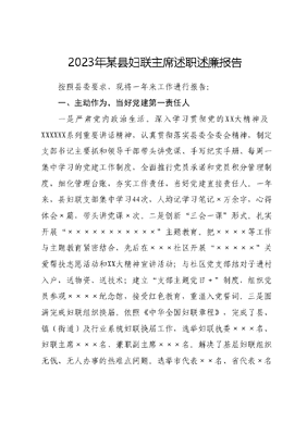 2023年某县妇联主席述职述廉报告按照县委要求,现将一年来工作进行报告:一、主动作为,当好党建第一责任人一是严肃党内政治生活。深入学习贯彻党的XX大精神及XXXXXX系列重要讲话精神,认真贯彻落实县委全委会精神,制定支部书记主要抓和领导干部带头讲党课、手写纪实手册、每周一集中学习的党建工作制度,全面推行党员承诺和党员积分管理制度,细化管理台账,夯实工作责任,当好党建直接责任人。一年来,县妇联支部集中学习44次,人均记学习笔记×万余字,心得体会×篇,带头讲党课×次。二是创新三会一课形式。扎实开展×××××××××××主题教育。把××××等工作与主题教育紧密结合,先后在×××社区开展×××××关爱帮扶志愿活动和XX大精神宣讲活动;与社区党支部结对子进村入户,送物资、送技术;建立支部主题党日+制度,组织党员参观××××纪念馆,接受红色教育,重温入党誓词。三是圆满完成妇联组织换届。依照《中华全国妇联章程》,完成了县、镇(街道)及行业系统妇联换届工作,选举妇联执委×××名、妇联主席×××名、兼职副主席×××名。解决了基层妇联组织无钱、无人办事的热难点问题。选举市代表××名、省代表×名全面完成省市妇女大会任务。二、积极履职,抓班子带队伍一是明确目标抓管理。全面落实中央省市纪委全会和县党代会部署和要求,制订了《××县妇联领导班子成员2023年度落实党风廉政建设主体责任工作计划》和《工作台帐》。制订了《廉洁自律承诺书》和党风廉政定期学习制度,坚持党风廉洁教育工作常态化开展。二是强化监督促履职。坚持民主集中制,对贫困母亲、维权救助、省市县两癌妇女之家建设等重大事项,提交领导班子集体讨论决策。同时将党费收交、个人承诺、单位三公经费支出、民生项目物资发放情况及时进行公示,接受社会各界人士的监督。三是加强教育提素质。严格执行中央八项规定,实行干部管理刚为目标责任制管理和月评比、季考评制度,细化干部管理。对新任镇(街道)妇联主席、兼职副主席、县直机关妇委会主任进行集体约谈签定目标责任书。组织县级妇联开展座谈、培训和述职活动××场次,向同级妇联执委会汇报工作×次,听取述职×次,举办××县妇联改革能力建设培训班,提升妇联干部服务妇女群众的能力和水平,完成了×××名妇联执委的实地培训。切实增强妇联执委的示范带动和服务引领作用。三、改革创新提效能一是丰富家庭文化。评选最美家庭、平安家庭、廉洁家庭×××户,争取资金××万元,创建县家庭教育指导中心和××名家庭教育志愿者培训工作。开展×××××三八庆祝活动,全县××个镇(办)、××个机关单位开展了内容丰富的活动,带动全县3万余人参加。二是助力乡村振兴。县妇联有干部×名,派遣第一书记×名,与镇上干部联合包扶××××社区。一年来,县妇联一班人兢兢业业,统筹安排,加班加点,努力做好乡村振兴工作。先后为社区的贫困户发放价值×××元的李宁牌运动服×××套,开展×××××饲养培训会;为社区争取休闲农业综合项目,新建桃园×××亩、油菜××××亩;为社区争取××万元,建设标准化灯光球场,新建活动室五间两层打造社区党群活动之家;召开专题会议,宣传政策,扶志扶智。同时,表彰女致富能手××名,推荐命名市县巾帼文明岗、创业示范基地××个,激励广大女性创新创业。三是服务广大家庭。争取资金××万元,救助两癌患者救助××人;争取项目物资××万元,×××名贫困母亲受益;发放事实孤儿资金近××万元,累计××××人次受助;组织机关干部×××余人开展志愿服务活动××余场次,××××余名老人享关爱。四、存在的问题一是教育学习方式方法有待于创新,有重内容轻形式的现象二是干部管理上还需要进一步加强,有面轻软怕得罪人思想;三是在跟踪问效上还需要加大力度,有重安排轻落实,会议上说得多,检查问效的少。五、下一步工作打算一是继续深入开展党的XX大精神学习活动,持续深化××××××××××主题教育成果,切实增强四个意识;二是继续开展妇女儿童之家示范点创建活动,优化服务,切实增强妇联组织三性;三是创新载体,举办形式多样、内容丰富的培训班,切实提升为党做好妇联工作的能力和水平。