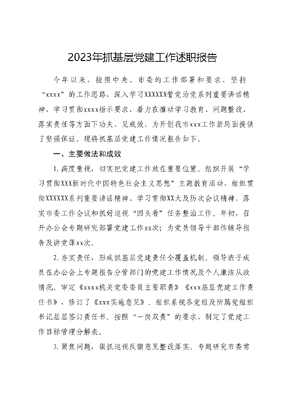 2023年抓基层党建工作述职报告今年以来,按照中央、市委的工作部署和要求,坚持xxxx的工作思路,深入学习XXXXXX管党治党系列重要讲话精神,学习贯彻xxxx指示要求,着力在推动学习教育、问题整改、落实责任等方面下功夫、见成效,为开创我市xxx工作新局面提供了坚强保证。现将抓基层党建工作情况报告如下。一、主要做法和成效1.高度重视,切实把党建工作放在重要位置。组织开展学习贯彻XXX新时代中国特色社会主义思想主题教育活动,组织贯彻XXXXXX系列重要讲话精神、学习贯彻XX大及历次会议精神、落实市委工作会议和抓好巡视回头看任务整治工作。年初,召开办公会专题研究部署党建工作xx次;为党员领导干部作辅导报告及讲党课xx次。2.夯实责任,形成抓基层党建责任全覆盖机制。领导班子成员在办公会上专题报告分管部门的党建工作情况及个人廉洁从政情况。审定《xxxx机关党委委员主要职责》《xxx基层党建工作责任书》,修订了《xxx实施意见》。组织系统各党组及所属党组织书记层层签订责任书。按照一岗双责的要求,制定了党建工作目标管理分解表。3.聚焦问题,狠抓巡视反馈意见整改落实。专题研究市委常委会关于中央巡视组回头看反馈意见后,结合巡视组反馈意见,研究制定了《xxx实施方案》,对x个方面x项整改任务,建立工作台帐,明确问题清单、任务清单、责任清单和完成时限。审定下发了权力清单流程,开展风险防控登记,强化权力运行制约和监督,确保权力正确行使,严防各类违规违纪现象发生。坚持问题导向和开门整改,深入基层开展调研,制定了xx条整改措施目前,已全部完成整治任务。二、存在问题及原因1.不同程度存在党的领导弱化、党的建设缺失、从严治党不力等问题。比如有的单位民主生活会一团和气,批评与自我批评没有达到红脸、出汗的目的。2.思想政治建设薄弱,学习教育效果不够明显。落实谈心谈话制度没有做到经常性、全覆盖,思想工作缺乏针对性;有的单位开展学习教育没有坚持问题导向,结合实际不够紧密;有的党支部抓学习制度落实不够严格,党员有缺勤、缺课现象。3.党员先锋模范作用和基层党组织战斗堡垒作用发挥不够。在党员相对集中的地方党员先锋模范作用发挥作用不明显。产生问题的原因主要体现在以下三个方面:一是对抓党建思想重视程度还不够。把党建工作与落实xx工作条例、推动xxx事业发展放在同等位置考量、部署、推进不够;针对党的建设缺失等不严不实问题,下功夫抓整改、抓落实的力度还不够大。二是内部监督不够有力。有的基层单位内部监督制约不够有力,不敢监督、不愿监督;有些党员干部怕伤和气、怕招麻烦,存在好人主义现象;对整改问题不到位、落实上级要求不及时的单位还没有很好的运用问责手段,存在失之以宽、失之于软的现象。三是工作作风还不够扎实。对一些基层党组织在队伍建设、五好党支部创建中存在的问题有所认识,但是下功夫抓整改抓落实的力度还不够大。对基层党员领导干部理论学习、党务干部队伍能力素质关注不够多,影响了党建工作实效。三、下一步工作打算要按照XXXXXX对xx工作的重要要求,把党建工作置于更加突出的位置,落实党要管党、从严治党各项要求,重点做好以下几方面工作:1.注重强化党员干部教育管理。持续抓好学习贯彻XXX新时代中国特色社会主义思想主题教育,引导党员干部读原著、悟原理,不断强化理论素养。严肃党内政治生活,切实提高三会一课等党内政治生活质量。加强对党员干部思想教育,增强思想工作的针对性、前瞻性。突出抓好党风廉政教育,切实铸牢敬畏清廉、忠诚的思想根基。严格落实制度,全年集中两次对各单位落实规章制度执行情况进行督导检查,对落实不到位的地方,提出指导改进意见,限期整改,进一步规范党员干部言行。2.持续抓好回头看任务整改。把纪律挺在前面,把政治纪律挺在各项纪律的前面。对圈子文化、好人主义等问题,建立清单台账,实行销号管理,定一项改一项、改一项成一项。强化督促检查,采取定期检查、集中督查、随机调研等方式,限时整改、跟踪督办。强化通报问责,对于问题不解决、责任不落实的,要坚决问责。3.全面落实党建工作责任。把党员领导干部特别是班子成员纳入牛鼻子四级递进里面。深入抓好各级领导班子、主要负责同志、领导班子其他成员、各级党组织书记党建工作责任落实,进一步明确责任的内容和标准。各级党组织书记要落实一岗双责,对苗头性、倾向性问题,要及时发现、督促纠正。4.严格执行党的纪律。各级党组织要把《准则》、《纪律处分条例》《问责条例》《xxx若干准则》《监督条例》以及八项规定和运用四种形态等制度规定全面执行并纳入党组中心组的学习内容,纳入党课和党员学习培训计划,采取多种形式,增强学习效果。党员领导干部特别是各单位主要负责同志,要以身作则,作好表率,带头学习纪律、严格遵守纪律、自觉维护纪律,切