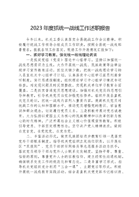 2023年度抓统一战线工作述职报告今年以来,机关工委认真落实全县统战工作会议精神,积极履行统战工作领导小组成员工作职责,按照全县统一战线部署要求,狠抓各项工作落实。现将工作开展情况汇报如下:一、抓好学习教育,强化统一战线理论武装一是抓实党组(党委)理论中心组学习。坚持以加强统一战线思想意识为主线,大力开展统一战线、民族政策等法律法规学习宣传教育活动。抓住关键少数,把统一战线理论学习纳入县直机关中心组学习计划,认真落实中心组学习派员列席旁听制度,实行月通报制度,组织理论学习中心组学习情况专项检查,对发现问题及时反馈整改。实现机关单位学习教育全面覆盖。二是抓实普通党员思想建设。加强对机关党员的思想引导和教育,引导机关党员自觉加强党性修养,组织开展县直机关党员轮训,把统一战线内容列入重要内容,提高机关党员对统战工作的认知和理解水平,推动党员增强党的意识、宗旨意识和群众观念,切实履行党员义务。三是积极开展对党忠诚教育。大力弘扬以爱国主义为核心的民族精神和以改革创新为核心的时代精神,广泛开展社会主义核心价值观宣传教育,积极引导党员、干部坚定理想信念,坚守共产党人精神追求,做到在党言党、在党忧党、在党为党。二、丰富活动形式,做实民族团结进步教育引领一是落实党外干部联系制度。指导机关党组织立足岗位职责,以开展社区双报到、党员干部担任网格员等志愿服务活动为抓手,落实党员领导干部与党外人士联系交友制度,坚持平等、尊重、信任的原则,尊重党外人士的宗教信仰、建立经常性沟通机制,确保联系交友工作的规范化和常态化。二是丰富学习形式。指导机关党组织充分利用三会一课、主题党日等形式,积极开展统一战线教育实践活动。结合县直机关党支部书记培训班、发展党员培训班、集中宣讲等活动,认真组织学习XXXXXX关于统战工作的重要论述、《中国共产党统一战线工作条例》政策等,做到入脑入心。三是用好红色资源。依托中共第一支部旧址等红色阵地,用好红色资源,教育引导机关党员深刻认识和把握中国共产党人领导各族人民浴血奋战,从站起来、富起来到强起来的光荣历史,激发机关党员铭记党的光辉历史,坚守初心使命。三、抓好工作落实,不断凝聚统战工作合力一是抓好机关党员日常管理。定期组织开展信教党员排查工作,指导各级党组织对现有党员进行全面排查,重点排查是否有信仰宗教、参与宗教活动、传播宗教思想等问题,切实维护党的政治纪律和政治规矩,坚决防止和反对宗教信仰在党员队伍中的传播和影响,保持党的先进性和纯洁性。二是严把发展党员入口关。认真履行主体责任,通过查阅档案、个别谈话、座谈了解、统战部门联审等方式,严格预备党员发展对象思想考察,坚决防止信仰宗教等不符合条件的人员进入党的队伍。三是严格信教党员管理。对排查出的信教党员,严格按照党章和有关规定进行处理,对不符合党员条件的人员,坚决予以清退;对存在其他问题的党员,按照规定进行批评教育、组织处理或者纪律处分。同时,加强对党员信仰、思想、言论等方面的监督,防止党员违规参与非法宗教活动或者与宗教有关的活动。下步工作中,工委将继续落实工作职责,加强政策宣传和舆论引导,进一步抓好马克思主义无神论宣传教育,提高机关党员对宗教的认知和理解水平,确保机关统战工作扎实深入开展。