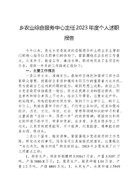 乡农业综合服务中心主任2023年度个人述职报告今年以来,我在乡党委政府的坚强领导和上级业务主管部门的精心指导以及同事们的协助下,紧紧围绕农业农村工作重点,认真学习、勤奋工作、廉洁自律,较好地完成了各项目标任务,现将一年来的工作简述汇报如下:一、主要工作情况一是以学立本、准确定位,我始终坚持把加强学习作为汲取群众智慧、提高综合素质和搞好本职工作的重要着力点来抓。努力提高自己应对新问题的能力,做到思想上成熟,政治上同乡党委政府保持高度一致性。努力在提高自身的理论修养、职业素养和综合素质上下功夫。结合工作需要,注重向农户学,向实践学,向有经验的老同志学,做到干什么学什么、缺什么补什么。积极拓展学习的广度,不仅学业务知识,而且加强对经济、历史、文化、科技、社会、管理等领域知识的学习积累。注重保持日拱一卒、月进一步的刻苦精神,根据岗位和所处的环境不断学习、积累和更新,在多看、多思多悟多学上下功夫,认真苦练提笔能写、开口能讲、问策能答、遇事能办的真本领、硬功夫。二是以干固本、踏实谋事,紧紧围绕乡党委政府的工作思路,研究决定的事项,逐条逐项认真细致抓好落实。注重强化身在兵位,胸为帅谋的责任担当,2023年主要完成了以下几项重点工作:1、粮食生产。粮食作物播种5.93617万亩,产量3.5197万吨,产值9686.8万元;2、蔬菜生产。蔬菜种植1.04万亩,产量1.2万吨,产值4800万元;3、水果生产。水果种植1.5949万亩,产量12.45万吨,产值32996.5万元;4、经作产业。糖料甘蔗种植0.6967万亩,农业产量达4.18万吨,产值1881.09万元;橡胶种植3.025万亩,产量3025万吨,产值28132.5万元;茶叶种植0.5012万亩,产量106.38万吨,产值1644.61万元;生物药业种植0.3969万亩,产量0.0708万吨,产值1310.8万元;烤烟种植2500亩,收购产量6516担,产值1093.29万元;5、渔业生产。水产养殖面积0.1692万亩,渔业总产量达0.14156万吨,产值2900.84万元。6、项目推广。地膜科学使用回收试点整县推进项目工作。完成废旧地膜回收8714亩60998公斤;水稻旱作及大豆玉米带状复合种植项目工作。共免费发放水稻种子174公斤,玉米324公斤,大豆1350公斤;扩种油菜项目工作。共免费发放油菜种子2400包,硼肥1200包;玉米单产提升三年行动。创建百亩攻关田1个,涉及农户127户,举办技术培训2期,培训技术人员、科技示范户和农户200人;7、畜牧生产。生猪存栏18453头、牛存栏11024头、山羊存栏5187只、禽类存栏173737羽;肥猪出栏27052头、牛出栏3673头、羊出栏4008只、禽类出栏241578羽;肉类总产量3571.6吨,共计产值1.5842亿元;8、农机安全。对全乡9家农机具销售门市检查3次,开展农机具使用者安全宣传10余次,对全乡农机具拥有者摸排1次1843户,并进行安全宣传、签订安全责任书;9、市场检疫。进行产地检疫活畜10230头;开展产品检疫2795头;10、农产品质量监测。蔬菜和水果农药残留检测样品107个,其中水果样品17个,蔬菜样品90个。经检测,107个样品均合格,检测合格率达100%;11、农业综合执法。对我乡20余家种子、农药、化肥、兽药、饲料等农用物资经营商铺开展了7次专项治理和执法行动;12、农村宅基地审批、管理工作。受理农村宅基地37宗,上报乡政府审批27宗;13、全面推行河(湖)长制。4次到库区开展反弹非法捕捞渔具拆除工作,累计拆除反弹非法捕捞渔具抬网52张,开展河长清河行动6次,投入党员群众270余人,清理河道16千米,清理垃圾2.6吨,截止目前,村级河长巡河748次,乡级河长巡河187次;14、农村人居环境工作。建设卫生户厕340座,支付补助资金34万元;创建县级绿美村庄示范点10个,完成绿化面积2408.3平方米;植树222株;投资14万元;15、惠农补贴核发工作。2023年耕地地力保护补贴核发放资金551.270345万元,面积48472.02亩,惠及农户5878户;实际种粮农民一次性补贴发放资金26.5643万元;面积5322.5亩,惠及农户1354户;农机补贴。完成农机购置中央补贴13台,补贴资金10.05万元;16、产业扶贫工作。完成有产业发展条件的脱贫户及三类监测户1419户5512人,产业双绑帮扶工作对有产业发展条件及意愿的脱贫户及三类监测人员产业帮扶及双绑利益联结机制达100%,实现产业全覆盖。三是以律正本、慎独慎微,在日常工作和生活中,坚持规范自己的言行,信守吃亏是福的原则,严格按规定和程序办事,不乱许愿,服从组织,服从领导。始终树立廉洁自律、艰苦朴素和遵纪守法的意识,努力做到为人正派,处