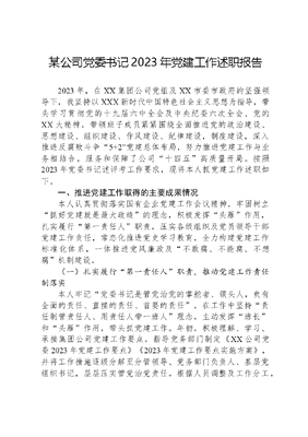 某公司党委书记2023年党建工作述职报告2023年,在XX集团公司党组及XX市委市政府的坚强领导下,我坚持以XXX新时代中国特色社会主义思想为指导,带头学习贯彻党的十九届六中全会及中央纪委六次全会、党的XX大精神,带领班子成员紧紧围绕全面推进党的政治建设、思想建设、组织建设、作风建设、纪律建设,制度建设,深入推进反腐败斗争5+2党建总体布局,努力推进党建工作与业务相结合,服务和保障了公司十四五高质量开局。按照2023年党委书记述评考工作要求,现将本人抓党建工作述职如下。一、推进党建工作取得的主要成果情况本人认真贯彻落实国有企业党建工作会议精神,牢固树立抓好党建就是最大政绩的理念,积极发挥头雁作用,扎实履行第一责任人职责,压实各级组织及党员领导干部党建工作责任,常态化推进党史学习教育,全力构建党建工作标准化体系,一体推进党风廉政及不敢腐、不能腐、不想腐机制建设。(一)扎实履行第一责任人职责,推动党建工作责任制落实本人牢记党委书记是管党治党的掌舵者、领头人,负有全面的责任、直接的责任、首要的责任,在工作中坚持责任制管责任人、用责任人带一班人理念,主动发挥班长和头雁作用,带头抓党建工作。年初,积极理解、学习、承接集团公司党建工作要点,指导党务部门制定《XX公司党委2023年党建工作要点》《2023年党建工作要点实施方案》,并将工作措施逐级分解至分管领导、党务部门负责人、基层党组织书记,层层压实管党治党责任。根据人员调整及工作分工,优化调整党委委员联系点制度,指导建立分管党委委员抓党建调研和点评机制,本人每半年召集专题党委会,听取分管党委委员抓党建及党风廉政建设工作汇报。修订完善《XX公司基层党组织书记年度述评考工作管理办法》,优化评议维度,量化考核指标,增加考核排名与薪酬福利挂钩,充分调动了基层组织抓党建工作的责任感、紧迫感,压实压细了党委书记、分管党委委员、基层党支部书记三级抓党建工作责任制格局,有力推动党建与全面从严治党工作向基层纵深发展。(二)强化政治建设,发挥党建引领治理体制机制创新本人带领班子成员坚持以XXX新时代中国特色社会主义思想为指导,通过理论中心组深入学习党的十九届六中全会、XX大精神、中央经济工作会议精神,全面贯彻XXXXXX重要讲话精神等内容XX余场次,坚持旗帜鲜明讲政治,加强政治建设、提高政治能力、强化政治担当,不断提高政治判断力、政治领悟力、政治执行力。推动党委前置程序落到实处,制定新三会权力决策清单,形成清晰的党委前置研究讨论权责边界,又契合公司治理的内在要求,使国有企业党委会与董事会、经理层等治理主体形成各司其职、各负其责、协调运转、有效制衡的公司治理机制。严格执行民主集中制,突出领导班子集体领导地位,及时修订《党委会议事工作规则》,建全完善议事规则和程序。班子成员严格执行三重一大制度,广泛听取各方面的意见建议,按照民主集中制规则议事、决策、办事,全面研究决策三重一大事项XX项,无一例存在决策失误情况。(三)强化思想建设,深入指导常态化开展党史学习教育本人亲自指导党务部门围绕建设学习型领导班子的目标要求,修订完善《党委中心组理论学习管理办法》,根据公司面临的内外部环境形势的发展变化,亲自起草《2023年党委中心组理论学习计划》对党委中心组理论学习的时间、内容、形式提出明确要求。高度重视意识形态工作,把意识形态工作与业务工作同部署、同落实、同检查、同考核,每季度组织班子成员分析研判意识形态领域情况,辨析思想文化领域突出问题,重点研判化解重大问题中出现的苗头倾向性的问题,亲自到普遍性问题单位有针对性地进行引导。持续巩固推进两学一做专题教育和不忘初心、牢记使命、党史学习教育等学习教育活动常态化,通过举办党务干部培训、入党积极分子培训、青干培训、等不同的培训班,针对不同部门、不同层次、不同年龄的党员干部,分门别类设置内容,本人亲自讲授党课X场次。(四)强化组织建设,提升党建工作标准化水平本人以三基建设推动党建工作标准化提升工作,在健全基本组织方面,严格落实四同步要求,进一步健全基本组织,根据公司行政业务部门调整,同步新增2个基层党支部。将原有X个支部按业务调整合并为X个支部,实现集中管理、优势互补。按照选举制度流程要求,提醒X个支部完成换届工作。在建强基本队伍方面,以全市党员信息统计为契机,组织对党员基本信息进行采集和录入,并对党员档案重新进行整理,共整理档案XXX本;严格执行党员发展程序,按照十六字方针要求,坚持成熟一个发展一个的原则,今年共发展预备党员X名、按期转正党员XX名,培养积极分子X名。积极引进党建专业化人才,通过校招引入2名马克思主义专业的硕士研究生,进一步加强党建部门力量。在推进基本制度建设方面,组织对对党委制度