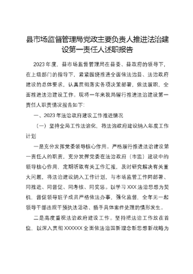 县市场监督管理局党政主要负责人推进法治建设第一责任人述职报告2023年度,县市场监督管理局在县委、县政府的领导下,在上级部门的指导下,紧紧围绕推进全面依法治县、法治政府建设的总体要求,认真贯彻落实各项决策部署,依法履职,全面推进法治建设工作。现将一年来我局履行推进法治建设第一责任人职责情况报告如下:一、2023年法治政府建设工作推进情况(一)坚持全局工作法治化,将法治政府建设纳入年度工作计划一是充分发挥党委领导核心作用。严格履行推进法治建设第一责任人的职责,充分发挥党委在法治政府(市监)建设中的领导核心作用,定期听取有关工作汇报,及时研究解决有关重大问题,将法治建设纳入工作计划,与市场监管工作同部署、同推进、同督促、同考核、同奖惩。以学习XXX法治思想为契机,督促领导班子成员严格依法办事,强化监督,全年无一起领导干部违规干预执法活动、插手具体案件处理的情形发生。二是高度重视法治政府建设工作。坚持把法治工作放在首位,以深入贯彻XXXXXX全面依法治国新理念新思想新战略为目标,及时传达县委全面依法治县委员会第四次会议和建设法治政府(依法行政)工作推进会会议等会议精神,组织召开会议专题部署研究我局法治建设工作。同时,明确分管政策法规科的领导为局法治建设分管领导,由局政策法规科牵头做好法治政府建设及依法行政相关工作,并将该项工作纳入年度系统重点工作和岗位目标责任考核当中。三是严格落实领导班子集体学法制度。2023年扎实推进学习教育。通过党委理论中心学习组学习、周一自学、集中学习、党支部学习、学习强国等多种途径开展理论学习。充分发挥党委理论中心组学习的主阵地作用,制定《县市场监督管理局党委理论学习中心组学习计划》,组织集体学习23次,专题研讨8次。完善《关于认真落实市场监督管理局学习等制度的通知》,督促干部自觉深化学习。组织参加领导干部、公务员学法用法考试和全省市场监管系统学法考法说法活动,全局领导班子和在编干部全部参加学法考法说法学一学、练一练及考一考等各项活动,并取得较好成绩。(二)坚持法治建设规范化,将法治政府建设落到执法实践一是执行重大行政决策法定程序。严格依法依规决策,根据《县市场监督管理局行政执法案件负责人集体讨论工作规则(试行)》,在重大行政决策以及重大疑难案件办理过程中,坚持集体讨论规则机制,提升决策和执法的科学性,提高案件质量。聘请新希望律师事务所律师作为我局法律顾问,并积极发挥公职律师的专长,由公职律师及法律顾问参与讨论和论证,听取意见建议,严格规范案件办理程序,推进行政决策法治化。二是深化行政执法体制改革。落实行政执法体制改革各项任务,自县市场监管行政执法队成立以来,不断优化整合执法职责,梳理执法权力清单,提高执法效能,积极参与全县综合执法体制改革,构建食药监管情报信息网络,通过岗位练兵、师徒结对、专家授课、执法探讨、典型案例分析等针对性较强的教育培训,提高执法办案技能,全面深化执法办案体制改革。三是严格规范行政执法行为。严格贯彻落实省政府办公厅关于行政执法三项制度的工作要求,加强执法人员行政执法资格管理,强化行政执法事前、事中及事后公示,全面推行执法全过程记录,同时做好重大执法决定法制审核。在全局开展行政执法培训,既以典型案例的讲解、重点法条解读等进行执法实务培训,又进行简案快办、普通程序办理案件的办案流程等程序方面的讲解,确保执法工作实体、程序均合法。要求根据《县市场监督管理局行政诉讼出庭应诉办法》,明确机关负责人出庭义务、承办机构职责分工等内容,认真落实行政机关出庭应诉。(三)坚持监管服务优化,将法治政府建设渗透到助力经济建设和服务群众中一是完善行政执法工作制度,开拓执法履职机制创新。全面落实浙江省行政执法监管平台掌上执法系统应用工作,积极构建互联网+监管新型监管体制,加快推进政府数字化转型。建立健全监管事项清单动态管理机制,优化掌上执法系统,迭代监管数据中心,深化双随机、一公开、重点监管、事件核查、信用监管、联合监管5大应用场景,推动平台在各类监管形态中的应用,完善平台考核制度,提升平台智慧化水平,打造高效协同的事中事后监管链。截至目前,今年已开展执法检查13158次,其中双随机检查8109次;跨部门抽查任务215个,跨部门监管率为46.23%,以简案快办形式办结案件196件,罚没款2.77万元。二是深化最多跑一次改革,营造法治化营商环境。为贯彻落实各级党委政府关于六稳六保的决策部署,全力开展市场主体培育发展工作,深化证照分离改革,按照直接取消审批、审批改为备案、实行告知承诺、优化准入服务的改革方式有效落实,区分证照功能,让更多市场主体持照即可经营,着力解决准入不准营问题,持续营造便捷的市场主体准入环境,多措并举提升市场主体新增量。截至