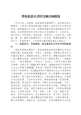 常务副县长述职述廉述德报告今年以来,在县委、县政府的正确领导下,我积极参加主题教育,认真学习贯彻党的XX大精神,始终牢记自己担负的职责,紧紧围绕中心工作,积极贯彻落实党和国家的各项方针政策,在各级组织和有关部门的大力支持配合下,主动作为,勇于担当,开拓进取,攻坚克难,真抓实干,扎实工作,在德、能、勤、绩、廉等方面都取得了一定成绩。根据考核要求,现将本人一年来的学习、工作和党风廉政建设情况汇报如下。一、加强学习,开拓进取,政治素养和工作水平得到新提升始终坚持把加强学习、提高思想政治素质和履职水平放在首要位置,坚持读原著、学原文、悟原理,不断强化理论学习,加强宗旨意识,增强群众观念,苦练内功,增强为民服务本领。一是注重理论武装。把理论学习作为一种政治责任、一种精神追求、一种思想境界,下细功夫、苦功夫,认真学习党的XX大精神、党章以及《XXX著作选读》《XXX新时代中国特色社会主义思想专题摘编》等内容,特别是对党的XX大报告原文进行了反复学习,对XXX新时代中国特色社会主义思想进行了深钻细研,力求系统掌握精髓实质,进一步增强了政治意识、大局意识、核心意识和看齐意识。二是注重学用结合。自觉联系自己的思想、工作和生活实际,时时刻刻本着发现问题、解决问题、提升能力的原则,对照自身存在的差距、不足,深刻剖析,自我反省,有针对性地开展学习实践,不断提升自我党性修养。同时,将学习教育与岗位履职、工作落实等紧密结合,认真学习经济、项目、财经、人事、公安、招商引资、税收、信访司法等知识,真正做到两手抓、两不误、两促进。三是注重调查研究。重点围绕政府职能转变、财税体制改革、重大项目建设、招商引资、商贸物流、民生保障等涉及长远发展的重点问题开展经常性调研,着力提升新常态、新形势下驾驭经济发展的能力和水平。结合学习贯彻党的XX大精神,深入学习领会XXX新时代中国特色社会主义思想,对项目建设和招商引资、加快重点民生工程建设推进社会事业发展等重大问题,带领分管部门到乡镇、社区和企业进行了专题调研,提出针对性措施,为县委、县政府决策部署提供了有效依据。二、抓主抓重,攻坚克难,力促重点工作实现新突破充分发扬5+2、白+黑、人一之、我十之的敬业精神,紧紧围绕全县工作大局,坚持把推动分管领域发展作为第一要务,聚焦中心,创新举措,高效务实推进各项工作开展,努力为肃州经济社会发展贡献自己的力量。1.突出增强后劲抓投资,重点项目建设有序推进。积极应对风电项目暂停、光电项目受限、金融贷款困难、手续办理繁杂等诸多不利因素,牢固树立发展是第一要务、项目是第一要素的理念不动摇,主动适应经济发展新常态,紧盯国家投资导向和上级产业政策,带领全县经济主管部门和各乡镇狠抓项目建设不松劲。对项目工作提前筹划,年初专门健全了区级领导包挂、部门单位包抓责任制,及时调整项目建设工作思路,提出并开展了项目建设百日攻坚行动,创新方法、主持完善了会议推进、清单调度、集中开工、百日攻坚、督促检查、通报公示、评星挂旗、责任倒逼等机制,为全年项目工作持续推进奠定了坚实基础。具体工作中,关键时刻盯在现场、靠前指挥、带头攻坚,带领发改、商务、住建等部门多次现场办公,先后协调解决了生态园、物流港、钢材市场、木材市场等重大项目落地建设中的难点问题,促进项目早开工、早建成。坚持一线作战,积极协调、跟踪落实,力促钢材市场、木材市场等一批调结构、补短板、增后劲的重大项目建设投产,博物馆、物流港三期、万达广场等项目成为省、市项目观摩中的一大亮点。发扬实干精神,专门抽调13名工作人员组成4个项目谋划组,紧扣国家产业政策和区情实际,谋划各类项目1141个,总投资2038.2亿元,其中500万元以上项目256个,计划投资181亿元,为明年及今后一段时期招商引资和固定资产投资奠定了良好的基础。2.突出增加收入抓财源,财政税收实现新突破。针对全县财力薄弱的实际情况,多次深入园区、企业和财税部门开展调研,提出了培植税源、增强造血功能、开源节流、争收并举的思路。坚持扑下身子抓工作、深入一线抓落实,积极带领财税部门挖掘税源、贷款融资、争取资金,每月召集财政、税务等有关部门召开财税金融座谈会,每10天过问一次财政税收情况,研究财税收入形势,查找税收管理的薄弱环节,及时提出促进财税增收的具体措施,力争通过财政部门超收、国地税部门挖潜协调、清缴部分企业欠税、协调重点工程税款等措施,力促全年财政收入任务超额完成。今年,全县财政总收入完成21.6亿元、完成预算18.92亿元的112%,同比增收3.87亿元,增长22%,一般公共预算收入完成7.48亿元、同比增收4亿元,增长5.8%,政府性基金收入预计完成3.6亿元,同比增收2.29亿元,增长175%,今年,全县财政总收入、一般公共预算收入都创造了历史新高。带领相关部门到省