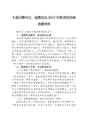 X县纪委书记、监委主任2023年度述职述德述廉报告现将本人2023年履职情况报告如下。一、加强政治建设,坚定政治立场坚持把学懂弄通做实XX作为首要政治任务,扎实开展XX,一体化推进理论学习、调查研究、推动发展、检视整改工作,纪委常委会组织开展集中学习XX次,围绕坚定理想信念等主题开展交流研讨XX次,开展调查研究XX天XX次,检视专项整治问题XX个,已全部整改完毕。严格落实第一议题制度,主持召开县纪委常委会会议和理论中心组学习会议XX次,及时跟进学习领悟XXXXXX重要讲话和重要指示批示精神,将学习成果转化为贯彻落实具体措施,不断增强坚定两个维护的思想自觉和行动自觉。二、围绕中心工作,主动担当作为(一)聚焦两个维护,强化政治监督制定政治监督重点任务清单,细化具体举措XX项。围绕经济要稳住要求,靠前监督护航经济高质量发展。赴开发区开展X轮调研式监督,形成调研报告和政治监督清单,室组联动开展专项督查X次,发现并督促问题整改X个。围绕发展要安全要求,跟进监督重大风险防范化解。以安全生产隐患排查和自建房屋安全专项整治为监督重点,成立X个督导组开展X轮督导,发现问题X个。监督推动突出生态环境问题整改销号,督促责任单位完成整改X个。(二)坚持激浊扬清,驰而不息纠治四风持续加固中央八项规定堤坝。紧盯传统节日等关键节点,严肃查处违规公款吃喝、违规公务用车、违规收送礼品礼金等问题,全年共查处享乐主义、奢靡之风问题X起X人,处分X人,通报曝光典型案例X起X人。开展酒驾醉驾及背后四风问题整治,处置相关问题线索X件,立案X件,处分X人。切实推动改进工作作风。协助县委出台进一步改进作风的具体措施X条,每季度制定改作风专项监督清单,围绕XX个方面XX项监督重点开展明察暗访X次,发现X大类X个问题,组织处理X人,取消年度评先评优资格X人。紧盯作风顽疾,查处形式主义、官僚主义问题X起X人,诫勉X人。监督推动优化营商环境。制定政商交往正负面清单,明确X项X条监督优化营商环境具体举措,推动构建亲清新型政商关系。跟进监督新春访万企、打通肠梗阻优环境、促发展活动交办问题整改销号,办结涉及破坏营商环境信访举报件X起,查处涉企破坏营商环境风腐一体问题X起X人,处分X人,组织处理X人。(三)坚持系统施治,一体推进三不腐持续保持高压态势。全县各级纪检监察组织共处置问题线索X件,立案X件,处分X人,留置X人,移送检察机关X人。建立行贿人信息库,梳理XX以来行贿人信息X条。严肃查处矿产资源领域和涉砂监管领域腐败问题,分别处分X人和X人;深入推进粮食购销领域腐败问题专项整治,处分X人,问责处理X人,挽回经济损失X万元。推深做实以案促改。围绕重点领域廉政风险点防控开展专题调研,制发XX、XX严重违纪违法案件及其教训警示的通报,指导县XX局党委和县XX局党组分别召开专题民主生活会和警示教育大会,并将有关情况及时向县级分管领导通报,压紧压实管党治党一岗双责。出台进一步规范纪检监察建议工作办法,制发纪检监察建议书X份,督促X个责任单位整改问题X个,推动建章立制X个。深化拓展警示教育。加强新时代廉洁文化建设,围绕XX史实,联合XX启动建设XX党风廉政教育基地。用身边事教育身边人,组织拍摄市XX局原XX严重违法案件专题警示教育片,以县XX处原工作人员XX严重违纪违法案件为蓝本拍摄微电影XX,组织职务犯罪案件庭审旁听活动X场。(四)坚持以巡促治,发挥巡察利剑作用稳步推进X届县委巡察。完成五届县委第X轮、第X轮巡察,共巡察XX个县直单位党组织和XX个镇街道,延伸巡察XX个村(社区),发现各类问题XX个,移交问题线索XX件第四轮对XX个镇街道及所辖XX个村(社区)和XX个县直单位党组织的驻点巡察已结束。扎实做好巡察后半篇文章。制定《加强巡视巡察整改和成果运用实施细则》,对五届县委第一轮、第二轮巡察的XX个党组织整改情况开展成效评估。督促被巡察党组织制定整改措施XX条,修订完善制度XX个,清退违规违纪资金XX万余元,挽回经济损失近XX万元。健全完善巡察监督体系。协同纪检、组织、宣传等职能部门开展联合督查、会商XX次,形成监督合力。加强巡审协作,开展巡审联动,提高巡察质效。发挥巡察立行立改优势,根据信访举报问题确定立行立改事项X件并有效推动解决。(五)坚持人民至上,深入整治群众身边腐败和不正之风深化民生领域正风反腐。深入开展群众身边腐败和作风问题1+N专项整治,细化具体举措XX项,联动开展监督检查XX次,发现问题XX个,追缴惠民惠农补贴资金XX万元。全年共查处群众身边腐败和作风问题XX起XX人,处分XX人,组织处理X人。积极推动信访举报化解。持续开展重复举报专项治理,及时办结省、市纪委筛选的X件重复举报件,全年接收信访举报和重复