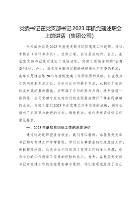 党委书记在党支部书记2023年抓党建述职会上的讲话(集团公司)今天的会议是2023年度党支部书记抓党建工作述职、评议、考核会(书评考会议),总体上看,会议是成功的。会上,基层党支部书记先后进行了现场述职,实现了现场述职的"全覆盖"目标。会上,每名党支部书记都能够按照公司党委的要求,实事求是地总结2023年度抓党建工作所取得的成绩,并查找存在的问题和不足之处,并针对这些问题和不足,也制定了相应切实有效的整改措施,并明确了今后的努力方向。特别值得一提的是,公司党建专家也对你们的述职报告进行了精彩而准确的点评,肯定了你们2023年在党建工作中取得的成绩,同时也指出了后期努力改进的方向。借此机会,我代表党委讲讲工作意见要求。一、2023年基层党组织工作的总体评价通过这次述职报告考核会,我们可以看到,各基层党支部书记都对党建工作非常重视,你们以实事求是的态度总结工作,积极整改问题。这次会议不仅促进了党建工作的深入开展,也为今后的工作提供了宝贵的经验和启示。首先,各基层党支部书记对党建工作的总结是实事求是的,你们客观地总结了自己在2023年度所取得的成绩,也坦诚地查找了存在的问题和不足这种实事求是的态度为今后的工作奠定了坚实的基础。在总结中,你们不仅突出了工作中的亮点和成就,还深入分析了存在的问题和原因,为下一步的工作指明了方向。这种务实的态度和深入的思考,体现了各位书记对党建工作的责任心和对党的忠诚。其次,你们对问题和不足的整改措施是具体而有效的。针对自己所存在的问题,制定了切实可行的整改方案,并明确了今后的努力方向。你们充分调动了党员干部的积极性,通过加强培训和学习,提高了党员干部的思想认识和工作能力。同时,你们还加强了组织建设,完善了工作机制,确保了党建工作的有效推进。这种积极主动的态度将为党建工作的改进和提升提供有力的支持,为事业发展注入了新的活力。最后,党建专家对各党支部的点评是公正而明确的。专家们既肯定了各党支部在党建工作中取得的成绩,也毫不回避地指出了存在的问题和不足。这种公正的评价将为各党支部提供了明确的工作方向,也激励着大家在今后的工作中更加努力。二、2023年基层党组织工作存在的主要问题通过这次述职报告考核会,我们可以看到,各基层党支部书记都对自身存在的问题进行了梳理和查摆。不同的党支部书记查摆的问题数量各不相同,有些党支部书记查摆了x-x个问题,有些党支部书记查摆了x-x个问题,但不管问题的数量多少,都反映了党支部书记们敢于进行自我革命,勇于刀刃向内的精神。这种精神是我们党员干部应当具备的重要品质。总结大家提出的问题,可以发现基本上都反映了公司党委和党支部在一定程度上存在着共性问题。这些问题的存在不仅影响了党支部的正常运作,也对公司的发展产生了一定的不利影响。我们必须正视这些问题,采取有效措施予以解决,以进一步推动党建工作的深入开展。首先,一些党支部书记普遍反映存在组织管理不严格的问题。在党支部组织生活会上,党员参与度不高,党费缴纳不及时,党员发展工作不力等情况普遍存在。这些问题的存在导致党支部的凝聚力和战斗力不足,影响了党组织的活力和战斗堡垒作用。因此,我们需要加强组织管理,提高党组织的凝聚力和战斗力,确保党支部的正常运转。其次,一些党支部书记指出存在着党员教育培训工作不到位的问题。党员的思想政治素质和业务能力是党组织的重要标志,但目前存在一些党员对党的理论知识掌握不够扎实,对党的政策和决策不够了解,对党的工作任务和要求不够清晰等情况。这对于我们党支部的建设和发展是一个重要的障碍。因此,我们要加强对党员的教育培训,提高党员的思想政治素质和业务能力,使党员成为公司发展的中坚力量。另外,一些党支部书记还提到了党风廉政建设方面存在的问题。一些党员在工作中存在懒散浮躁、消极怠工等现象,一些党支部书记在党风廉政建设方面的领导责任不够到位,对违纪违规行为的查处力度不够。这些问题的存在严重影响了党组织的形象和威信,也对公司的发展造成了不良影响。因此,我们要强化党风廉政建设,加强对党员的教育引导,坚决查处违纪违规行为,营造风清气正的工作环境。最后,一些党支部书记还反映了基层工作与公司业务工作脱节的问题。一些党支部在开展工作时缺乏与公司业务工作的紧密结合,没有将党建工作融入到公司的日常经营管理中去。这导致工作与公司业务工作相互独立,没有形成良性互动和相互促进的局面。因此,我们要加强工作与公司业务工作的对接,将党建工作与公司的发展目标相统一,以促进业务发展,以业务推动工作。通过这次述职报告考核会,我们对党支部书记们查摆问题的勇气和决心表示赞赏,同时也看到了公司党委和党支部存在的共性问题。我们必须高度重视这些问题,采取切实有效的措施加以解决,以推动工作的深入开展,为公司的发展提供有力的组织保障和精神支持。三、2024年基层党组织工作提升