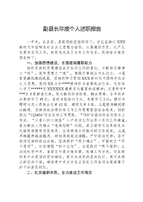 副县长年度个人述职报告一年来,在县委、县政府的坚强领导下,自己坚持以XXX新时代中国特色社会主义思想为指导,认真履职尽责,从严从实落实各项工作,较好地完成了全年工作任务。现将有关情况报告如下。一、加强思想建设,全面提高履职能力始终坚持把思想建设放在各项工作的首位,不断补足精神之钙,筑牢思想之魂,增强干事创业内生动力。一是自觉强化理论武装。坚持把学习贯彻XXX新时代中国特色社会主义思想、党的XX大和*精神作为首要政治任务。先后深入学习及XXXXXX最新系列重要讲话精神;反复研学*及专家解读文章,努力做到学深悟透、融会贯通。全年共参加集体学习45次,省级专题培训2次、考察学习2次;撰写专题研讨及心得体会文章12篇、调研文章5篇。二是努力做到学以致用。坚持将政治理论学习与工作需要紧密结合起来,创新提出123456农业农村工作思路、755全面消除直饮窖水工作法、六看六问六核查入户走访工作法等一系列工作措施,着力解决人民群众急难愁盼问题,真正将学习成果转化为巩固拓展脱贫攻坚成果、全面推进乡村振兴的工作成效。三是不断提升政治能力。时刻保持政治清醒,严守政治纪律,坚守绝对忠诚的政治品格,坚决拥护两个确立,牢固树立四个意识、切实增强四个自信、自觉践行两个维护;主动对标党中央、省委及市委决策部署,校准工作方向,切实做到党中央提倡的坚决响应,党中央决定的坚决执行,党中央禁止的坚决不做,确保党中央关于农业农村工作各项决策部署不折不扣落实到位。二、扎实履职尽责,全力推进工作落实紧紧围绕县委、县政府既定工作任务,以奋发有为的精神状态和时时放心不下的责任意识推动各项工作扎实落实。一是脱贫攻坚成果持续巩固。制定出台住房、医疗、就业、驻村帮扶、动态监测帮扶等巩固衔接方面文件46个,落实财政衔接资金30397万元,先后危房改造265户、建设宜居型示范农房116户、建成公有产权标准化卫生室154个、大病救助6504人、向27280名脱贫学生发放资助金1383万元,有力巩固拓展脱贫攻坚成果。二是全面推进乡村振兴。扎实开展*行动,整合涉农资金3.4亿元,建设示范村100个,建设宜居性、康养型、旅游型村庄各20个,实施重点项目272个,硬化村组道路142条119.95公里,改厕4772座,庭院经济栽植樱桃树苗2万株,桃树苗3.5万株;切实通过以点带面、示范引领,稳步推进全县乡村振兴。三是全力保障粮食安全。制定出台粮食生产、蔬菜生产、促进农村土地承包经营权流转大力发展粮食生产奖励等一揽子扶持政策,兑付各类补贴1528.47万元,建成高标准农田6.9万亩,复垦撂荒地8000亩;完成粮食种植52.15万亩、产量12.28万吨,其中,大豆带状复合种植4.03万亩、建成省级核心示范区1个、市级示范区5个,牢牢守住粮食安全底线。四是推动产业提质增效。扶持培育市级龙头企业、市级家庭农场、市级农民专业合作社、市级现代农业园区8家,新增经营主体47家;成功创建国家级核桃产业示范园区和省级现代农业产业园,洛南核桃品牌价值达到30.68亿元;启动发布洛味缘区域农产品公用品牌,授权使用产品60余个;六大特色产业规模、效益和品质进一步提升。今年共嫁接改造红仁核桃1万亩,发展烤烟7万亩、食用菌4050万袋、中药材5.8万亩、蔬菜7.53万亩,畜禽出栏362.2万头(只)。五是竭力保障饮水安全。全县消除直饮水窖38个村1924眼,建成供水工程130余处,安装管网350.2公里,配套水泵650台,净水器设备628台,配发消毒药品2万瓶,巩固提升9.2万人安全饮水保障水平;并加快推进城乡供水一体化,敷设配水管网19.3公里,有效解决景村6个移民安置点及兑山坡周边1.2万人饮水问题。六是大力实施重点项目。先后建成西北核桃物流园、岭南食用菌二期深加工、烤烟产业综合提升、农产品仓储冷链设施建设等基础设施补短及延链补链项目15个;完成县河综合治理、河道清淤疏浚、梁塬水厂水网改扩建、乡村振兴农村基础设施建设等重点民生项目10个,实施洛惠渠改线、第二水厂等利长远项目4个,切实保障和改善民生,促进六大产业大力发展。七是加大森林资源管护。全年营造林9.7万亩,黄龙河流域绿化38公里,森林面积持续增加;深入开展松材线虫病防治,累计清理病死枯死木近7万株、喷药防治约16万亩,疫点、疫区具备拔出条件,防治取得显著成效;严厉查处秦岭五乱案件33起,整改森林防火隐患132处,重特大森林火灾得到全力遏制,森林资源安全得到有效保障。八是持续改善生态环境。坚决贯彻XXX生态文明思想,积极开展五美庭院创建四美村居打造清洁村庄·爱我家园百日攻坚行动,全县累计投入资金1500余万元,清理农村生活垃圾4820吨、水塘800口、沟渠6400余公里、
