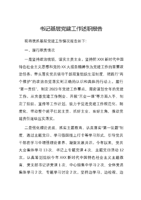 书记基层党建工作述职报告现将我抓基层党建工作情况报告如下:一、履行职责情况一是坚持政治统领,谋实主责主业。坚持把XXX新时代中国特色社会主义思想和党的XX大报告精神作为党建工作的首要政治任务。带头落实党员领导干部双重组织生活制度,把践行两个维护的政治自觉落实到正确的认识和具体的行动上。履行第一责任,制定2023年党建工作要点,周密谋划全年的党建工作。从完善党建工作例会、开展三会一课等方面入手,制定了组织、宣传等工作计划,致力于促进党建工作规范化、制度化,带动整个班子扛起主责、抓好主业、当好主角,推动党建责任逐级压实落实。二是强化理论武装,抓实主题教育。认真落实第一议题制度,通过主题党日、学习强国线上打卡等学习形式,引导党员干部在学习中增强理论素养、凝聚发展共识。今年以来,党员大会集体学习13次,书记上专题党课4次,主题党日活动12次。认真筹划组织今年XXX新时代中国特色社会主义主题教育,党支部书记讲党课1次,中心组集中学习2次,全体党员集体学习2次,专题学习讨论2次。坚持边学习、边检视、边整改,紧盯群众反映强烈的增量问题及巡视巡察未完成整改的存量问题,结合工作实际,系统梳理分析形成整改问题清单,发现问题3条,制定整改措施11条。三是严肃政治生活,坚定理想信念。支部严格按照《关于新形势下党内政治生活的若干准则》的要求,自觉把讲政治贯穿于党性锻炼和业务工作的全过程,全面落实三会一课、民主评议党员、谈心谈话等制度,认真召开专题民主生活会和组织生活会,查找在理想信念、工作作风、担当作风等方面的问题,制定措施进行整改落实,增强党组织的战斗力凝聚力。强化党支部廉洁教育,通过集中学习、典型案例教育、参观警示教育示范基地等方式,使党员思想受洗礼,政治站位不断提高。四是聚焦重点工作,提升业务实效。立足县域发展特色金融。加强制度激励,明确攻坚目标,高标确定全年信贷投放增速保持*%以上、贷款增量力争突破*亿的信贷目标,聚焦重大战略实施和中小微企业纾困两个方面,分解目标任务,加强考核激励,激发各金融机构支持企业发展积极性。金融管家试点工作与双碳智谷绿色产业一体化推进,全市*支金融辅导队进驻*双碳智谷,对园区内核电、海上风电、核能供暖、航空航天、水利等*个绿色产业项目进行一对一定向金融辅导,引导信贷资金优先支持绿色领域项目建设,1-10月核电、风电项目净增投放*亿元。聚焦实体优化金融服务。积极扩大金融辅导覆盖面,为我市有资金需求的高新技术企业匹配辅导队,目前,已满足*家企业*亿元的融资需求。开展十百千万金融机构高管走基层活动,由各银行机构高管持续带领金融辅导队实地走访民营企业和重点项目,围绕企业生产经营中遇到的困难、问题及企业发展诉求,向企业精准推送、解读政策。目前已完成全市*家民营企业和*个重点项目的走访工作,解决*家企业贷款*亿元,*个项目贷款*亿元。强化监管防控金融风险。推进各银行不良贷款处置,督导各银行机构加大不良资产化解处置工作的同时,严控新增不良。特别是对地方法人银行对不良信贷逐笔落实风险责任人,制定处置化解方案,建立工作台账。截止*月末,全市不良贷款余额*亿元,较年初下降*万元;不良贷款率*%,较年初下降*个百分点,全年共计处置不良贷款*万元;其中*月当月处置不良*万元。二、存在的主要问题(一)政治建设不够有力。党内生活的生机活力尚未充分激活,没有让全体党员完全形成自觉、主动、常态的学习习惯,在学习XXX新时代中国特色社会主义思想方面还不够深入。(二)服务型党组织建设有待强化。不能及时掌握当前社会发展的新动态、新特点、新理念,联系服务群众机制有待完善,服务方式不够多样,服务群众水平还有待提高。(三)党员队伍建设还需加强。支部战斗堡垒作用发挥还不够明显,部分党员积极性调动不够,还没能形成一套行之有效的激励措施。三、下一步工作打算(一)强化思想理论学习。把学习贯彻党最新理论成果作为支部学习的重要政治任务,坚持原原本本学、全面系统学,定期召开精神学习研讨会,通过开展专题党课、交流研讨、实地观摩等形式多样、内容丰富的活动,不断提高理论教育学习的质量,引导党员把思想和行动统一到党中央指示精神上来。(二)提高支部工作质量。重点围绕支部建设、组织生活、作用发挥等三个方面推进标准化规范化建设,把建设政治功能强、支部班子强、党员队伍强、作用发挥强的党支部作为建设标准。严格落实三会一课、组织生活会、谈心谈话、民主评议党员等党的组织生活基本制度,将党组织活动更好地融入中心工作、融入党员需求、融入群众关切。(三)创新服务企业方式。深入基层调研,研究、分析新形势下涌现的新矛盾、新问题,掌握企业和群众最迫切的需求、最急需解决的问题,增强服务实体经济的能力和水平,让企业更好地享受政策红利,享受金融创新成果。(四)强化