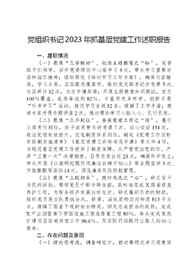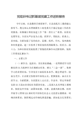 党组织书记抓基层党建工作述职报告 今年以来,在县委的正确领导下,在县直机关工委的精心指导下,我支部认真贯彻落实上级党委关于基层党建工作的各项要求,积极履行基层党建工作第一责任人职责,以落实党要管党、全面从严治党为主线,抓班子、带队伍,抓重点、求突破,全面加强了党的政治、思想、组织、作风、党风廉政和制度建设,进一步提升了基层党组织的凝聚力、组织力、战斗力,为单位持续发展提供了坚强组织和作风纪律保障。现将工作情况汇报如下:一、主要工作(一)抓学习、促落实,夯实理论基础。一是坚持把学习贯彻党的XX大精神作为首要政治任务,纳入三会一课、集体学习的重要内容,引导党员干部原原本本学、融会贯通学、创新方式学,在读原文悟原理中深化认识、把握要求,真正在全面学习、全面把握、全面落实上走在前、作表率,坚定不移把党的XX大提出的目标任务落到实处。二是深入扎实开展主题教育。按照党中央统一部署和省委、市委、县委具体安排,组织开展学习贯彻XXX新时代中国特色社会主义思想主题教育,明确具体要求,按照规定动作细化推进措施,抓好重点任务落实,营造浓厚学习氛围。三是严肃政治要求,严格执行《领导干部民主生活会若干规定》,坚持落实民主生活会、领导干部双重生活会等制度要求,坚决贯彻民主集中制和集体领导原则,健全完善三重一大等决策规则,坚持科学决策、民主决策、依法决策。(二)抓党务,打基础,加强自身建设。一是落实支部工作制度。认真落实三会一课制度,结合党员积分制管理制度,保证每名党员始终处于党组织的管理教育之中。同时,为巩固学习内容、检验学习效果,党支部不定期开展学习测试活动。目前,党员大会已经召开*次,支委会召开*次,党员干部讲党课*次,学习测试*次,组织交流发言*次,开展主题党日活动*次。同时,认真落党费收缴制度,明确专人党费收缴,党员自觉、按时、足额交纳党费。二是抓好离退休干部党的建设。制定《支部离退休党员主题教育一对一帮扶安排表》,组织在职党员一对一帮扶离退休党员学习宣传XXX新时代中国特色社会主义思想和党的XX大精神,积极引导离退休党员深入开展主题教育,坚持读原著、学原文、悟原理,重点在全面学习、全面把握、全面落实上下功夫严明政治纪律和政治规矩,始终做到听党话、感党恩、跟党走。三是发挥战斗堡垒作用。强化党支部凝聚力和向心力建设,强化与社区共建,年初,每名党员签订在职党员承诺书,向新建路社区报道,积极参加社区开展的公益活动。在今年的慈善一日捐等活动中,支部党员干部始终走在前、作表率,支部的凝聚力和号召力得以充分体现。四是深入贯彻选人用人机制。坚决贯彻执行《党政领导干部选拔任用工作条例》和鼓励激励、容错纠错、能上能下三项机制,树立正确的选人用人导向,年内推荐提拔行政副科级领导*名,极大地提高了干部干事创业积极性,通过全市事业单位招考招录事业干部*名,为干部队伍充实了新鲜血液。五是创建四优模范机关。制定了《四优模范机关创建工作实施方案》以及责任清单任务分解表。持续抓好党组织硬件和软件建设,对支部阵地标准化建设。紧抓党员干部教育培训,强化思想淬炼、政治历练、实践锻炼和自我锤炼,教育引导党员干部严以修身、严以用权、严以律已,不断提高政治判断力、领悟力、执行力。围绕单位中心工作加强教育培训,不断提升学习实效,全面提升党员干部八项本领七种能力。(三)抓警示、重预防,营造清廉生态。一是积极学习贯彻党内法规。今年以来,采取个人自学与集体学习相结合方式,认真学习中国共产党《廉洁自律准则》《党内监督条例》和《关于新形势下党内政治生活的若干准则》等党内法规,从思想深处增强了落实党章、贯彻党规、执行党纪的自觉性和主动性。二是组织开展廉政主题活动,把廉政教育列入全年学习计划,提高了党员干部自警自省意识。严格执行全面从严治党主体责任和监督责任及党风廉政建设责任制,督促落实一岗双责,管好职责范围内党风廉政工作,认真执行党支部各项决策部署。全年共开展廉政主题活动*次,强化岗位廉政教育、示范教育,不断提高党风廉政教育的针对性,进一步筑牢党员领导干部拒腐防变思想防线。二、存在问题今年,党支部各项工作取得了较好的成效,但对照中央、省、市有关规定和要求及基层群众期望,仍然存在差距与不足。一是领导重视、要求严格,但围绕业务抓党建的意识不强、主动性不够。二是党员教育还有待提升。今年虽然开展了多种形式的理论学习,很大程度上促进了党员干部理论水平提高,但由于形式较为单一,注重集中学习和培训,内容枯燥缺乏趣味性和灵活性,降低了组织生活的吸引力。产生问题的原因:一是存在重业务轻党建。由于党务干部都是兼职,导致责任心不稳定,党务知识、工作能力不足重完成任务轻日常工作的问题;二是党员干部培训形式较单一,对党员自觉学习、自觉工作、自觉履行义务督促多,跟踪落实少。三、2024年度书记抓