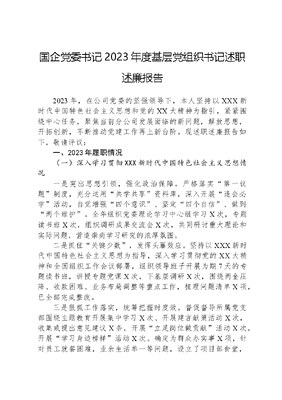 国企党委书记2023年度基层党组织书记述职述廉报告2023年,在公司党委的坚强领导下,本人坚持以XXX新时代中国特色社会主义思想和党的XX大精神为指引,紧紧围绕中心任务,聚焦当前分公司发展面临的新问题,解放思想,开拓创新,不断推动党建工作再上新台阶。现述职述廉报告如下,敬请评议:一、2023年履职情况(一)深入学习贯彻XXX新时代中国特色社会主义思想情况一是突出思想引领,强化政治保障。严格落实第一议题制度,充分运用共学共享资料库,深入开展逢会必学活动,自觉增强四个意识、坚定四个自信、做到两个维护。全年组织党委理论学习中心组学习X次,专题读书班X次,组织调研成果交流会X次,共同研讨重大理论和实际问题,营造崇尚学习研究的浓厚氛围。二是抓住关键少数,发挥头雁效应。坚持以XXX新时代中国特色社会主义思想为指导,深入学习贯彻党的XX大精神和全国组织工作会议部署,组织领导班子开展为期7天的专题读书班,讲授专题党课X次,下基层调研X次,围绕两金压降、收款困难、业务布局调整等重点工作,梳理问题清单X项,已全部完成整改。三是狠抓工作落实,统筹把握时度效。督促督导所属党支部围绕主题教育开展集中学习X次、开展建言献策活动X次,收集或提出意见建议X条,开展立足岗位做贡献活动X次,开展学习身边榜样活动X次。确定为群众办实事X项,针对员工就餐困难,业余生活单一等问题,设立了项目部食堂,配置微波炉,改善就餐条件,购置体育器材,丰富员工业余生活,提升员工幸福感。(二)深化落实全国国有企业党的建设工作会议精神情况一是加强领导班子建设。围绕X、X管理中出现的质量、安全、节点保障等问题,成立工作专班,统筹组织班子成员分工协作,驻场指导,不断增强领导班子破解难题,防范风险能力。二是调整业务布局。根据公司战略发展要求及分公司业务调整升级,完成了分公司组织机构调整和优化,成立了市场开发部,撤销X部,成立X部,推动形成以新能源业务、高端机电设备安装和传统机电安装为主的新业务布局。三是加强人才队伍建设。以竞争性晋升为抓手,激发人才队伍活力,完成X名中层干部公开竞聘工作。成立BIM小组,通过以赛促练,BIM技术水平不断提升,多次获得秦汉杯唐都杯上海建筑业协会一等奖等奖项,目前已为安装多个项目进行建模,并取得了良好实效。搭建素质提升平台,承办公司X技能竞赛,选拔出3名优秀选手代表公司参加省X比赛。四是实施人才梯队培养。深入分析人力资源现状,针对仪控仪表、光伏等专业紧缺人才,加大引才力度,全年共引进各类人才X人。选派X人参加公司第二期青年干部培训,X人参加项目管理能力提升,X人前往X专业化公司学习X项目全周期管理经验,为全面进军X域储备专业技术力量。(三)积极服务国之大者,有效发挥基层党组织和党员作用情况一是落实使命任务。贯彻落实公司重要决策部署,积极组织调配人员,成立专项组织机构,从技术、人员、后勤保障等方面全力配合公司开展X取证工作。二是围绕中心,服务大局。以揭榜挂帅、一区域一特色党建品牌提升、书记直通车为抓手,围绕自主任务开发、重点项目节点进度、完工项目久拖未结等制约发展的重点工作,结合考核反馈、查摆评议等问题整改,制定重点行动项X项,通过定期跟踪问效,亲自深入一线驻场指导,X项行动项已全部完成。三是自主市场开发再创新高。积极推进自主任务开发,全年自主市场开发累计完成项目跟踪立项X次、投标X项,中标X项,(其中X工程中标金额X万元),完成新签合同X万元,完成年度目标值的X%,自主开发新签合同额较上一年增幅X%。四是新能源业务发展稳步提升。详细分析公司十四五发展规划中关于新能源行业政策解读,与X、X签订了河X项目合作协议,实现了公司合同额亿元以上X项目市场拓展首个突破。五是质量安全工作常抓不懈。持续开展质量精细化提升行动、X融合工作及落实样板引路制度,深入开展QC活动、推广先进经验和方法,全年获得国家级QC三等奖X项,省优秀QC小组一等奖X项,二等奖X项,三等奖X项。设立党员监督岗党员安全人,提升全员安全意识,通过织网检查、四不两直检查等形式开展了受限空间作业、高处作业、临时用电等专项检查X场次,安全环保主体责任得到有效落实。六是科技创新释放活力。年度科研攻关取得实效,省部级工法上报X项;发明专利受理X项;产学研合作X项;行业标准参编X项;内部科技成果转化X项,外部成果转化X项。参与X研发课题X的编制和审核工作。七是做好文化引领成果转化。开展沟通零距离员工代表恳谈会,解决员工关切问题60项;通过企业文化考试、讲授企业文化课、开展实践试点等活动,促进企业文化入脑入心,将企业文化转化为推动实践工作的强大动力。(四)推进基层党建重点任务落实落地情况一是压实党建责任。与4个党支部签订《党建工作目标责任书》