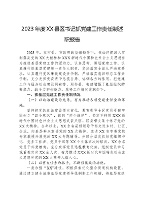2023年度XX县区书记抓党建工作责任制述职报告2023年,在市委、市政府的坚强领导下,我始终把深入贯彻落实党的XX大精神和XXX新时代中国特色社会主义思想作为推进基层党建工作的源动力,认真思考、谋划党建工作,认真履行抓基层党建第一责任人职责,坚决落实全面从严治党要求,认真履行党风廉政建设责任制,严格落实意识形态工作责任制,充分发挥党委班子总揽全局、协调各方的作用,把党建工作与经济社会建设同安排、同部署,有效增强了基层组织的凝聚力、战斗力和创造力。现将工作情况述职如下。一、抓基层党建工作责任制情况(一)以政治建设为先导,有力推动各项党建责任全面落地。坚持把党的政治建设摆在首位,教育引导全区党员干部牢固树立四个意识,做到两个维护,坚定不移用XXX新时代中国特色社会主义思想武装头脑。区委带头集中学习党的XX大精神,全年以来,XX余名县级领导干部走进乡村、社区、企业,向基层群众宣讲党的XX大精神,邀请XX名市委党校专家教授开展党的XX大专题辅导。分级分层次抓好党组织书记、党务工作者、党员干部等XX个主体班次的培训,XX余名党员干部受教育。充分发挥党员远程教育优势,组织党员学习观看教育片XX余人次,有力推动XXX新时代中国特色社会主义思想和党的XX大精神入脑入心。(二)以重大任务为抓手,不断强化政治功能。一是加强XX建设。积极探索优化整合街道机构设置,通过建立健全城市基层党建领导体制和工作机制,将基层党组织建设成为领导基层治理的坚强战斗堡垒,实现支部建在网格上,党建工作对网格的全覆盖,真正使党的政治优势、组织优势转化为基层治理优势。二是把扫黑除恶专项斗争与加强基层组织建设结合起来。对全区XX个社区XX名两委成员开展专项集中排查,从源头上铲除黑恶势力滋生的土壤。三是以基层党建引领脱贫攻坚战。选优配强XX名贫困村第一书记,组建XX支驻村工作队扎实开展扶贫攻坚,选出XX名致富带头人为贫困村党支部书记。大力推广党支部+合作社+农户新模式,推动贫困户增产增收,为实现脱贫攻坚目标提供坚强组织保障。(三)以落实整改为手段,优化基层党建工作。区委高度重视中央巡视组发现的有关基层党建方面的问题,召开专题常委会进行研究讨论,严肃整改。制定XX区《基层党建问题整改专项行动方案》《关于进一步规范党支部组织生活的通知》《XX区基层党建强力计划实施方案要求》等文件,认真执行,严肃整改。安排全区各单位围绕主题教育开展以来本单位活动开展情况进行自查,取得了良好的整改效果。(四)以基层建设为基础,不断提升基本能力。坚持把抓基层强基础作为长远之计和固本之举,统筹推进各领域基层党组织建设。一是扎实开展社区两委换届选举。选出XX名党支部书记,建立XX名优秀青年组成的村级后备干部队伍库。二是严格落实驻村第一书记专项工作经费和专项扶贫经费。按照五个统一标准,完成对XX等XX个社区活动场所升级改造,高标准建设的XX社区党群服务中心已完工。基层党建经费和服务群众经费按时足额拨付,社区两委成员工作报酬和社会保险已按要求执行到位。三是进一步推进非公企业和社会组织两个覆盖。达到应建尽建标准的两新组织已全部建立党组织,2023年先后有XX名年轻职工向党组织递交了入党申请书,发展预备党员XX名。四是在中心工作中充分发挥党组织作用。在全区所有的重点项目指挥部建立XX个临时党组织,推动XX余名党员干部在一线开展组织活动,发挥先锋模范作用。(五)以问题为导向,严肃党内政治生活。严格执行新形势下党内政治生活若干准则,落实好民主生活会、组织生活会、领导干部双重组织生活和民主评议党员等制度,抓严抓实机关党员干部学习教育,严防机关党建灯下黑。今年以来,基层党组织党内政治生活进一步规范,党员干部的党性修养和政治素养得到有力增强。(六)严格落实主体责任,提高党建工作领导力。一是区委带头落实责任。围绕基层党建强力计划,定期召开常委会和党建领导小组会,专题研究、经常调度、强力推进。明确常委各自分管领域的管党治党责任,做到知责明责、带头履责,推动各项党建责任全面落地生根。二是一级一级传导责任。严格落实党组织书记抓党建的第一责任人责任,坚持书记抓、抓书记,逐级制定党建工作责任清单,层层签订党建目标责任书,形成上下贯通、层层负责的党建责任链条。进一步增强各级党组织书记抓主责主业的责任意识和压力动力,形成大抓基层党建的良好局面。二、履行党风廉政建设责任制情况(一)履行第一责任人职责情况。作为区委书记,我始终把落实党风廉政建设责任制作为龙头工程来抓,区委把党风廉政建设责任制落实纳入重要议事日程,将其纳入全区工作总体规划。本人经常听取党风廉政建设方面的汇报,坚持做到四个亲自,在XX区XX周边环境综合整治工作中,针对XX环保督察组下达的督办通知书,亲自部署、亲自协