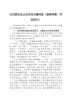 在纪委全会上的述责述廉报告(县委常委、统战部长)按照会议安排,现将个人履行全面从严治党主体责任和廉洁从政情况报告如下。一、坚定把政治建设放在首位,沿着必由之路踔厉奋进政治建设是党的根本性建设,决定着党的建设方向和战果只有将旗帜鲜明讲政治全面融入各项工作,才能助推各项事业发展蹄疾步稳迈入新境界。(一)铸魂固本、淬炼政治品格。在提升政治判断力上下功夫,坚持以XXX新时代中国特色社会主义思想为指导,衷心拥护两个确立、忠诚践行两个维护;在提升政治领悟力上求突破,深刻学习领悟县委X思路,始终做到立场坚定、头脑清醒、眼睛明亮;在提升政治执行力上做示范,始终做到思想上坚定追随、情感上真诚拥戴、行动上步步紧跟,始终做政治上的明白人老实人。(二)深学细研、提升理论修养。一年来,本人始终坚持把理论学习作为增强党员党性、干好本职工作、提升拒腐防变能力的重要抓手,坚持解放思想、开拓创新,注重运用新思想、新理论来武装头脑、指导实践、推动工作。坚持集体学习和个人自学相结合,认真学习XXXXXX关于做好新时代党的统一战线工作的重要思想、《中国共产党统一战线工作条例》及我省实施细则等,不断提升履职尽责的能力水平,进一步找准工作落实着力点。2023年,开展理论中心组学习和专题研讨X次。(三)围绕主题、抓实廉政教育。紧密围绕全面从严治党和全县重大决策部署,以党章党纪党规为遵循,组织动员全县各民主党派、无党派人士和党外知识分子、新的社会阶层人士开展主题教育,带头讲党课、举办X,营造浓厚的学习氛围。逢会必讲党风廉政建设和反腐败形势、作风建设要求和廉政纪律规定,教育引导全县统战成员、分管联系单位(部门)干部职工树牢规矩意识、风险意识。二、坚定把主体责任贯穿始终,确保基础支撑稳如磐石严格落实一岗双责,坚持将党风廉政建设和反腐败工作与分管工作同研究、同部署、同推进、同落实、同考核。(一)不折不扣履行廉政监督责任。通过参加分管部门和联系镇党委班子民主生活会以及召开专题座谈会,听取指导年度重点工作和党风廉政建设工作。紧盯各级巡视巡察反馈问题,定期与X等分管部门和天仙镇主要负责同志、班子成员开展谈心谈话,向分管部门主要领导传导全面从严治党责任压力,要求各单位(部门)主要领导将党风廉政建设和反腐败工作纳入年度重要工作安排部署,制定党风廉政建设和反腐败任务清单,明确任务目标,推动工作落实。(二)求真务实守好意识形态阵地。严格落实意识形态工作责任制,抓好统战领域舆论宣传,指导统战成员X,定期组织研究党风廉政建设和意识形态工作,完善宗教领域X责任制,建立县委领导班子成员联系重点宗教活动场所及宗教界代表人士、县级领导干部联系宗教活动场所、县委统战部班子成员联系片区的三位一体宗教工作联系制度,促进宗教和顺、社会和谐。(三)敢作善为狠抓干部作风建设。以巡视巡察整改为契机,针对苗头性、倾向性问题,批评教育分管领域党员干部X人、提醒谈话X人,指导县委统战部修订完善机关内部管理制度X个,对作风之弊、行为之垢找准病灶、开好药方。扎实开展党外干部廉政教育,组织召开党外干部廉政建设专题会议、观看警示教育片、开展集体廉政教育,组织全县副科以上党外干部签订《廉洁自律承诺书》。三、坚定把严于律己抓在手中,营造风清气正政治生态作为一名党员干部,本人始终牢记党的政治纪律,守住底线、不越红线,时刻警钟长鸣,坚持讲政治、讲正气。严格执行换届工作纪律,坚持顾全大局,忠于职守,秉公用权,务求实效。(一)严格监督执纪守规。本人始终严守政治纪律和政治规矩,树牢正确的权力观、价值观,时刻牢记自己关键少数身份,认真执行三重一大集体决策等制度,及时、如实向组织汇报个人有关事项,带头以党员身份参与党组织生活,带头抵制官僚主义、形式主义,严格执行中央八项规定精神及其实施细则,和联系服务企业、项目建设单位保持亲清政商关系,自觉抵制码头文化圈子文化,从未有逾越纪法红线之举。(二)严守廉洁自律底线。始终坚持净化朋友圈、工作圈和生活圈,严格管好亲属和身边工作人员,本人及家属没有违规经商办企业行为,也从未利用职权和职务上的影响为亲属谋取非法利益;在生活中,本人能带头践行社会主义核心价值观,培养积极健康的生活情趣,向身边的亲属、同事传递正能量,自觉接受群众监督,始终做廉洁从政的表率。(三)严肃换届工作纪律。始终牢记党的政治纪律,坚定政治立场,深入贯彻执行党的路线方针政策,始终同党中央在思想上政治上行动上保持高度一致。认真落实X等工作责任,把严肃换届纪律贯穿始终,严把政治关、能力关、廉洁关,以有效监督和铁的纪律确保换届工作风清气正。