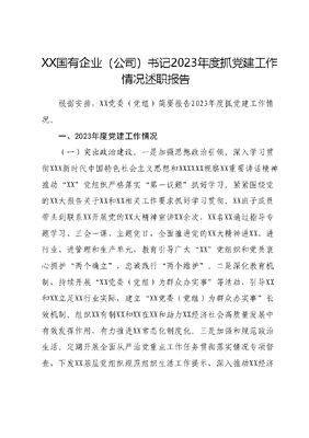 XX国有企业(公司)书记2023年度抓党建工作情况述职报告根据安排,XX党委(党组)简要报告2023年度抓党建工作情况。一、2023年度党建工作情况(一)突出政治建设。一是加强思想政治引领。深入学习贯彻XXX新时代中国特色社会主义思想和XXXXXX视察XX重要讲话精神推动XX党组织严格落实第一议题抓好学习。紧紧围绕党的XX大报告关于XX和XX相关工作要求抓好学习贯彻。XX班子成员带头到联系XX开展党的XX大精神宣讲XX余次,XX名XX通过指导专题学习、三会一课、主题党日,全面推进党的XX大精神进XX、进行业、进管理和生产单元,教育引导广大XX党组织和党员衷心拥护两个确立,忠诚践行两个维护。二是深化教育机制,持续开展XX党委(党组)为群众办实事等活动,引导XX和XX立足XX行业实际,建立XX党委(党组)为群众办实事长效机制。组织XX有制XX和XX在XX和助力XX经济社会高质量发展中有效发挥作用,有力推进XX常态化制度化。三是加强和规范政治生活。定期开展全面从严治党重点工作任务贯彻落实情况专项督查,下发XX基层党组织规范组织生活工作提示,深入推动XX经济组织和XX党组织开展党的XX大精神集中学习和党的XX大精神大学习大落实主题党日活动,督促指导XX和XX严格落实组织生活会、三会一课、主题党日等组织生活制度。(二)选优配强XX组织队伍。一是优化组织架构。调整充实XX名XXXX委员,设置XX名XX副书记,新增XX名专职副书记负责日常工作,调整选派XX名XXXX(其中XX名XXXX)结对指导XXXX和XX开展党建工作,同时,在镇(街道)设立XX党建指导办公室坚定不移理顺行业指导关系,深化XXXX统筹抓、基层党委(党XX)指导抓、行业主管部门联动抓、XX具体抓机制。二是强化队伍建设。开展XX和XX党组织书记、党务工作者教育培训,基层党委(党XX)对所辖XX和XX党员开展全覆盖培训,累计培训XX余人次。加大在XX组织出资人(负责人)、中层管理人员、专业技术人才、一线优秀职工和民办院校中发展党员力度,XX年XX领域发展党员XX(其中:XXXX名,XXXX名,民办高校X名)。三是强化统筹调度。建立以区工商联、区工信局、市场监管局、民政局等XX家单位为成员的联席会议制度。建立完善《中共XX区委XX和XX工作委员会议事规则》《XX区XX民营XX党建工作联系点制度》《XX区推动道路货运行业高质量发展和党的建设工作联席会议制度》等XX项制度。召开XX次联席会议研究部署XX和XX党建工作,引导XX经济组织和XX主动融入全区围绕XX主攻XX推动高质量发展大局。实行XXXX党建联络员每月上报工作开展情况、镇(街道)指导办每季度总结研究、区委党建办督促指导的XX党建联席指导调度机制,确保全区XX党建工作指导到位、责任落实到位。四是突出作用发挥。印制《XX区XXXX和XXXX工作手册》,细化工作责任清单,明确指导目标任务,确保指导工作有序推进XX指导XX党支部发挥红色引擎作用,以推进XX和XX党支部标准化规范化建设为主线,2023年完成了XX、XX两XX党支部创建。(三)推动各项工作任务落到实处。一是压紧压实工作责任印发《中共XX区委XX和XX工作委员会2023年工作要点》,建立完善履行全面从严治党主体责任、XX联席会议成员单位职责两个清单,发挥指挥棒作用,对上加强工作对接,对下强化政策设计,确保工作更新及时、完成及时、成效显著.二是对全区XX和XX开展摸底排查,对停产、注销的僵尸XX进行动态管理登记对新成立且有党员的规模XX进行摸排,完成了纳入台账管理的XX家XX和XX家XX党组织和党的工作全覆盖任务。三是深入推进XX民营XX党建示范引领行动。同时,加强实地调研和动态摸排,组织开展新就业群体调研,重点对美团饿了么外卖XX以及快递运输行业开展调研摸排,在条件较为成熟的美团XX建立了共青团组织,强化街道(社区)属地管理责任,推动党的建设工作横纵深入。(四)落实意识形态责任,加强党风廉政建设。坚持每半年对意识形态工作进行分析研判,将意识形态工作纳入全区2023年度XX和XX党建工作要点进行安排部署。XX通过三会一课、主题党日等方式加强党员职工党性教育,积极组织XX党员参观区党风廉政建设警示教育基地。引导XX经济人士正确理解党风廉政建设和反腐败工作的作用和意义,增强凝聚力。建立学习宣传教育、党员承诺等制度,对XXXX党员领导干部严格按照《党章》和党的纪律规范进行从严管理和约束。对一般党员,侧重加强思想政治工作,强化理想信念教育和宗旨意识教育,增强主人翁意识和全局意识,常态化落实XX书记跟XX委员谈心、XX委员与联系XX职工谈心的制度,扎实推动全面从严治党向XX生产经营一线延伸。二、存在主要