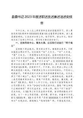 县委书记2023年度述职述责述廉述法述安报告今年以来,本人在上级党委和县委的坚强领导下,深入贯彻党的XX精神和XXXXXX视察XX省重要讲话精神,深入基层调查研究,认真抓好分管工作,恪尽职守、担当作为,较好地完成了各项工作任务。现将有关情况报告如下:一、坚持围绕中心、服务大局,以实际行动践行两个确立坚持提升政治能力,落实政治责任,锤炼政治素养,不断加强政治理论学习,切实做到统之有方、参之有道、落之有力。一是理想信念更加坚定。坚持对党绝对忠诚,立足县委书记岗位职能,准确把握新时代党的建设目标要求,树牢四个意识,增强四个自信,把XXXXXX最新重要讲话指示批示精神作为学习的重要内容,深入贯彻落实XX和党的XX精神,坚持学中干、干中学,把让党放心和让人民群众满意统一起来,不断提高工作主动性和创造性,不忘初心、砥砺前行,不断推动党中央和省市决策部署落地见效,切实在捍卫两个确立,践行两个维护上做到争先进、做表率。二是思想教育更加深入。聚焦学思想、强党性、重实践、建新功XX要求,制定个人学习计划,依托学习强国等载体平台及时跟进学,参加2+2+2分段式读书班,围绕树立和践行正确政绩观进行交流发言、分享心得。践行四下基层优良传统,为XX等三村及政法委讲党课,宣讲党的路线方针政策,为下一步工作提思路、谋举措、鼓干劲。丰富学习内容,前往XXXX镇、XX社县开展沿着XXXXXX足迹感悟思想伟力实践活动。围绕群众急难愁盼等,开展电视问政、现场办公,有效化解养鸡市场信访矛盾。打造县乡村三级综治中心建设,完成《XX县后勤服务市场化经济的探索和思考》等高质量调研报告XX篇,不断推动学习XX往深里走、往心里走、往实里走。三是统筹协调更加高效。深入贯彻XXXXXX关于新时代办公厅(室)工作的重要指示精神,坚持快、稳、严、准、细、实六字工作要求,围绕项目、产业和经济,聚焦全国全面乡村振兴示范县建设,组织开展县县情大学习、业务大比拼、作风大转变等活动,持续为基层减负,纠治文山会海、督查检查过多过频、指尖上的形式主义等问题,持续提升县委办三服务能力水平,以高效率的统筹协调、高层次的参谋服务、高质量的督促检查、高标准的运行保障,不断增强政治判断力、政治领悟力、政治执行力,有力保障县委高效运转,确保省市各项决策部署和XX县委议定事项件件有落实、事事有回音。二、坚持改革破题、发展优先,以务实举措服务经济社会坚持发展出题目、改革做文章,深化体制机制改革,巩固拓展脱贫攻坚成果,推进全面乡村振兴,不断提升经济发展活力和水平。一是改革创新蓄势赋能。深入调研综合执法体制改革,聚焦行政部门执法权限,理顺综合执法工作机制,强化部门联合执法。扎实开展六权改革工作,盘活利用各类土地近XX万亩,督促制定工业用水权收储交易管理办法和有偿使用费征收方案,精准核定全县灌溉面积,盘活水资源存量,推进短期用水权交易。开展林草碳汇调查,测算林草碳汇量每年XX万吨,预估产值达XXXX进驻,将部分审批权限下放乡镇。建立检察院未保中心联动保护、共青团综合矫治等三位一体模式,有效衔接司法保护需求与社会资源,探索出一条具有县域特色的未成年人司法社会支持体系新路径。围绕炒茶课题,临时借调XX名机械设计专业人员,深入基层一线、考察研究、测绘制图,设计完成滚动式翻转式升降式自动翻炒工具XX款,切实节省土地空间,提升产品质量。二是农业产业提标扩规。坚持农业优先型发展,主动融入XX省特色产业布局,推行龙头企业+新型经济合作组织+产业基地+农户模式,包抓重点项目,加快推动XX能源、XX等项目建设选址及工程进度,不断提升工业、制造等生产端优势,带活产业链、带强经济链。推进XX村等老旧日光温室改造提升和闲置日光温室盘活利用,大力发展设施农业,打造XX等XX个现代农业产业园,带动周边群众务工。提倡发展高效节水灌溉,现场化解XXXX村高效节水信访矛盾纠纷。前往XX、XX等地考察学习农特产精深加工,探索新型经营主体孵化、联农带农机制,鼓励发展肉牛、肉羊等,特色产业全产业链综合产值对农民收入贡献率突破XX%。三是乡村振兴全面发力。持续完善防返贫动态监测和帮扶机制,主持召开巩固拓展脱贫攻坚成果同乡村振兴有效衔接工作推进会,完成第五轮驻村干部进驻工作。牵头组织全国高质量发展研讨会,XX名国内专家学者和XX个全国高质量发展示范点作主题发言、交流经验。承办第二四届(2023)中国茶业大会,推出好茶定制活动,促进茶销售。严格落实处级领导包抓三类监测户制度,为贫困户宣传政策、纾困解惑,协调低保、产业贷款,寻求爱心资助、司法救助,切实做到解思想、寻出路、谋发展,XX村等XX个软弱涣散基层党组织提档升级。打造乡村振兴示范村XX个、美丽宜居村XX个