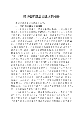 镇党委抓基层党建述职报告现将抓基层党建情况报告如下:一、2023年主要做法和成效(一)聚焦政治建设,思想根基不断夯实。一抓主题教育强信念。扎实开展学习贯彻XXX新时代中国特色社会主义思想主题教育,开展党委中心组学习14次,高质量完成7天专题读书班学习,集中学习研讨5次,机关及各支部开展集中学习20余次、学习交流44次,班子成员及各级党组织书记上党课31次。科学确定正反典型案例2个,高质量完成调研课题9个。为58名腿脚不便、无法到场的老弱病残党员安排42名党员干部送学上门106次。确定民生事项清单20条(全部销号),问题清单28条(销号19个)。二抓理论武装锤党性。坚持落实第一议题制度,持续深入学习XXX新时代中国特色社会主义思想,坚持运用学习强国APP中央厨房融媒体平台开展线上学习,组织机关干部开展XX大会议精神学习等9次,赴革命教育基地学习12场次,1个党组织前往缅怀革命先烈,为70余人开通党员教育数字电视平台,不断激发广大党员的政治热情,增强干事创业的强大动力。三抓廉政建设正风气。严格落实一岗双责,健全一把手负总责、分管领导各负其责、班子成员齐抓共管、镇纪委协调督查工作机制,聚焦耕地保护、乡村振兴、集体三资、营商环境等重点领域开展监督22次,发现并督促整改问题47个,发送廉洁提醒短信2000余条,出台《党员干部八小时外监督管理办法》文件,进一步加强和改进党员干部作风建设。(二)聚焦人才队伍,综合素质不断提升。一是优化两委班子。成立村(社区)两委班子届中分析工作专班,通过重点走访+全面调研相结合的方式,对各村(社区)两委班子的相关情况及可能存在的问题等情况进行了摸底调查,创新推动干部队伍优化,优化调整10个村(社区)干部15人,不断激发干部队伍内生活力。二是优化干部队伍。配合区党群工作部完成提拔任副处级领导1人,完成职务晋升1人职级晋升1人,调整二级科室负责人1名,完成本土人才招录4人,社区干部招录6人,见习人员及公益性岗位人员招录11人。三是优化党员队伍。严格把关,从源头上确保发展党员的质量,圆满完成2023年度积极分子暨发展对象集中培训,发展新党员10人,预备党员转正10人,转接党员10人。(三)聚焦作用发挥,基层基础不断打牢。一是严格制度落实。认真落实党的《准则》《条例》,做实三会一课等常规动作,对照党群部下发通知认真组织基层党组织开展主题党日活动264场次。高标准完成2022年度镇领导班子民主生活会,指导26个基层党组织按要求召开2022年度组织生活会,民主评议党员936余人,评选优秀党员150人。二是严格非公党建。坚决落实两个全覆盖,摸排新业态新就业群体3家。规范非公党组织调整,顺利完成天赐温泉党支部换届选举,成功撤销飞帆塑胶、银雁和力帆3个非公党支部,支持瑜欣平瑞、燕牌党支部开展示范点建设,辐射带动周边非公党组织党建工作提质增效。三是严格典型选树。把准脉、辨准症,建章立制强管理,有力推进华新软弱涣散党组织整顿。组织召开2023年度党组织书记抓基层党建工作述职评议1次。认真筹备重庆市村(社区)担当作为好支书评选活动,细致打磨评选相关材料,时刻关注参选人员有无不宜选树的情形。目前,选送人员有望获选重庆市村(社区)担当作为好支书。(四)聚焦党建引领,融合发展不断增效。一是助力经济发展。坚持党委统筹,党员干部带头推动,全力推动全镇经济建设。预计全年,规上工业总产值完成59亿元、批发销售额完成18亿元、零售额完成1.3亿元,同比分别增长5.5%、14%、7%。新增科技型企业87家,超额完成双倍增。规上工业企业研发投入完成2亿元,占主营业务收入的3.5%。全年固定资产投资完成54.8亿元,全区排名第一。二是助力基层智治。构建镇党委—村(社区)党组织—网格党小组—党员户四级联动治理格局,严格落实6+1网格员任务清单,健全完善网格吹哨、部门报到机制,实现群众诉求闭环管理处置。截止目前,组织专兼职网格员培训6次,协调解决网格事项2927件,下派网格任务6000余件,办结率、完成率均100%,打通基层治理的最后一公里。三是助力民生服务。紧盯残疾人、计生、重精等特殊群体,开展慰问437人次发放慰问金11.69万元,发放各类补贴3900余人次101余万元,成功完成渝馨家园AAA级创建目标。含谷就创之家服务成效显著,帮助25名初创者获得750万元贷款,带动300余人实现就业;城镇新增就业2697人,1名同志获评重庆市就业创业工作先进个人;完成网上办件1500余件,及时率100%,一件事一次办办件900件,满意率100%。二、存在问题和原因分析(一)推动创新发展的措施还不够有力。抓好新时期党建工作的创新意识不强,深层次谋划党建工作的思路和眼界还不