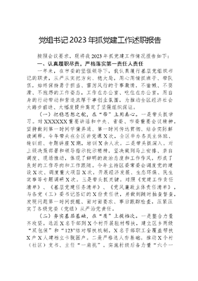 党组书记2023年抓党建工作述职报告按照会议要求,现将我2023年抓党建工作情况报告如下:一、认真履职尽责,严格落实第一责任人责任一年来,在市委的坚强领导下,我认真履行基层党组织书记的职责,从严从实把方向、稳大局,用心用情抓班子、带队伍,始终保持勇于担当、雷厉风行的干事激情,不愉懒、不耍滑、不抱怨的工作姿态,工作在办公室、吃住在办公室,用自身的行动带动和营造浓厚干事创业氛围,为推动全区经济社会大踏步前进、大幅度提升奠定了坚强组织保证。(一)把稳思想之舵,在带上用真心。一是带头抓学习。对XXXXXX重要讲话和中央、省委、市委重要会议精神,坚持做到第一时间学懂弄通、第一时间传达贯彻、结合实际解读阐释。今年带头在全区讲党课X次,全区举办各类主体班、轮训班、专题讲座X期,培训X余人次。二是带头抓深入。对上级决策部署和领导指示批示精神,坚决做到马上安排、亲自调度、现场推动,体现了鲜明的政治态度和工作作风,形成了良好的工作导向和工作跟随。今年主持区委常委会调度党的建设X次、调度重大项目X次,开展经济发展、生态环保、民生实事等专题调研X次。三是带头抓关键。对照《党建工作责任清单》、《基层党建任务清单》、《党风廉政主体责任清单》,与各党(工)委书记签订的X份责任状,并做到随时抽查督查,发现问题第一时间提醒、面对面要求、事后跟踪检查,压紧压实了各级党委(党组)从严治党责任。(二)夯实基层基础,在质上提档次。一是整合力量齐攻坚。选派X名干部到X个村开展驻村帮扶,建立区乡两级双包保和123结对帮扶机制,X名干部职工全覆盖帮扶X户X人建档立卡脱困户。二是严格选人夯基础。推动X个村(社区)支书、主任一肩挑。实施村级后备力量六个一批选拔计划,建立X名村级后备干部库。建立双八条正负清单,摸排重点难点村(社区)X个、村(社区)两委意向性人选X人。三是示范创建提质量。创造性的提出在全区开展了一带两区三线党建示范创建,分领域打造了X个党建示范点,累计完成X个党支部达标创建,X个村(社区)阵地全面实现标准化规范化。四是建强队伍强支撑。推动领导班子梯次配备、合理搭配,2023年提拔X名干部中35岁以下年轻干部X名,大学本科以上X人。实施高层次创新型青年人才培养计划,培养教育、卫生、医疗等各领域创新型人才X人,培养土专家、田秀才X人。(三)锻造清正之风,在严上动真格。一是驰而不息抓作风。查处违反中央八项规定精神X人,党纪政务处分X人。二是专项治理保民生。开展三个专项监察、五个专项治理,对漠视侵害群众利益问题立案X件,党纪政务处分X人。三是全面巡察净生态。开展X轮政治巡察了覆盖X单位,启动X个村(社区)直巡工作,打通了从严治党最后一公里,一些共性的问题得到有效遏制。(四)注重整治实效,在改上下真功。对上级点评、本级自查、专题查摆的问题,完善机制、强化调度、狠抓整改。目前,X书记点评的X个问题、市委领导带队检查指出的X个问题以及主题教育上级点的X个问题已全部整改完毕;自己查、大家提的X个问题也全部整改完毕;防风险、守底线专题会议检视出的X个问题已整改X个,X个正在整改。二、清醒认识问题,深刻剖析问题成因问题是工作的导向。我始终把坚持问题解决作为推动全区党建工作的重中之重,通过深查细找,我认为还存在以下几个方面问题:一是两个责任压得还不够实。部分党组织和领导干部对党建责任制的落实还不到位,党政同责、一岗双责的压力传导还不均衡。二是村集体经济发展有待提升。部分村干部抓发展的激情不够、动脑不多、思维不活,找不准本村产业发展方向和重点,安于守摊子,不主动向上争取支持,特别是和有政策、有资源、有项目的政府部门、金融机构对接不够,导致信息还不灵通,错失了一些发展良机。三是干部能力素质还有待提高。全区熟悉城乡规划、金融、大数据等领域专业型领导干部较少,部分领导干部抓城乡建设、工业经济、乡村振兴专业能力还不够强,责任心、紧迫感、精神状态都需要进一步增强。主要原因:一是思想认识还不到位。部分党组织书记对党风廉政建设和基层党建认识不深,工作抓得不力,工作沉不下去,问题浮不上来,一些老毛病、坏习气依然存在。二是制度机制还不健全。统筹机制、考核机制不够完善,落实的效果不够好,特别是在大抓基层、抓实基础、抓出成效的合力上还有差距。三是培养机制还不完善。部分党委(党组)对干部培养不重视,没有结合干部特长,制定针对性措施、放在专业岗位上培养,挫伤了干部的积极性,影响了发展的质量。三、敢于刀刃向内,务实抓好整改提升发现问题只是手段,抓好问题整改才是目的,下一步,我将着力从以下几个方面抓好整改提升。(一)持续深化理论武装,坚定政治方向。持续开展学习贯彻XXX新时代中国特色社会主义思想主题教育成果,不断提升党员干部思想政治水
