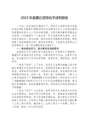 2023年县委办领导班子述职报告一年来,在县委的正确领导下,县委办公室领导班子坚持以党的XX大精神和XXX新时代中国特色社会主义思想为指导,紧紧围绕县委中心工作和决策部署,以群众路线教育实践活动为统领,以巩固提升三型五好班子创建成果为目的,充分发挥参谋助手、综合协调、督促检查和保障服务等职能,有效保障了县委的高效运转。根据考核要求,下面我代表县委办公室领导班子,将一年来履职情况汇报如下:一、突出理论学习,能力素质实现新提升坚持把学习作为提升班子理论素质,扩展党员干部视野,增强科学发展能力的主阵地,不断创新学习方法,注重学习实效,努力做到在工作中站得更高、看得更远、想得更深、抓得更实。一是在深学上下功夫。利用办公室最先接触上级文件最先掌握有关信息的有利条件,领导班子坚持以身作则、率先垂范,将即时学与经常学、专题学与系统学、专家辅导学与现场观摩学相结合,先学一步、学深一层,吃透精神、入脑入心,认真系统的学习了XXXXXX系列讲话精神,特别是深入学习了XXXXXX对新时代办公厅工作作出的重要指示精神,着力深化思想教育,深刻把握精神实质,领导班子引领发展的能力不断增强。二是在笃行上求实效。始终将学习作为推动工作的出发点和落脚点,将班子学习同贯彻省、市、县委各项决策部署和弘扬焦裕禄精神,学习先进事迹相结合,着力转变工作作风,提高工作效率,切实将工作重心转移到谋划全县改革发展的重心上来,恪尽职守,廉洁奉公,达到了学习一个专题、研究一个问题、推动一项工作的目的。三是在立制上谋长远。坚持把学习教育、推动工作与建章立制相结合,治标与治本相结合,着力在抓长、抓细上下功夫,对办公室学习制度进行全面、系统的修订完善,重新建立了《领导班子学习制度》《办公室党员集中学习制度》等相关制度,将每周2次的集中学习以制度的形式予以规范,并长期坚持,形成了推动学习的新常态。我办学习贯彻XXXXXXXXXXXX对新时代办公厅工作作出的重要指示精神加强自身建设的主要做法在11月下旬召开的全市党委系统办公室主任会议上进行了交流发言。二、突出中心工作,参谋服务展现新作为充分发挥参谋助手作用,紧紧围绕县委决策部署和中心工作,提升决策建议、调查研究、信息、政务服务等方面水平,为领导科学决策提供重要参考。一是改进文风,以文辅政求精品。将规范、精品文稿作为上传下达、部署工作任务的主要载体。在各类文稿起草上,大力提倡短小实用新颖的文风,力求简短精炼、直截了当,能够三言两语说清楚的事绝不绕弯子,能用短小篇幅阐明的道理绝不做长文章,力求做到多写反映全县实际的地方话,少写通行全国的普通话,突出文稿的思想性、针对性和实用性,做到了主题鲜明,重点突出,措施可行,文字精炼。年内,共组织起草县委工作会、全委扩大会、十四届三次党代会、主题教育动员会等全县大型会议上县委主要领导的讲话及全县经济社会发展、重点项目建设和党风廉政建设主体责任落实汇报等各类综合材料120余份70多万字,制定下发县委文件57份,办公室文件165份,实现了办文零差错的目标,充分发挥了以文辅政的作用。二是改进会风,提质增效重实绩。按照并、缩、简、变的原则,创新会议形式,实行大型会议套开法,关联会议合并法,类型相同压缩法等办法,严格控制会议数量,减少会议成本,严肃会议纪律,切实精简会议,改进会风,务求实效。共组织召开县委工作会,重点工作研讨会等大型会议21场次,形成了突出重点开短会,突出成效开精会的良好会风。坚持现场办公会议制度,及时邀请市级相关部门和区级四大班子领导,研究解决经济社会发展遇到的难点和群众关心的热点问题,组织开展了农业观摩、冬季供热等现场办公会议34多场次,在会议次数大幅下降的基础上,提高了会议效率,促进了各项工作任务的落实。三是深入研究,建言献策谋全局。紧紧围绕县委中心工作和领导关注的重大问题,深入开展调研活动,站在全局高度认识形势、吃透情况、思考问题,培养和提高研究政策、运用政策的能力,当好智囊团和思想库,努力做到研究在领导决策之前、参谋在领导思考之中,今年,共组织开展重点项目建设、落实五加强党建工作、现代农业发展、理顺市区管理体制机制等调研30多次,形成了30多篇质量较好的调研报告。积极创新调研方式,利用两天的时间,组织办公室全体政务秘书,对近两年全县一产、二产、三产重点项目和小城镇建设相关情况进行了现场调研,在调研后组织召开了座谈会,开阔了干部的视野,增长了见识,提高了干部的综合能力。坚持县委多年形成的年度调研月制度,精心确定工业经济发展、重点民生工程建设、城市建设管理等8个调研专题,组织开展了年度调研活动和全县2023年重点工作研讨会,既统一了思想交流了经验,又为明年工作开好局、起好步打下了基础。四是创新方式,信息服务上台阶。充分发挥党委办公室千里眼、