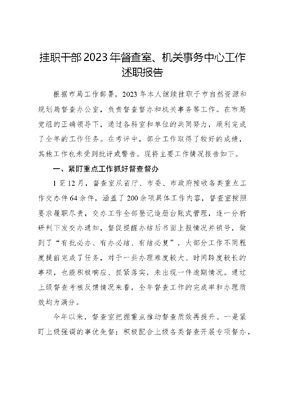 挂职干部2023年督查室、机关事务中心工作述职报告根据市局工作部署,2023年本人继续挂职于市自然资源和规划局督查办公室,负责督查督办和机关事务等工作。在市局党组的正确领导下,通过各科室和单位的共同努力,顺利完成了全年的工作任务。在考评中,部分工作取得了较好的成绩,其他工作也未受到批评或警告。现将主要工作情况报告如下。一、紧盯重点工作抓好督查督办1至12月,督查室从省厅、市委、市政府接收各类重点工作交办件64余件,涵盖了200余项具体工作内容,督查室按照要求履职尽责,交办工作全部登记造册台账式管理,逐一分析研判下发交办通知,督促提醒办结后书面上报情况并销号,做到了有批必办、有办必结、有结必复,大部分工作不同程度提前完成了任务,对于一些办理难度较大、时间跨度较长的事项,也能积极响应、抓紧落实,未出现一件逾期情况。通过上级督查考核反馈情况来看,全年督查工作的完成率和办理质效均为满分。今年以来,督查室把握重点推动督查质效再提升。一是紧盯上级强调的事优先督:积极配合上级各类督查开展专项督办,牵头负责抓好贯彻落实XXXXXX重要指示批示精神、全市双月重点工作等专项督查活动,建立我局五个重大年度工作清单,每周督查上报省委办公厅交办工作,每月督查上报省委专题会部署工作,确保上级强调工作在日常督查督办事项中的优先级。二是紧盯领导交办的事重点督:建立各级领导同志批示交办件归口督查办理机制,对省委主要领导、市委市政府主要领导、局主要领导同志在调研、会议等场合提出的具体工作要求,坚决做到批必查、查必清、清必办、办必果,今年共督办落实各类领导交办事项60项,定期印发《督查通报》激励先进、鞭策后进。三是紧盯群众关心的事常态督:始终秉承业务工作服务于群众和市场主体的理念,全心全意做好常态化督查,着力解决群众和企业急难愁盼问题,下发各项《交办通知》《工作提醒》67件,督促耕地保护和流出问题整改、遏制工程建设领域私搭乱建行为、集中整治盗采矿产资源违法违规行为等专项行动落实落细,推动欠缴土地出让金、中科农业公司信访等问题及时化解销案。二、统筹五个重大抓好推进落实今年来,督查室继续牵头统筹我局五个重大工作,全年工作圆满完成,我局三项牵头事项中,一项获得红旗奖、一项获取先进个人荣誉,在全市范围内被通报表扬,其余工作稳步推进、高效开展,取得成效获得了上级领导的肯定。2023年初,市政府下发全市任务,督查室全面深入研究、结合系统职能和工作需求逐项对比梳理,形成市资规系统五个重大任务清单并发文督办,督查室每周督办更新工作进展、每月梳理局领导跑省进京向上争取情况并形成正式文件上报市政府。年中按照市委、市政府工作要求和结合自身工作实际,对所有事项开展了再分析、再研判、再梳理、再调整、再完善,对工作内容、工作计划、工作目标进行了两次全面动态调整,年终对全年工作进行了总结并会同业务科室提前谋划对明年工作设定了目标。总体来说五个重大各项工作均按照时序完成了相应工作任务,国土空间规划、xx项目用地等部分工作提前完成,用地瓶颈破解争取林地指标等任务超额完成,交通瓶颈破解白鱀豚保护区功能区划调整等部分中远期工作也序时推进。三、服务机关事务抓好后勤保障自今年十月底以来,本人负责了局机关事务一系列有关工作,具体涵盖了物业管理、食堂管理、公务车辆调度以及各类公务商务接待等工作。在此期间,我严格遵守相关规定,不断提升自己的业务水平,深入了解、学习、理顺各项事务的处理流程,以确保各项工作的顺利进行。同时,我也非常注重与机关科室、二级单位、外单位间的沟通与协作,以共同维护局机关的正常运转。通过不懈努力和严谨的工作态度,为保障机关事务工作的稳定性和连续性作出了积极贡献。在食堂管理上,着重抓好三个方面:一是坚守安全生产底线,增强安全作业意识,严格执行操作规范,加强防火、防毒、防盗等安全措施;二是保障食品安全底线,严格把关采购、加工和清洁消毒等环节,确保食品卫生安全,同时做好食品留样备查工作;三是控制成本开支红线,通过调研了解用餐需求总量,定期或不定期抽查对比原辅材料进货市场行情,有效降低浪费和损失,提高资源利用效率,在有限的成本预算内,确保职工餐的食材达到卫生和营养的较高标准,确保菜品供应种类丰富多样有特色。在物业管理上,致力落实四项重点:一是强化安保值守工作,对机关范围进出严格管理,执勤保安定岗定人,夜间和节假日不定期开展抽查;二是加强设施设备的管理和维护,特别是对监控、电梯、消防、排污、供水等关键设施进行定期检查、保养和维修,确保其稳定可靠;三是优化保洁服务,强化清洁工作,确保机关办公环境整洁有序;四是采用公开招标方式,挑选更专业、更敬业的绿化服务团队,定期对绿化植被进行养护,为机关营造优美、宜人的工作环境。在公务车辆调度与管理上,严格遵守市、局两级的规定,非工作时