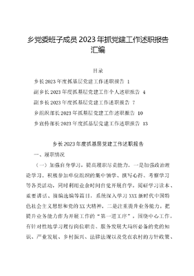 乡党委班子成员2023年抓党建工作述职报告汇编目录乡长2023年度抓基层党建工作述职报告 1副乡长2023年度抓基层党建工作个人述职报告 4副乡长2023年度抓基层党建工作述职报告 7乡组织部长2023年抓基层党建工作述职报告 10乡宣传部长2023年度抓基层党建工作述职报告 13乡长2023年度抓基层党建工作述职报告一、履职情况(一)加强自身学习,提高履职尽责能力。一是加强政治理论学习。积极参加单位组织的集中领学、撰写心得、考察学习等各类活动,同时利用业余时间自觉开展自学,阅研学习读本、重要讲话、摘编选编等篇目,系统深入学习XXX新时代中国特色社会主义思想和党的XX大精神。二是注重提升业务能力。把提升业务能力作为开展工作的第一道工序,围绕中心工作,有针对性地学习履行岗位职责、服务发展大局所必备的党的知识、产业发展、乡村振兴、法律法规以及党在农村的方针政策、群众工作方法等知识,进一步解放思想、开阔视野、拓宽思路、完善方法措施,增强抓党建、抓产业、抓发展能力。三是注重深入调查研究。做实结合转化文章,坚持学思并重、学以致用,自觉运用唯物辩证法观点、实践第一观点、群众路线观点、科学发展观点去认识问题、分析问题、解决问题。搞好调查研究,奔着问题去、带着问题学、理清思路干,从实践中掌握新知识、积累新经验、增长新本领,用学习之箭射实践之靶。(二)注重党建引领,统筹推进全乡工作。协助党委书记抓好党建工作,深挖全乡党建工作资源优势、特色亮点,大力践行三个工作法,持续推进党建示范点建设。一是抓实党建工作。协助党委书记扎实抓好党建工作,年内调研和督促检查基层党建工作4次、与挂钩村共同研究党建工作5次,到党支部联系点2次。落实四个一措施,实现软弱涣散基层党组织整顿提升,有效巩固支部规范化达标创建成果。充分发挥党组织引领作用、党员先锋模范作用、群众主体作用,打造建成x村党建+人居环境、X村党建+民族团结一家亲等12个乡村振兴示范点,推动基层党建全面提质增效。村级集体经济持续增收,通过盘活三资、抱团发展,因地制宜地推进村集体经济提质增效,所有村集体经济收入能在去年基础上增幅20%以上。二是抓实项目建设。始终坚持抓发展必须抓项目的理念,主动作为,认真研究全乡发展重点领域、行业和方向,围绕全乡重点产业链抓好项目谋划,共储备项目16个,建立行业项目库3个,项目总投资4223万。加快未完工项目施工进度。及时督促施工队,倒排工期,进一步加快未完工项目施工进度,确保项目及早发挥效益。有序推进新项目实施开展。2023年共批复实施项目14个,计划投资2210万元,项目开工11个,正在进行招投标3个。扎实推进绿美公路,完成绿美公路点位打造1条3.6km,完成棕包树种植800棵。共完成沿江污水治理项目2个,完成投资938.47万元,完成污水管埋设16.46km,氧化塘建设(含改造)2座。三是抓实巩固拓展脱贫攻坚成果同乡村振兴有效衔接工作。严格落实四个不摘要求,加强防返贫致贫动态监测和帮扶,坚决守住不发生规模性返贫底线。2023年以来共开展过9次防止返贫动态监测工作,新识别突发严重困难户4户21人,消除风险突发严重困难户1户2人,消除风险脱贫不稳定户6户14人,两不愁、三保障及饮水安全等民生保障普惠政策稳中向好发展。四是抓牢安全生产工作。始终牢固树立安全发展理念,以时时放心不下的责任感,用四个好牢牢守住四条线,进一步强化项目建设前中后全过程监管,抓实抓牢各参建单位安全生产责任,划好主线、明确红线、筑牢防线、守住底线,确保项目安全生产工作持续稳定向好。共开展在建项目安全检查6次。五是抓实分管工作。运用党建思维,抓好抓实每一项工作。大力弘扬马上就办、真抓实干的作风,牢固树立以钉钉子精神抓落实的工作理念,扎实推进作风革命效能革命。严格职工福利,维护职工权益,认真开展好工会各项工作。以铸牢中华民族共同体意识为根本方向,以加强各民族交往交流交融为根本途径,以中华民族一家亲、同心共筑中国梦为总目标,按照人文化、实体化、大众化总要求,把民族团结创建与乡村振兴、基层党建、经济社会发展等重点工作有机融合,不断推进民族团结进步创建工作。组织政协委员开展理论学习,提高政协委员履职水平。指导村级开展好协商在基层工作,形成广泛参与、上下联动的工作格局,推进政协工作走深走实。同时,统筹抓好科协、老干部、驻村工作队员管理等其他分管工作。(三)从严正风肃纪,营造风清气正氛围。一是在行动上提升廉洁自律。工作中始终固牢树立廉政意识,紧绷廉政这根弦开展各项工作。学习先进典型和警示反面案例,深入剖析和自我反省,不断相互敲警钟、拉警报,并传承艰苦奋斗精神等,保证队伍廉洁高效,实现业务工作和廉政意识建设的同步发展。并基于牢