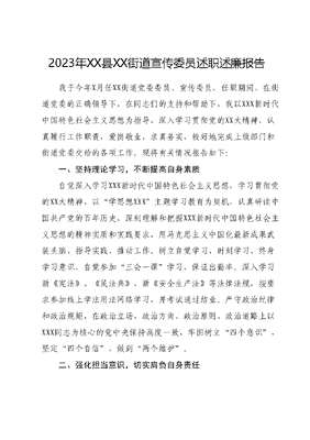 2023年XX县XX街道宣传委员述职述廉报告我于今年X月任XX街道党委委员、宣传委员,任职期间,在街道党委的正确领导下,在同志们的支持和帮助下,我以XXX新时代中国特色社会主义思想为指导,深入学习贯彻党的XX大精神,认真履行工作职责,爱岗敬业,求真务实,较好地完成上级部门和街道党委交给的各项工作。现将有关情况报告如下:一、坚持理论学习,不断提高自身素质自觉深入学习XXX新时代中国特色社会主义思想,学习贯彻党的XX大精神,以学思想XXX主题学习教育为契机,认真研读中国共产党的百年历史,深刻理解和把握XXX新时代中国特色社会主义思想的精神实质和实践要求,用马克思主义中国化最新成果武装头脑、指导实践、推动工作。树立自觉学习、时刻学习、终身学习意识,自觉参加三会一课学习,保证出勤率。深入学习新《宪法》、《民法典》、新《安全生产法》等法律法规,按要求参加线上学法用法网络学习,并考试通过结业。严守政治纪律和政治规矩,在政治立场、政治方向、政治原则、政治道路上以XXX同志为核心的党中央保持高度一致,牢固树立四个意识,坚定四个自信,做到两个维护。二、强化担当意识,切实肩负自身责任今年X月到X月,我任XX镇纪委副书记、监察组副组长,主要做了以下工作:(一)警示教育活动进一步深化每季度召开警示教育大会,集中观看《镜鉴初心勇担使命》等警示教育片。先后开展机关女干部廉政书法比赛活动、净化政治生态主题党日活动。组织新任职村两委干部培训,集中观看《底线》警示教育片,并进行廉政集体谈话。严明过节纪律,在法定节假日前夕下发通知、微信公众号推送过节提醒,强调过节纪律要求;节日期间开展四风问题监督检查,对XX个点位进行随机抽查。(二)日常监督工作做实做细一是是驰而不息纠治四风。在元旦、春节、五一、端午等法定节假日期间,通过下发通知、廉政短信、微信公众号推送等方式,对过节纪律要求进行提醒和强调。组织机关全体干部和村两委成员签订廉洁从政承诺书,对党员干部的作风、坐班等问题开展专项检查,对街道域内超市、饭店和景点开展明察暗访,四风问题得到有效遏制。开展以庆祝名义从事商业谋利活动专项监督检查,制定工作台账,五一、端午期间通过明察暗访、随机抽查的方式,对节日期间各村以庆祝名义从事商业谋利活动情况开展监督检查。三是严肃查处违纪案件。通过构建信访举报平台、拓展信访举报渠道、规范信访举报流程,强化责任,深化职能,及时解决群众的合理诉求,把信访举报工作做细做实。加大对违纪违法案件核查力度,对群众反映的信访举报问题积极开展调查取证,严肃追责问责。共受理问题线索X件,其中立案X件,给予党纪处分X人次。运用监督执纪第一种形态处理党员干部和公职人员X人次,开展集体约谈XX人次。(三)村级联络站规范建设加强村级纪检监察工作联络站建设,选聘监督员XX人,明确工作职责,发挥监督作用。健全基础设施,统一制作展牌,按要求悬挂上墙,逐村检查站内设施配备情况,提出改进要求。组织开展村纪检监察工作联络站站长、监督员培训,参观XX村纪检监察工作联络站,开展业务培训、交流互动,进一步提升履职能力X月底至今,我调任XX街道党委委员、宣传委员,分管宣传、网信、文化工作,主要有以下进展:(四)理论学习有序开展街道党委理论学习中心组严格落实中心组学习制度要求,按照年初制定的学习计划,坚持自学与集中学习相结合,X月底至今共组织开展集中学习X次、交流研讨X次。学习内容涵盖从严治党意识形态、安全生产等方面。同时结合党史学习教育有关要求,举办处级干部读书班X次,通过学习进一步提升党员干部政治理论水平,强化党性修养。(五)对外宣传工作稳步推进对接县级媒体,做好社会宣传工作。以重大节日、重点工作及重要时间节点为抓手,向县级新闻媒体两台一报报送新闻线索X条,积极配合县级新闻媒体完成采访报道。在全县范围内广泛宣传我街道基层党建、经济农业、科教文卫、村街道建设等重要政务信息,向县两办信息科报送工作信息XX条,进一步提升我街道对外宣传水平。(六)精神文明创建扎实推动一是突出工作重点,开展特色活动。深入推进我们的节日主题活动,围绕培育和践行社会主义核心价值观,开展特色庆祝活动。以庆丰收感恩党为主题成功举办XX丰收节庆祝活动。二是树立文明新风,发挥志愿服务作用。组织各村依托新时代文明实践站打造并完善X+N志愿服务队,发扬互帮互助、团结有爱的传统美德,积极开展特色志愿服务活动。为深入推进全域创建文明城县和创建国家卫生街道工作,各村积极开展环境卫生大清整志愿服务活动。通过各类志愿服务活动的开展,让文明之风在我街道传递,为巩固脱贫攻坚成果,树立文明新风打下坚实基础。(七)意识形态工作抓稳抓牢一是认真落实党委意识形态工作责任制。坚持党管意识形态原则,深入贯彻落实《党委(党组)意识