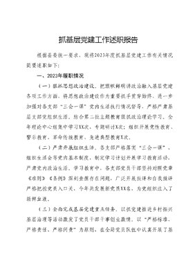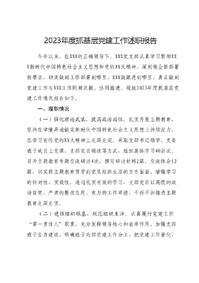 2023年度抓基层党建工作述职报告今年以来,在XXX的正确领导下,XXX党支部认真学习贯彻XXX新时代中国特色社会主义思想和党的XX大精神,深刻领会新部署新要求,切实做到工作部署到哪里,XXX就跟进到哪里,真正做到党建工作与XXX工作同频共振、协同推进。现就2023年度抓基层党建工作情况报告如下。一、履职情况(一)强化理论武装,提高政治站位。扎实开展主题教育,坚持在学懂弄通做实新时代中国特色社会主义思想上持续发力,在学习宣传党的XX大精神上走深走实。采取支部书记领学、支委班子成员上党课、支部党员领读等方式,组织集体学习40余次。召开主题教育专题交流研讨4次,撰写研讨材料2篇,交流体会12篇,切实将主题教育贯穿到党员组织生活的方方面面,增强学习的针对性、实效性。通过扎实有效的学习,支部党员以高度的政治自觉、严肃的整改态度、有力的工作举措,不折不扣推进主题教育走深走实。(二)建强组织根基,规范组织生活。认真履行党建工作第一责任人职责,充分发挥领导核心和表率作用,加强支部班子自身建设,明确班子内部党建工作分工,把党建工作量化、细化到人,进一步规范党建工作,形成了支部书记统一领导,各部门各司其职,一级抓一级、层层抓落实的党建工作格局。从严落实三会一课、党员活动日等制度,积极开展灯塔-党建在线学习、学思想、强党性、重实践、建新功等主题党日活动,极大提升了党支部的凝聚力和参与度。(三)坚持党建引领,推进书记项目。把用党建引领机构改革、用担当服务发展大局列为2023年度书记项目。以党建引领,教育引导党员干部进一步明晰岗位职责和工作要求认真学习领会XXXXXX关于XXX工作重要论述及关于深化党和国家机构改革的重要讲话精神指导XXX改革全面工作开展。加强党员干部工作作风建设,提升干事创业的使命意识和责任意识,增强党员干部干事创业的精气神。成立党员全员参与的机构改革工作专班明确工作任务,压实工作责任,推动我区XXX工作落实落地。二、存在问题及原因分析一是党建工作研究不够深入。对党建与业务的融合不紧密,日常党建工作满足于完成好上级党组织交给的规定动作,没有拿出足够的时间和精力去研究,结合本单位实际有针对性、有特色地开展党建工作的意识欠缺,没有真正把党建工作作为主责主业抓党建缺乏一抓到底的钉钉子精神。二是党员学习教育形式单一。虽然通过支部党员大会、开展理论宣讲等形式对党的XX大精神进行了集中学习,但对党员教育培训的形式、内容和手段还不够丰富,教育培训的质量和效果有待进一步提高。在集体学习中,多以传阅、诵读、摘抄笔记的形式学习,学习内容上局限于读文件、上党课、看教育片等,距离全面融汇贯通的学习标准还有差距。三是创新亮点不够突出。对新的历史条件下党的建设规律和XXX工作特点认识不够深刻,习惯于用传统的经验做法指导工作。虽然创建了铁的纪律、家的温暖党建品牌,提出了五抓五强五提升的思路,但大部分工作还是按部就班,支部工作创新不够,亮点不多,潜意识的还是把业务工作作为硬任务、硬指标抓落实,忽视以党建促业务的重要性。四是督查落实还需进一步加强。日常监督不严,第一种形态运用不够。在对党员干部执行工作纪律等问题上,考虑到大家平时工作比较辛苦,不忍直接批评,或是批评教育力度过轻,缺乏直面问题动真碰硬的狠劲。在加强党员政治理论教育方面,只关注学习了什么内容,而对党员干部的学习成效没有要求。认真分析以上问题存在的原因,主要还是对抓基层党建工作的必要性和重要性的认识仍要进一步深化,在新形势下研究谋划党建工作用心不足、着力不多,在抓经常抓长远方面还存在一定差距,致使党建工作与业务工作发展不平衡。三、下步工作措施2024年,我将带头履行主体责任,坚持以XXX新时代中国特色社会主义思想和党的XX大精神为指导,以提升组织力为重点,着眼强功能、抓基本、补短板、重创新,推动编办党建工作再上新台阶。(一)提高党建工作重要性认识。进一步落实党支部书记是第一责任人,党员干部都是责任人,一级抓一级,一级带一级的齐抓共管的党建工作责任体系。作为党支部书记切实担负起第一责任人的职责,与党员干部一道克服党建工作难题,转变观念,变党建工作要我抓为我要抓,充分发挥支部全体党员的作用,关心他们的学习、工作和生活,充分调动广大党员工作的积极性和主动性。(二)狠抓党建工作责任制落实。坚持以党的XX大精神为指导,以抓铁的纪律、家的温暖党建品牌为切入点,着力加强政治、思想、组织、作风和制度建设,更好的推进XXX工作高质量发展水平。全面落实党建主体责任制,坚持党建与业务同部署、同落实、同考核,坚决杜绝重业务、轻党建等现象。(三)发挥支部战斗堡垒作用。加强支部建设,发挥堡垒作用,强化党员队伍教育管理,高度重视党员作用的发挥,在XXX等工作中把党员
