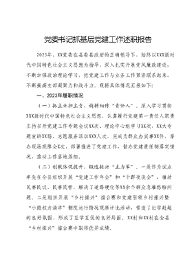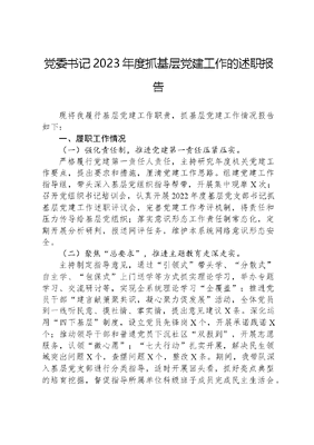 党委书记抓基层党建工作述职报告2023年,XX党委在县委县政府的正确领导下,始终以XXX新时代中国特色社会主义思想为指导,深入扎实开展党风廉政建设,不断加强政治理论学习,把党建工作与业务工作紧密联系起来,不断提高支部凝聚力和战斗力。现将具体情况汇报如下:一、2023年履职情况(一)抓主业担主责,精耕细作责任人。深入学习贯彻XXX新时代中国特色社会主义思想,认真履行党建第一责任人职责主持召开党建工作专题会议XX次、理论中心组学习XX次,XX大专题宣讲XX场,志愿服务活动XXX人次,完成为群众办实事XX件,举办现场观摩会X次,部署推进了党建工作,督办党建责任制落实情况,推动工作落地落细。(二)创载体促提升,锻造振兴主力军。一是作为试点率先在全县组织开展党建工作年会和干群夜谈会,推动民事民议、民事民管,解决了道路硬化等XX余个群众急难愁盼问题。二是组织开展乡村振兴擂台赛和党建引领乡村振兴暨小微权力清单制度运行情况观摩评比活动,营造了比学赶超的良好氛围,形成了互学互促的良好局面。XX村和XX村在全县乡村振兴擂台赛中取得优异成绩。(三)夯基础筑堡垒,打造过硬定盘星。按照县委组织部清零过半要求,克服大部分村在土地承包中的历史遗留问题,根据各村实际,先后精心组织村情恳谈会,个别户做工作、承包由点到面进行等方式稳步推进,使该项工作顺利完成,2023年,XX个村集体经济收入总体达到了XXX万元,收入最低的XX村收入XX万元,XX个村2023年集体经济收入同比2022年增加XX%,高质量完成了村集体收入十万清零的目标。(四)拓思路谋发展,打造产业聚宝盆。一是利用沙地资源,发展特色农业。乡党委因地制宜,结合沙地资源多的特点选派机关干部和XX两委成员赴XX和XX等地学习考察。借鉴先进经验,引导农民种植红薯、马铃薯、中药材等特色沙地农产品全乡共种植红薯XXXX亩,马铃薯XXX亩,预计每亩地增收XXX余元相关做法在人民日报进行了报道。二是XX个村全部成立党支部领办合作社,党建引领农业农村振兴动力不断激活。二、存在问题及原因分析存在问题:一是基层党组织党建工作创特色、创品牌的思路还不够新,力度还不够大,在开展党建工作中大多依赖上级安排党建工作精品意识不够强。二是党建工作开展不平衡,先进典型村与其他村之间党建工作水平差距较大,优质资源向先进村集中较多,一定程度上存在点上热闹、面上冷清的现象。比如,XX的党建发展水平远远超过其他村,并且差距在逐步拉大,反映出同一区域基层党建不是以相同加速度同步提升。三是抓基层党建职责落实不够严格,对党员干部教育、管理、监督不到位,思考研究不深,解决办法不多,整治措施不硬,特别是对党员干部加油鼓劲多,教育警示少,导致出现违纪违法问题。原因分析:一是队伍建设不到位,部分党员干部思想不够解放,在一定程度上存在等靠要的思想。二是日常工作不规范,在日常工作中存在能简则简,只看结果,不重过程,完成就行,没有形成精品意识。三是管理追责不严厉,问责力度不大,在党员教育管理方面不严不实,特别是对个别党员干部管理上还存在宽松软的问题,没有做到一把尺子量到底。三、2024年工作打算(一)持续用力抓队伍。围绕提升支部战斗堡垒作用,实施专题培训蓄能充电、外出观摩学习解放思想、完善制度机制驱动加压、加强整治行动正风肃纪,着力提升村干部引领发展、凝聚群众、服务群众、解决问题四种能力,在乡村振兴中抓主业扛主责、当主角。(二)持续用力抓规范。通过有计划地加强调查研究、述职评议、评比打擂、督查问效、督帮一体,进一步清整优化基层阵地,年内计划投资XX余万元对XX村、XX、XX阵地进行改造提升,全面对标先进阵地进行建设。严肃农村组织生活,规范村级制度运行,提升乡村规范化建设水平,推动我乡党组织全面进步、全面过硬,打造基层党建工作升级版。(三)持续用力抓经济。盘活用好农村集体资金、资产、资源,扶持集体经济项目,用好各类帮扶资金。摸清XX个支部领办合作社创建人、成员数、管理模式等基本情况,根据其实际情况完善管理机制,制定合理发展规划和运行机制,确保合作社健康有序、长远发展,力争年内XX个村集体收入有较大增长。(四)持续用力抓创新。进一步解放思想、开拓视野、学习先进,推动产业振兴,培树党建特色品牌,以点带面推进党建工作再上新台阶,确保打造X个能叫得响的党建品牌。