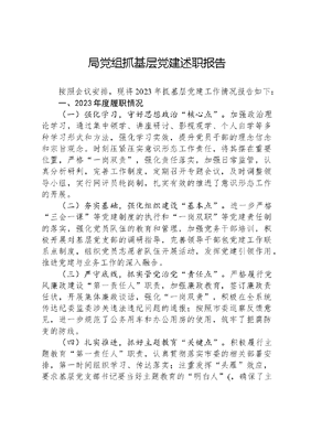 局党组抓基层党建述职报告按照会议安排,现将2023年抓基层党建工作情况报告如下:一、2023年度履职情况(一)强化学习,守好思想政治核心点。加强政治理论学习,通过集中领学、讲座研讨、影视观学、个人自学等多种学习形式和方法,强化学习实效,提升党员干部的理念信念和宗旨观念。时刻压紧压实意识形态工作责任,将其摆在重要位置,严格一岗双责,强化责任落实,加强日常监管,认真分析研判,完善工作制度,定期召开专题会议,及时调整领导小组,实行网评员轮岗制,扎实有效的推进了意识形态工作的开展。(二)夯实基础,强化组织建设基本点。进一步严格三会一课等党建制度的执行和一岗双职等党建责任制的落实,强化党员队伍的教育和管理,加强党务干部培训,积极开展对基层党支部的调研指导,完善领导干部包党建工作联系点制度,组织党员志愿者队伍开展活动,发挥党建引领作用,推进党建与业务工作的深入融合。(三)严守底线,抓实管党治党责任点。严格履行党风廉政建设第一责任人职责,加强廉政教育,签订廉政责任状,开展集体廉政谈话,强化一岗双责,积极在全系统传达纪委监委涉关违法违纪问题的通报;按照市委巡察反馈意见,进一步规范了公务用车和办公用房的使用,筑牢了拒腐防变的防线。(四)扎实推进,抓好主题教育关键点。积极履行主题教育第一责任人职责,认真贯彻落实市委的相关部署安排,第一时间组织学习、传达落实;注重发挥头雁效应,要求基层党支部书记要当好主题教育的明白人(,确保了主题教育部署会、理论学习、基层调研、问题检视、研讨、我为群众办实事等相关工作得到了扎实有效的开展。二、存在问题虽然2023年对照市委对党组织书记抓党建的各项工作要求取得一定成绩,但我也深感在工作中还存在以下差距和不足:(一)抓党建主业倾注的精力不够。虽然能牢记党建第一责任人的职责,但面对时间紧、任务繁重的改革发展工作,自己还是不自觉地把大部分精力放到了业务指标完成、安全稳定等重点业务工作上;党建工作还满足于做好上级要求的规定动作,开展活动的形式也不够多,没有花更多的精力对党建工作中遇到的新情况、新问题进行深层次的探索,在创新党建工作、对党建工作投入的精力依然不够。(二)对基层党支部日常工作指导的不够。在抓基层党支部党建的重点难点工作、上级任务方面倾注的精力多,落实推进指导的好;但在基层党支部的日常常规工作上,基本上是按照上级的要求,将相关工作进行传达和安排部署,在基层党支部落实相关工作的跟进指导上做的不够。像基层党支部的组织生活会、党员活动等日常工作,自己仅参加过机关党支部的,其他基层党支部的都没有参加过。(三)推进基层党建创优力度不够。由于各基层党支部所在的各基层单位、各局属企业发展效益不均衡,导致各党支部党建工作不平衡。比如,企业效益好的党支部党建工作开展的较好,参与党建创优的积极性较高;关停企业的党支部除完成上级要求的、常规基础的工作外,对参与党建创优的积极性不高。考虑到关停企业的客观实际困难,对这部分企业党支部不参与党建创优,没有及时给予思想教育,提高认识,让他们参与到创优活动中来。(四)党建工作压力传导不够深入。虽然在全系统认真落实党建工作责任制,但是在个别基层党支部还存在支部书记第一责任人职责落实不够到位的问题。个别党支部书记以完成日常业务为中心工作,对经济工作考虑多、管得多、出场多,对党建工作谋划少、抓的少。党建工作习惯于上传下达,满足于上级布置什么就完成什么,开展党建工作创新的主动性和原创力不够,过于依赖上级部门的布置和推动。三、下一步工作打算针对存在的问题,我将做好以下几方面工作:(一)压实党建工作责任。持续严格落实一岗双责责任制,逐级传导好主体责任和工作压力,进一步压实书记抓党建第一责任人的职责,牢固树立抓好党建是本职、不抓党建是失职、抓不好党建就是不称职、党建出问题是渎职的责任意识,进一步推动党建工作主体责任落实见效。(二)开展党建结对帮扶。在系统内党支部开展强带弱活动,组织党建强的支部与党建薄弱的支部结对帮扶,通过党建阵地与资源共享、经验交流、解决难题等方式方法,加快薄弱支部党建工作的快速提升,形成后进赶先进的良好工作局面。(三)加强党务干部队伍建设。以所属的10个基层党支部换届为契机,选优配强党务干部;加强对党务干部的教育培训,提升履职能力;完善对党务干部的考核激励机制,努力形成你追我赶、竞争向上的工作局面。以上述职,不妥之处,敬请各位领导和同志批评指正。