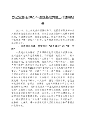 办公室主任2023年度抓基层党建工作述职报告2023年,在上级党委的坚强领导下,我团结带领支部一班人紧紧围绕局党委决策部署,结合办公室职能和机关教育管理定位,突出政治统领、锻造坚强堡垒、彰显作用发挥,认真履行抓党建第一责任人职责,奋力推动党建工作再上新台阶。现述职如下:一、淬炼政治忠诚,坚定走好两个维护的第一方阵一是突出政治统领。坚定不移把政治建设作为首要任务,把对党绝对忠诚作为最高标准,不断提升政治三力、树牢政治机关意识,始终做到在三服务中,提高政治站位,把准政治方向,坚定政治立场,把坚决捍卫两个确立、做到两个维护践行在实际工作当中。二是强化理论武装。以深入开展学习贯彻XXX新时代中国特色社会主义思想主题教育为重点,严格落实第一议题三会一课制度,认真制定个人理论学习计划,并指导制定支部理论学习计划,通过积极组织参加局主题教育读书班、政治轮训、开展支部党日、讲授专题党课、集中学习研讨、个人自学、撰写心得体会等,督促支部党员读原著、学原文、悟原理。支部共开展集中学习近10次,组织研讨近10次,组织党员开展学思践悟新思想擎旗奋进新征程主题党日活动,为支部党员讲授专题党课,引领每一名党员在奋进新征程中担主角、当先锋。三是严明纪律规矩。持续深化队伍教育整顿成果,切实扛起全面从严管党治警主体责任,组织召开肃清回头看专题组织生活会,及时扯袖子、敲警钟、吹廉风,进一步营造风清气正的政治生态和干事创业的良好环境。二、实现三化,坚持锻造规范坚实的战斗堡垒一是党员管理科学化。认真落实月度队伍思想形势分析会、六谈五访四慰问制度,及时了解支部党员思想、工作和生活情况,做到政治上指方向、工作上压担子,生活上多关心。二是党组织建设规范化。认真落实党建规范年总体部署,围绕建设四强党支部、过硬领率机关目标,深入开展学好用好两手册一示范片活动,全面抓好《细则》落实,不断提升党支部建设质量。根据干部职务调整情况,规范开展支委改选工作,配齐配强支部班子。严格党员发展流程,审慎发展正式党员10名、预备党员10名,提高党员发展质量。支部民警获评优秀共产党员。三是结对共建常态化。与党支部联建共建,打造红色朋友圈,创新开展学习贯彻XX大精神联学共谱法治新篇章联学联建主题党日活动,进一步构建资源共享、优势互补、互相促进、共同提高的党建工作新格局。三、突出职能发挥,坚决当好坚强前哨和巩固后院一是强基固本服务发展。制定电子公文处理工作指引,修订完善办文管理规定,下发加强行政印章、办公室印章管理使用的通知,建立常态化公文错情通报纠错机制,进一步促进办文办会办事和机关事务管理有制可遵、有规可循、有范可依。严格落实保密管理规范年活动部署,先后建立健全机要保密工作规章制度10项,高质量完成专用机房改造和等级机要密码室评审工作,结合重大安保和重大节假日开展保密检查11次。二是前瞻主动服务决策。深挖内部科研潜力,建立研究员调研人才队伍,攻坚开展10个课题研究,向厅报送综合类调研文章6篇及涉法类研究报告10篇,其中10篇文章已发表,数篇信息被采用,以文资政效果持续显现。三是紧抓快办服务落实。严格规范组织召开办公会10次,确保全局年度各项重点工作督办落实。严格落实中央八项规定,印发形式主义专项整治工作方案,坚决落实为基层减负工作举措,截至10月10日,下发文数量同比减少50%。四、存在的问题和下一步努力方向今年以来,支部党建工作取得了一定的成绩,但离上级的新要求、新部署还有一定的差距,一是党建工作谋划不够精细。二是党建工作思路不够宽阔。三是责任压力传导不够有力。下一步,我将坚持以XXX新时代中国特色社会主义思想为指导,以身作则、以上率下,把支部建设抓具体抓深入。一是抓牢思想建设这个基础,持续深化理论武装,强化理想信念教育和纪法教育,铸牢对党忠诚的思想根基。二是推动支部组织建设全面过硬,落实落细组织生活各项制度,发挥好党支部教育、监督和管理党员功能,不断夯实基层组织基础。三是注重发挥党支部管到人头的优势,坚持不懈开展纪律和廉政教育,深化警示教育。
