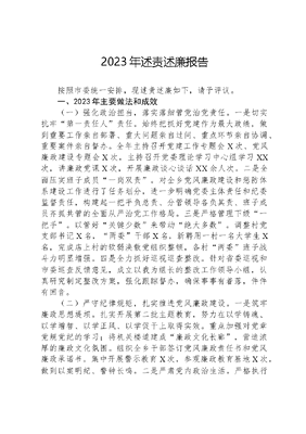 2023年述责述廉报告按照市委统一安排,现述责述廉如下,请予评议。一、2023年主要做法和成效(一)强化政治担当,落实落细管党治党责任。一是切实抗牢第一责任人责任。始终把抓好党建作为最大政绩,做到重要工作亲自部署、重大问题亲自过问、重点环节亲自协调、重要案件亲自督办。全年主持召开党建工作专题会X次、党风廉政建设专题会X次,主持召开党委理论学习中心组学习XX次,讲廉政党课X次,开展廉政谈心谈话XX余人次。二是全面压实班子成员一岗双责。对全乡党风廉政建设和惩防体系建设工作进行了任务划分,进一步明确党委主体责任和纪委监督责任,构建起一把手负总责、分管领导各负其责、班子成员齐抓共管的全面从严治党工作格局。三是严格管理下级一把手。以管好关键少数来带动绝大多数。调整村党支部书记X名,两委干部X名,新聘用一村一名大学生X名,完成店上村的软弱涣散党组织整顿,各村两委班子战斗力明显增强。四是全力抓好巡视巡查整改。针对省委巡视和市委巡查反馈意见,成立以我为组长的整改工作领导小组,认真研究制定整改方案,强化跟踪督办,确保事事有着落,件件有回音。(二)严守纪律规矩,扎实推进党风廉政建设。一是筑牢廉政思想堤坝。扎实开展第二批主题教育,努力在以学铸魂、以学增智、以学正风、以学促干上取得实效。重点加强对党章党规党纪的学习;将机关楼道建成廉政文化长廊,营造浓厚的廉政文化氛围。组织全乡干部签订党风廉政责任书和党风廉政承诺书。集中开展警示教育X次,参观廉政教育基地X次,做到以案明纪、警钟长鸣。二是严肃党内政治生活。严格执行三重一大事项集体决议、民主生活会、组织生活会和三会一课、民主评议党员、谈心谈话等制度。三是加强机关日常管理。规范三公经费使用,修订完善了机关财务、考勤、值班值守等各项制度,进一步强化用制度管权、管人、管事、管物。四是规范村级权力运行。全面推行村级小微权力清单制度,清单包含村级党务管理事项、村级重大决策事项、村级事务管理事项、阳光公开事项、民生服务事项X大类XX项内容,实现了村级组织和村干部小微权力内容的全覆盖。五是全力支持监督执纪。对重点工作、重点环节、重点岗位涉及人员定期开展监督检查,及时掐灭风险苗头。乡纪委坚持有案必查,通过财务审计、群众来信来访、党员座谈会等手段,积极寻找案源,加大办案力度,严肃查处党员干部违法违纪行为。全乡共办理案件XX件,给予党纪处分XX人。(三)注重修身律己,永葆清正廉洁本色。一是带头廉洁自律。严格执行中央八项规定及其实施细则精神,严格执行廉洁自律有关规定,从每件小事做起,把每个小节管好,增强拒腐防变能力。二是带头遵纪守法。时刻用党的纪律规矩约束自己,在做人做事做官上有原则、有底线、有规矩。自觉用法治思维和法治方式推动发展、化解矛盾、维护稳定。三是带头务实担当。坚持问题导向,全力以赴抓好基层党建、人居环境、乡村治理、产业发展、项目建设、招商引资、安全生产等重点工作落实,推动乡村振兴高质量发展。二、存在问题和不足一是理论学习不够深入。对党的理论、方针政策在融会贯通、学以致用、知行合一上存在脱节问题。二是统筹用力不够均衡。对全乡经济发展方面思考多、用力多,对党风廉政建设方面抓得不够细致。三是监督管理有待加强。工作安排部署多,跟踪问效少,责任追究力度不大。三、2024年工作打算(一)抓好学习教育。真学真懂真信真用党的创新理论,把学习成果转化为更务实的举措,在推动发展上下实功建新功。始终保持勤勉务实、艰苦奋斗、勤俭节约的优良作风,以上率下带动形成担当尽责、争先进位的发展氛围。(二)抓牢监督管理。突出问题导向,立足我乡实际,聚焦百姓身边事、贴心事、具体事,聚力用劲、重点突破,切实让群众看到变化、见到成效、得到实惠。通过谈心谈话、批评教育、诫勉谈话以及党员群众监督等手段加强日常管理,及时解决党员干部身上苗头性、倾向性问题。(三)抓实责任追究。加强执纪问责,坚决抵制为官不为廉而不勤、消极怠工等各种不正之风,做到执纪必严、违纪必究,确保党中央和省委、市委决策部署落到实处。