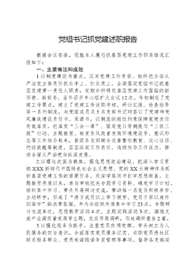 党组书记抓党建述职报告根据会议安排,现就本人履行抓基层党建工作职责情况汇报如下:一、主要做法和成效1.以制度建设为重点,压实党建工作责任。始终把全面从严治党主体责任抓在手上、扛在肩上,全面落实党组书记抓基层党建第一责任人职责,定期分析研究基层党建工作面临的新形势、新任务,全年召开中心组扩大会议12次。年初制定了党建工作要点,建立了党建工作述职考核、研讨汇报、检查指导等一系列制度,与党组成员及5名支部书记均签订了党建和党风廉政建设责任书、承诺书,以制度的刚性约束保障党建责任有效落实。把落实三会一课、固定党日等制度与三抓三促行动、主题教育、转变作风改善发展环境建设年、意识形态等工作结合起来,督促各支部健全完善警示教育、谈心谈话、约谈提醒等制度,层层压实工作责任,逐级传导工作压力,推进全面从严治党向纵深发展。2.以理论武装为载体,强化思想政治建设。把深入学习贯彻XXX新时代中国特色社会主义思想、党的XX大精神作为抓好基层党建工作的首要任务,在深学笃用中打牢思想根基。主题教育开展以来,亲自审核把关专题学习资料、确定学习计划、组织集中学习、带头开展研讨交流,带动每一名党员积极参学、主动研学,形成了班子成员以上率下领学、党员干部以身作则深学的浓厚氛围。年内共组织开展集中学习23次,专题研讨交流8次,思想教育活动4次,主题实践活动3次,围绕文旅产业高质量发展等主题,扎实开展调研,形成调研报告2篇。3.以强化服务为抓手,注重党员作用发挥。带头树立为人民服务的宗旨意识,全面落实党员服务记实、在职党员进社区联系服务群众、党员承诺践诺争星管理等事项,督导各支部深入开展党员干部担使命、践承诺活动,每名党员都明确了自己的共性服务承诺和具体服务事项,有效激发全体党员干部的为民情怀和服务热情。结合乡村振兴、街长制、环境综合整治等工作,组织党员干部积极开展走访慰问、文化下乡、法制宣传、美化环境、文明交通劝导等活动,年内共开展党员志愿者服务活动16场次,充分发挥了党员的先锋模范作用,增强了党组织的凝聚力、号召力和向心力。4.以专项整治为突破,切实推进工作落实。始终把抓整改、促落实、转作风紧盯不放,将主题教育专项整治与省委巡视、审计专项巡视、生态环保督察反馈问题整改及开展作风建设年活动、四察四治专项行动和解决中梗阻问题结合起来,认真思考谋划,在系统各支部深入组织开展大排查、大整治、回头看活动。对标六个方面深入检视问题,对梳理归纳出的班子8条问题和班子成员17条问题,全部建立了检视问题清单,坚持即知即改、真改实改的原则,查摆出的所有问题都全部整改落实到位,实现了用问题整改落实倒逼作风好转的目的。二、存在的问题及原因一年来,在抓基层党建工作过程中,虽然取得了一定的成绩,但也存在一些不可忽视的问题和不足。主要表现在:一是对新形势下抓基层党建的新举措有所缺乏。面对新时代基层党建工作的新情况、新问题、新任务,作为党组书记,自身解放思想、求实创新的思想自觉和行动自觉还不够高,解决问题的思路还不够宽、办法还不够多。二是抓基层党建的针对性还有待加强。现有5个支部的党建标准化建设水平参差不齐,在抓基层党建过程中,还存在针对性不够强、对症下药不足的现象。三是在党员学习教育上还抓的不够紧。平时只注重于通过党员大会、中心组扩大会议抓集中学习,对党员的个人自学还抓的不够紧,导致党员干部对新思想、新理论、新政策的实质内涵学习不够深入,掌握不够全面。产生问题的原因主要有三个方面:一是缺乏与时俱进的创新思维。对新时代抓党建工作的研究思考不够,没有很好地把抓党建与抓业务结合起来,存在凭老经验、老办法抓工作的情况,创新意识有所缺乏。二是缺乏持之以恒的韧劲狠劲。由于文旅业务工作比较繁重,没有经常性地深入各支部检查指导党建工作,平时从宏观方面指导的多,从细节方面了解的少,肯定成绩的多,查摆问题的少,对发现的一些苗头性问题缺乏动真碰硬、一抓到底的狠劲。三是缺乏深入系统的学习教育。在思想政治学习方面形式比较单一,内容不够全面,带着问题学、带着思考学、带着工作学做的不够到位。三、下一步工作打算1.强化学习教育,提高思想觉悟。积极适应新形势下抓党建工作的新要求,结合三会一课等制度,深入开展主题教育,不断创新学习载体、丰富学习形式,深化学习XXX新时代中国特色社会主义思想和党的XX大精神,用党的最新理论成果武装头脑。年内举办读书班2次以上,开展研讨交流活动4次以上,召开党组中心组学习会议12次以上,通过扎实学习,不断增强四个意识,坚定四个自信,做到两个维护。2.强化统筹谋划,提升党建水平。把党建工作与业务工作紧密结合起来,同抓共管,统筹推进,按照党支部标准化建设要求,做到党建工作与业务工作同研究、同部署、同督促、同考核,使党建工作与业务工作深度融合、相互促进,努力