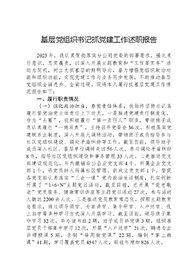 基层党组织书记抓党建工作述职报告2023年,我认真贯彻落实分公司党委的部署要求,强化责任意识,忠实履责,以深入开展主题教育和工作落实年活动为契机,树立大抓基层的鲜明导向,着力增强党组织政治功能和组织功能,实现党建工作与业务同步发展,不断推动基层党组织全面进步、全面过硬。现将本人履行抓基层党建工作情况报告如下:一、履行职责情况(一)强化政治担当,夯实责任体系。我始终坚持在认真履行管党治党主体责任上下功夫。一是推进党建责任制度化。作为头雁,我积极履行第一责任人职责,带领班子成员认真履行一岗双责,主持召开党委会36次。积极落实党建联系点制度,深入开展大调研活动,带领班子成员指导参与社区党组织建设、调处矛盾纠纷等工作。截至目前,领导班子成员深入社区、基层单位调研走访56人次、参与调处矛盾纠纷8件,指导社区党组织建设和事务管理33人次。二是推进党支部建设规范化。年内撤销非公企业党支部4个,所属企业党支部1个,将党员纳入所属社区管理。新成立党支部1个。督促各党支部认真落实三会一课党内政治生活制度,扎实创新开展了1+6+N主题党日活动,截至目前,已开展爱老敬老党员服务、健康常识讲座等主题党日活动27次,参与活动人数达2200余人次。三是推进党员教育常态化。按照主题教育总要求,通过领导领学、专家讲学、集中研学、入户送学、线上自学等多种学习方式深入开展学习。截至目前,领导班子集中学习32次,举办读书班2期,班子成员讲党课3期,组织基层党员干部集中学习12次,开展入户送学21次,聘请专业讲师授课5期,录制每周微党课22期,编制掌上微课41期,学习覆盖党员4547人次,较往年增加826人次。(二)强化服务意识,擦亮党建品牌。我始终以党建为引领,以服务民生为重点,以打造党建品牌为载体,全力推进创建工作。一是织密党建网格。重点突出组织建在网格上、党员融入群众中,划分社区网格147个,建立网格党小组83个,形成党员中心户214户,将组织建设、民生服务、平安建设等工作纳入网格管理。一年来,开展文化活动13次、职工活动8次、普法宣传22次、发放宣传单10000余份、开展志愿服务活动33次,解决各类民生问题497件,调解下水堵塞、噪音扰民等问题引起的居民纠纷74起,纠纷率较往年下降20%。同时,开展了千名党员进网格活动,动员所属1024名党员进网格践行动,利用个人优势和特长,主动认领服务岗位。今年以来,已有476名党员到社区认领服务岗位1007个。开展服务活动41次,服务居民达451人次,较往年增加110余人次。二是优化服务效能。依托网格+服务模式,建立了市政服务队,主动对接社区网格员,坚持365天为居民服务,及时处理居民诉求。截至目前,维修、更换马葫芦盖34处,维修路灯97盏,铺设小区沥青路面3处,更换楼栋号码牌434个。抢修室外供水管道20次,疏通排水管道40余处,抢修供热管道11次,解决居民供热设施气塞415次,居民满意率100%。同时,聚焦行动,开展环境卫生整治攻坚克难行动,对城区白色垃圾、道路杂物等进行清理,开展了城镇绿化美化百日行动,移栽花苗约5000余株,移栽树木2000余棵。三是搭建服务桥梁。将党建发展和服务为民落实处,在区域内形成党建共建合力。配合局直辖区内民政局、城管执法局等14家派驻机构,为居民提供优质服务。同时,与辖区内医院、银行、学校等40余家驻区单位开展共驻共建活动。截至目前,开展爱心义诊活动17次,上门办卡活动21次,捐书进社区活动1次,受益居民达1500余人次。(三)强化作风建设,严守廉洁底线。我大力支持纪委工作,积极协调,全面落实党风廉政建设和反腐败工作责任制。一是加强制度约束。坚持从严管理干部,进一步健全了党风廉政建设责任制,严格落实三重一大工作制度,全年签订《党风廉政建设岗位责任状》31份。印发《谈心谈话制度》《请示报告》等制度8个。二是加强廉洁教育。带头充分利用各种会议学习上级纪委会议精神及相关法律法规。组织党员干部集中观看警示教育片5次,开展谈心谈话26次。参观红色教育基地2次,领导干部讲廉洁党课3次。三是加强专项治理。结合工作落实年活动,深入开展突出问题整治,制定了问题清单,明确整改科室、责任人、整改期限。亲自带队到基层单位开展账外资产清理检查,推动全面从严治党向基层延伸。二、存在问题及原因分析存在问题:一是党员学习教育方式不够灵活,学习形式较单一。二是党建引领基层治理的能力还不足。基层党的组织优势没有真正转化为推动基层治理的动能。三是党建品牌培育推广力度不够。提炼总结、宣传推广等方面用力不足。原因分析:一是思想认识不到位。在灵活创新载体上深入谋划和推进落实不够。二是责任压力传导不到位。没有真正将党建责任压力传导到基层党组织。三是