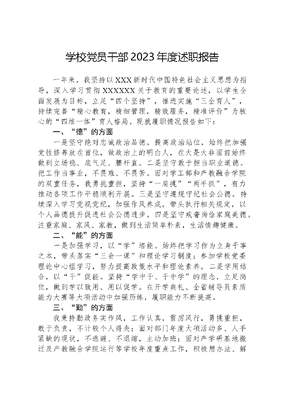 学校党员干部2023年度述职报告一年来,我坚持以XXX新时代中国特色社会主义思想为指导,深入学习贯彻XXXXXX关于教育的重要论述,以学生全面发展为目标,立足四个坚持,推进实施三全育人,持续完善精心教育,精细管理,精致服务,精准评价为核心的四维一体育人格局。现就履职情况报告如下:一、德的方面一是坚守绝对忠诚政治品德。提高政治站位,始终把加强党性修养放在首位,做政治上的明白人,在大是大非面前始终做到立场稳、底气足、腰杆直。二是坚守敢于担当职业道德。把工作当事业,不畏难、不畏苦。面对学工部和产教融合学院的双重任务,我勇挑重担,坚持一肩挑两手抓,有力推动各项工作平稳顺利开展。三是坚守遵规守纪社会公德。持续深入学习党规党纪,加强作风养成,带头执行相关规定,以个人品德提升促进社会公德进步。四是坚守戒奢尚俭家庭美德。注重家庭、家风、家教,做到生活简单朴素,生活情趣健康。二、能的方面一是加强学习,以学培能。始终把学习作为立身干事之本,带头落实三会一课和理论学习制度;参加学校党委理论中心组学习,努力提高政策水平和理论素养。二是学用结合,以干促能。坚持学中干、干中学的理念,立足岗位,做到学以致用、用以促学。在开学典礼、全省辅导员素质能力大赛等大项活动中加强历练,履职能力不断提高。三、勤的方面我秉持勤政务实作风,工作认真,雷厉风行,勇挑重担,敢于负责,不计较个人得失;面对部门年度大项活动多、人手紧缺的现状,不逃避、不退缩,主动加班;面对产学研基地搬迁及产教融合学院运行等学校年度重点工作,积极想办法、解难题,圆满完成各项工作。四、绩的方面坚持靠前推进抓落实,以事不过夜、立说立行的高效抓执行,部门各项工作圆满完成,重点汇报以下5项工作:(一)强根固本,突出党建引领。深入开展学习贯彻XXX新时代中国特色社会主义思想主题教育,通过集体学习、专家辅导、师生宣讲等形式,开展主题突出、特色鲜明的学习活动。全年组织政治理论学习15次,开展主题党日活动8次,上党课4次,支部建设规范化标准化扎实推进。2023年,支部被学校党委评为先进基层党组织,2名党员被评为优秀共产党员和优秀党务工作者。支部获评省第三批新时代高校党建工作样板支部培育创建单位。(二)牢记初心,提升育人实效。强化育人主线,成立筑基宣讲团,打造周四政治学习学习时刻等品牌,全年开展学生政治理论学习1300余场。筑牢育人阵地,邀请党的XX大代表、全国人大代表等举办X讲坛9期,品牌建设和育人成效显著增强,新媒体平台建设取得新突破,获省级及以上荣誉6项。锤炼育人队伍,2023年114项辅导员精品项目和15项学生工作科研项目立项,获批教育部2023年高校思政工作精品建设项目1项、教育部人文社科研究项目2项、省辅导员名师工作室1项。深化国防育人成效,连续两年完成征兵任务,征兵完成率121%。(三)久久为功,筑牢安全底线。坚持结硬寨、打呆仗,进一步完善日检查、周排名、月通报、年考核工作法,建立基础管理检查长效机制,严格落实公寓每日例检、每周抽检、每月演练制度,全年共组织开展六项基础管理检查4464次,涉及检查项目71746个,全年未发生一起学生安全责任事故,学生规矩意识和文明习惯明显提升。(四)以生为本,强化精致服务。强化心理危机预防,开展重点关注学生谈心谈话5476场次,推进医校合作,建立转介诊疗机制,转介学生26名,成功化解严重心理危机28例。加强学生心理健康教育中心建设,教育部、教育厅有关领导莅临考察工作3次,获得省级及以上工作奖励10余项。持续优化学生社区服务,完成公寓日常维修5271次,应急维修21920次,连续三年获省高校学生公寓管理先进单位,在省公寓的故事主题系列活动中荣获一等奖1项,二等奖3项,三等奖1项。扎实做好资困助学服务,认定家庭经济困难学生3578人,发放各类奖助学金4380余万元,覆盖学生1.4万余人次,协助筹备成立省学生资助学会,学校当选常务理事单位、会长单位。(五)精准评价,突出五育并举。进一步完善两考核一评价体系,顺利完成学院学生工作考核、辅导员绩效考核及学生综合评价,制定并出台《X大学硕士研究生综合素质评价办法》和《X大学研究生奖励条例》,《建立健全大学生德智体美劳综合评价机制》入选2023年省教育厅完善提升类教育评价改革项目库项目。五、廉的方面在工作过程中,我严于律己,筑牢廉洁防线。在部门主要负责人岗位上,将廉洁作为立身之基,以身作则,带头遵守党规党纪,以实际行动涵养清正廉洁的干事氛围,时刻铭记清白做人、坦荡做事的准则,不断加强廉洁自律学习,以清廉为荣,时刻保持清醒头脑。六、存在不足一是工作效率有待进一步提升。有时头绪多、事项杂,容易出现顾此失彼,导致工作效率降低。二是工作视野还需进