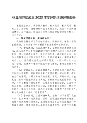 林业局党组成员2023年度述职述德述廉报告根据党组分工,我分管人教科、机关党委、机关纪委、机关工会、老干科、动植物科和国有林场工作。现将一年来的政治建设、工作履职、意识形态及党风廉政建设情况报告如下,请予评议。一、强化理论武装,保持政治定力我始终坚持把学习作为锤炼党性、提高素质、增长才干的重要途径,努力在学习中不断提高自身素质和工作水平。(一)学思践悟,提高理论水平。坚持把政治建设摆在首位,深入开展学习贯彻XXX新时代中国特色社会主义思想主题教育,深入抓好理论学习、强化思想引领、净化政治生态。参加主题教育读书班集中学习7天,专题研讨4次,调研成果交流会2次。督促局机关党支部深入开展一月一课一片一实践活动,跟进青年理论小组集中学习进度,推动主题教育走深走实。(二)学用结合,提高履职能力。自觉联系自己的思想、工作和生活实际,时时刻刻本着发现问题、解决问题、提升能力的原则,对照自身存在的差距、不足,深刻剖析、自我反省,有针对性地开展学习实践,不断提升自我党性修养。同时,将学习教育与岗位履职、工作落实等紧密结合,认真学习林业政策、法律法规等专业知识,不断丰富专业知识、提升专业能力、锤炼专业作风、涵养专业精神,多掌握几把刷子,努力成为林业工作的行家里手。(三)学以致用,注重调查研究。坚持四下基层优良作风,扎实开展走找想促活动,深化调查研究破解难题,围绕发挥党建引领作用,推动党建与业务工作深度融合专题调研课题,带着问题深入基层开展调查研究,并进行工作指导、政策宣传,广泛听取民声民意,掌握一手资料,吸收了好的经验做法,完善了不足缺陷,有力促进了党建业务两手抓、两手硬。二、认真履职尽责,完成重点工作我坚持主动担当作为,紧紧围绕林业中心大局,真心谋事尽心干事,分管的各项工作顺利推进,均取得了显著成效。(一)建强基层组织。围绕基层组织、基础工作、基本能力三项重点,推动党建资源转化为发展资源、党建活力转化为发展活力。制订下发《2023年机关党的建设工作要点》,建立健全党建考评机制。完成4个机关党支部换届选举,改善优化支委队伍结构,建强上下贯通、执行有力的组织体系。坚持把学习贯彻XXXXXX重要讲话、重要指示批示精神作为党组会第一议题。坚持局领导联系党支部制度,加强对党支部日常督导检查,建立党支部工作互查互看机制,推动党建重点任务落地见效。(二)创建党建品牌。创建林长制看X党建品牌,立足工作实际,创新党建+绿水青山党建+绿色卫士党建+绿色惠民党建+绿色品牌党建+绿色先锋五个创建载体,做好党建+文章,提升党建工作的内在动力和活力,促进党建和业务的高度契合和融合发展,全力助推X林业高质量发展。(三)管好意识形态。局党组认真落实意识形态全面领导责任,成立意识形态工作领导小组,完善意识形态工作分析研判、专题汇报等工作机制,把意识形态工作纳入综合绩效考评,与业务工作同部署、同落实、同检查、同考核。邀请市委宣传部卫兵副部长作意识形态工作专题辅导,深入学习XXXXXX关于意识形态工作的重要论述,切实提高防范和化解意识形态领域风险的能力水平。突出舆论正面引导工作,充分运用新媒体、自媒体平台,讲好林业故事、传播林业声音,巩固壮大主流思想阵地,推动形成网上网下一体、内宣外宣联动的主流舆论格局,确保各类意识形态阵地可管可控。(四)提升干部素质。按照市委四敢文件要求,切实加强机关党员干部理论学习、能力培训和实践锻炼,弥补知识弱项、能力短板、经验盲区,全力建设高素质专业化的X林业干部队伍。定期举办青年理论学习小组学习研讨,邀请资深专家开展公文写作讲座、新闻宣传业务培训、青年干部能力提升专题讲座等,并在机关交流分享学习收获体会。开展忆初心感党恩赞清廉主题演讲比赛,18名年轻党员结合学习贯彻党的XX大精神和工作实际谈初心、述担当。(五)严格选人用人。紧密结合工作新形势、新任务,强化责任担当、服务发展大局,突出政治标准做好选人用人工作,努力为林业高质量发展提供坚强组织保障和人才支撑。2023年,完成调任2人、公开选调2人、提拔7人、内部调整6人人事手续,完成公开遴选1人、公开招聘2人、公务员招录2人、四海揽才5人入职手续,多引才、快引才、引良才,使局系统干部年龄结构、学历层次得到进一步优化,林业人才蓄水池得到进一步扩容。凡涉及干部人事调整,提前与纪检组沟通,2023年共征求廉政情况意见45人次,出具廉洁自律结论性意见2人次。(六)开展清廉建设。聚焦红色护绿、碧水净心、清风惠民三个维度,深入推进清廉林业建设,打出以制度建设、清廉单位建设、宣传倡议、谈心谈话、警示教育、专项整治等为内容的系列廉味组合拳。打造机关清廉文化走廊,以积极向上的政治文化涵养良好机关政治生态。推动省委第七巡视组反馈意见整改