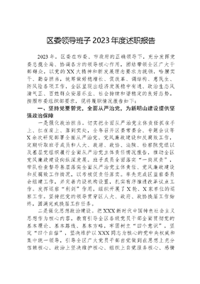 区委领导班子2023年度述职报告2023年,区委在市委、市政府的正确领导下,充分发挥党委总揽全局、协调各方的领导核心作用,团结带领全区广大干部群众,以党的XX大精神和新发展理念要求为统领,哈腰实干、勤奋担当,统筹做好稳增长、促改革、调结构、惠民生、防风险各项工作,全区呈现出经济发展稳中有进、政治生态风清气正、百姓群众安居乐业、社会持续和谐稳定的良好态势。按照市委组织部要求,现将履职情况报告如下:一、坚持党要管党,全面从严治党,为新明山建设提供坚强政治保障一是强化政治担当。切实把全面从严治党主体责任抓在手上、扛在肩上、落到实处,全年召开区委常委会、专题会议等X余次研究部署全面从严治党、党风廉政建设和反腐败工作,定期听取班子成员和人大、政府、政协、法院、检察院党组以及基层党组织履行全面从严治党主体责任情况报告,推动全区党风廉政建设向纵深发展。班子成员全面落实一岗双责,带队检查督导基层落实全面从严治党主体责任、党风廉政建设和反腐败工作情况,以考核促责任落实。率先完成区监察委员会组建工作,并完善内设机构设置,扎实有序推进改革试点工作。发挥巡察利剑作用,组织开展了X轮、X家单位的巡察工作。坚持把党的领导贯穿区人大、政府、政协换届工作始终,圆满完成换届工作任务。二是强化思想政治建设。把XXX新时代中国特色社会主义思想作为核心内容,教育引导全区各级党员干部全面贯彻党的基本理论、基本路线、基本方略,牢固树立四个意识,坚定四个自信,坚决维护以XXX同志为核心的党中央权威和集中统一领导,引导全区广大党员干部自觉做到在思想上充分信赖核心、政治上坚决维护核心、组织上自觉服务核心、感情上深刻认同核心、行动上坚决紧跟核心。牢牢把握意识形态的领导权、管理权和主动权,积极培育和践行社会主义核心价值观,凝聚全社会的思想政治共识。注重加强家庭家教家风建设,开展家文化创建,以良好的家风带动社风民风政风向善向上。三是规范干部监督和管理。区委坚持严字当头,严格执行《党政领导干部选拔任用工作条例》,全面落实新时代好干部标准,把德才兼备、以德为先贯穿干部工作全过程,注重在发展实践、工作一线、群众口碑中选拔、考察、检验干部,全区上下形成了人心思上、人心思进、人心思干的生动局面。强化干部日常监督管理,进一步完善干部谈话制度、诫勉制度,严格按照谈话规定履行谈话手续,针对谈话对象的岗位特点及廉政风险点,制定谈话方案,提高谈话效果,全年开展廉政、任职、诫勉、信访等谈话X余人次。严格执行请示报告制度,我带头如实填报个人有关事项报告,区管干部全部签订了廉政档案登记表。严格执行领导干部经济责任审计制度,对X名党政正职领导干部进行离任经济责任审计。坚持党管人才原则,完善机制,落实政策,统筹推进各类人才队伍建设,人才培养和引进工作走在全市前列。四是严肃党内政治生活。全面落实三会一课等党内政治生活制度,启动培训指导、督导检查、考核通报联动机制,推动党的组织生活制度化、经常化、规范化。我和四大班子成员带头参加双重组织生活,深入联系点和所在党支部讲党课X余次。发挥基层党建指导站作用,全方位培训和精细化指导基层党组织书记、党务工作者X余人次,有效提升了支部书记抓党建的能力水平。五是深入推进党风廉政建设。开展用身边事教育身边人警示教育活动,精心选取区内典型案例进行深刻剖析,使广大党员干部在受到深刻触动和教育的同时,进一步筑牢拒腐防变思想防线。坚持不懈纠治四风,扎实开展违反中央八项规定和侵害群众利益问题专项整治、扶贫领域和吃空饷问题专项检查,全区党风政风持续向好。坚持以零容忍态度惩治腐败,共立案X件,给予党政纪处分X人,纪律审查工作继续走在全市前列。严查快办省委巡视组交办信访举报X件,梳理问题线索X件,立案X件,给予X人党政纪处分。二、坚持稳中求进、奋发作为,全区经济社会平稳健康发展一是地区经济企稳向好。切实加强和改善党对经济工作的领导,进一步优化产业结构,强力助推实体经济发展。狠抓项目建设,全市考核的X个重点项目开复工率达100%。长江农产品智能物流交易中心项目全速推进;东大中试基地耐磨材料实现生产。加大招商引资力度,全年开展走请活动X余次,新签约鑫城·兴隆大家庭等项目X个。扎实推进X等项目快速推进,市中心医院新建综合病房楼脑科门诊实现开诊,实验学校主体完工。梁家保障房一期实现回迁入住,恒大、绿地、佳兆业入住人数突破X人,人气不断积聚。积极推进供给侧结构改革,关闭煤矿X家,化解过剩产能X万吨,销售商品房X万平方米。突出抓好财源建设、征收管理、资金监管,加强对政府性债务、养老保险、金融等领域风险的防范化解,系统内债务控制在债务限额以内。二是群众幸福指数不断提升。始终把保障和改善民生工作放在突出位置,加大财力向民生倾斜力度,不断满足人民日益增长的美好生活需要,年