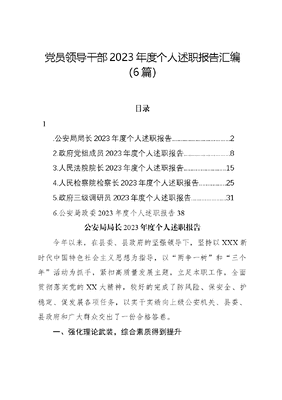 党员领导干部2023年度个人述职报告汇编(6篇)目录1.公安局局长2023年度个人述职报告..22.政府党组成员2023年度个人述职报告.83.人民法院院长2023年度个人述职报告.154.人民检察院检察长2023年度个人述职报告.255.政府三级调研员2023年度个人述职报告316.公安局政委2023年度个人述职报告38公安局局长2023年度个人述职报告今年以来,在县委、县政府的坚强领导下,坚持以XXX新时代中国特色社会主义思想为指导,以两争一树和三个年活动为抓手,紧扣高质量发展主题,立足本职工作,全面贯彻落实党的XX大精神,较好的完成了防风险、保安全、护稳定、促发展各项任务,以实干实绩向上级公安机关、县委、县政府和广大群众交出了一份合格答卷。一、强化理论武装,综合素质得到提升一年来,自己始终将理论学习作为增强履职能力、提升综合素养的重要抓手,通过集中学习和个人自学、理论学习和实践运用相结合,不断适应新形势、新要求,推动各项工作走深走实。一是强化政治理论学习。结合第二批主题教育,深学笃行XXX新时代中国特色社会主义思想、党的XX大报告、XXX法治思想、XXXXXX历次来陕考察重要讲话精神以及XXXXXX关于加强和改进人民信访工作重要指示批示精神,严格落实第一议题制度,党委理论学习中心组集体学习xx次,撰写学习心得xx篇,交流研讨xx篇,讲党课x场次,切实增强四个意识、坚定四个自信、坚决做到两个维护。二是强化理论联系实际。坚持理论联系实际开展调研,准确把握县情实际和分管领域工作特点,撰写的《浅谈公安信访问题的处置途径与对策》《关于新时代背景下推进派出所主防实战体系建设的调研报告》等调研文章在省公安厅《公安理论与实践》刊物上发表,为破解基层工作难题提供了支撑。三是强化党建品牌创建。深入开展三树活动,不断深化党旗红·警徽亮党建品牌创建,扎实开展铭记嘱托忠诚担当学习实践活动,指导举办红色教育、警示教育、英模教育、廉政教育共计xx次,在急难险重任务中成立临时党组织x个,组建党员先锋队xx个,设立党员先锋岗xx个,发展党员x人,两个作用优势进一步突显,自身党性修养、政治纪律、政治规矩进一步增强,理想信念进一步坚定,对初心使命的理解进一步加深。二、认真履职尽责,各项工作稳步推进一年来,紧盯目标任务,服务和保障全县高质量发展,推进各项工作有力有序开展,分管领域成效显著。一是聚焦风险隐患防控、强化基层社会治理。全县公安机关共破获刑事案件xxx起,打击处理作案成员xxx人,抓获网上逃犯xx人。常态化推进扫黑除恶斗争,核查涉黑涉恶线索x条,破获九类涉恶案件x起。坚持总体国家安全观,加大打击,强化舆论管控,国保大队被省公安厅评为全省国保战略支撑点和一级国保大队。破获命案积案x起,全省公安机关信息库建设成果及破案推进会暨全省DNA新技术推进会、全市刑侦工作会相继在我县召开。侦办xx五乱生态环境类刑事案件xx起,查处各类破坏森林和野生动植物资源案件xx起,森警大队在xx行动中被省厅评为先进集体。扎实开展两大专项行动和夏季行动,组织治安巡查宣防行动xx轮次,出动警力xxxx余人次,受理治安案件xxx起,县局夏季行动被省厅通报表扬、被市委、市政府评为全市人民满意政法单位和全市扫黄打非先进集体。积极推动派出所主防改革,xxxx公安改革经验在全省公安机关推广,深入开展爱警暖警和心理健康服务工作,全市公安机关心理健康现场会在我县召开。三所一庭一中心矛盾纠纷多元化解机制和四定六断三同步两机制一队伍信访工作法受到省、市领导批示肯定,全市公安机关矛盾纠纷排查化解现场会在我县召开。建成依托巡特警智慧街面巡防系统的民辅警带领小区内部保安、网格员、义务巡逻队员的x+N网格化巡防机制,建成智慧安防小区x个,完成全县范围内xx.x万门楼牌号编号、制作,并督促全部安装悬挂,为服务保障xx经济社会高质量发展作出贡献。二是深化法治政府建设,推动法治建设率先突破。严格执行党政主要负责人履行法治建设第一责任人职责、一规划两方案及八五普法规划,推动述法点评双xxx等法治建设重点任务有效落实。共举办领导干部法治报告xx场次,受教育领导干部xxxx余人次,配备各中小学法治副校长xx名,为师生作法治报告xxx场次,受教育师生x.x万人次,累计开展法律九进活动xxx余场次。突出重要节点+每月一主题法治宣传活动,组建八五普法小分队开展法治文艺巡演、法治宣传等活动