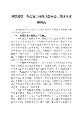 县委常委、办公室主任在纪委全会上的述责述廉报告按照会议安排,现将个人履行全面从严治党主体责任和廉洁从政情况报告如下。一、在落实主体责任上严实有力(一)坚定站稳政治立场。始终坚持以XXX新时代中国特色社会主义思想为指导,认真领会XXXXXX关于全面从严治党的重要论述,严守党的政治纪律和政治规矩。常态化学习《中国共产党廉洁自律准则》《关于新形势下党内政治生活的若干准则》等党内觃范性文件,不断提高政治三力,坚决把拥护两个确立、做到两个维护践行到工作的方方面面,切实做到党中央提倡的坚决响应,决定的坚决执行,禁止的坚决不做,确保政令畅通。(二)持续抓好理论学习。深入开展学习贯彻XXX新时代中国特色社会主义思想主题教育,通过带领学、自主学、交流学等方式,认真研读党的XX大报告和党章,学习《XXX著作选读》《XXX新时代中国特色社会主义思想专题摘编》等,努力做到学习抓实、思考求深、实践见效,切实用党的创新理论武装头脑、指导实践、推动工作。参加县委常委会会前学纪学法,不断提升纪法意识和依法行政能力,自觉运用法治思维和法治方式深化改革、推动发展、化解矛盾、维护稳定,严格依法决策、依法行政、依法办事。(三)从严履行主体责任。全力协助县委及县委书记抓好党风廉政建设、意识形态相关工作,全面营造良好政治生态氛围。结合县委关于全面从严治党的要求以及个人分管领域工作实际,制定全面从严治党主体责任清单、个人履行党风廉政建设工作计划,做到重要工作、重大问题、重点环节认真过问及时处置,一一入脑入心入手。在分管领域、联系镇干部职工大会等会议上,安排部署党风廉政建设工作X余次,引导党员干部树牢政治意识,严栺执行党风廉政建设各项规定。二、在强化日常监管上精准发力(一)狠抓风险防控和问题整改。全覆盖与分管部门主要负责同志深入谈心谈话X轮,从思想认识、班子队伍、工作状态、生活作风等方面,帮助发现问题、查找不足,共同研究分析单位权力运行中的廉政风险点,结合实际制定防范措施,确保统一思想、带好队伍。将巡察整改工作作为深入推进全面从严治党、加强班子和队伍建设的重要抓手,紧盯县委巡察组反馈巡察分管部门的X个问题,研究制定X项整改措施,督促相关部门全面落实整改主体责任,截至目前上述问题已整改完毕。(二)狠抓廉政教育和底线思维。坚持把纪律和规矩挺在前面,深入开展警示教育,组织分管领域干部参观X教育基地、收看X、学习典型案例警示教育读本X,并在重大活动、重要时间节点对分管部门主要负责人进行廉洁提醒。邀请派驻纪检监察组负责同志与分管领域领导班子和干部职工进行廉政谈话X余次,坚持做到警钟长鸣,抓早抓小未病先防,不断深化纪律教育和廉洁文化教育,筑牢拒腐防变的思想道德防线。近年来分管领域没有出现任何违纪违法的人和事。(三)狠抓作风建设和基层治理。按照县委X部署要求,聚焦X等重点工作,到乡镇、企业、项目调研X余次,解决了X等实际问题,助力企业纾困解难;多次为分管部门和联系镇作形势研判,反复强调作风建设对保障工作的重要性,引领带动分管部门以日结日清、事不过夜的工作态度和马上办、务实干的工作作风,从严从速落实县委决策部署。2023年,X获评全省X。三、在保持清正廉洁上持续用力(一)忠诚为先明大德。始终坚定四个自信,增强四个意识,在思想上政治上行动上同以XXX同志为核心的党中央保持高度一致。自觉做到在大是大非面前旗帜鲜明,在大风大浪面前无所畏惧,在各种诱惑面前立场坚定。经常反省自己X,经常扪心自问X,不断找差距、补短板、抓落实,以坚决落实党中央各项决策部署的实际行动诠释对党的绝对忠诚。(二)人民至上守公德。坚定践行以人民为中心的収展思想,用脚步丈量民情,用真心倾听民意,千方百计解决好群众的急难愁盼问题。传承和弘扬四下基层的优良传统,组织筹集资金X余万元,开展X等帮扶活动。倾心服务青年成长,争取XX余万元,努力让发展更有温度,让并福更有质感。(三)清廉为本严私德。贪婪是最可怕的贫穷,满足是最真实的财富。我严栺遵守中央八项规定精神和省、市及其实施细则,时刻牢记身份,保持亲清政商关系、营造最优营商环境,坚决抵御不良思想和行为侵蚀。培养良好的个人爱好,保持高尚的精神追求,涵养简朴的生活作风,做到人前人后一个样、有无监督一个样、八小时内外一个样,管好身边人,珍惜组织培养,不负信任嘱托。