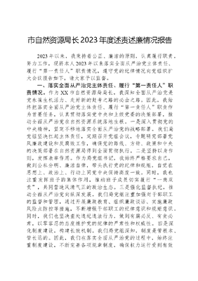 市自然资源局长2023年度述责述廉情况报告2023年以来,我秉持着公正、廉洁的原则,认真履行职责,努力工作,现将本人2023年以来落实全面从严治党主体责任、履行第一责任人职责情况,遵守党的纪律情况向党组织扩大会议报告如下,请大家予以监督。一、落实全面从严治党主体责任、履行第一责任人职责情况。作为XX市自然资源局局长,我深知全面从严治党是党永葆生机活力、走好新的赶考之路的必由之路。因此,我始终把落实全面从严治党主体责任、履行第一责任人职责作为首要任务,认真贯彻落实党中央和上级党委的决策部署,推动全面从严治党在自然资源系统落地生根。一是深入贯彻党的中央精神,坚定不移地落实全面从严治党的战略部署。我们局党组坚决扛起主体责任,定期召开党组会议,专题研究部署党风廉政建设和反腐败工作,确保党的路线、方针、政策和中央的决策部署在自然资源局得到全面贯彻执行。二是坚持以身作则,发挥表率作用。作为局党组书记,我始终严格要求自己,做到公私分明、廉洁自律,带头执行党的纪律和规矩,自觉在思想上、政治上、行动上同党中央保持高度一致。同时,我也注重发挥班子的集体作用,推动班子成员切实履行一岗双责,共同营造风清气正的政治生态。三是强化监督执纪,推动全面从严治党向纵深发展。我们局党组注重加强对干部职工的监督和管理,通过开展廉政教育、组织廉政谈话、实施廉政风险点防控等措施,不断增强干部职工的纪律意识和规矩意识。同时,我们也坚决查处违纪违法行为,做到有腐必反、有贪必肃,以零容忍的态度维护党的纪律的严肃性和权威性。四是深化制度建设,构建长效机制。我们局党组深知,制度是管根本、管长远的。因此,我们在落实全面从严治党的过程中,始终注重制度建设,不断完善各项规章制度,确保权力运行受到有效制约和监督。我们建立了党风廉政建设和反腐败工作的责任清单,明确了各级领导干部的职责和任务,形成了齐抓共管的工作格局。同时,我们还加强了对制度执行情况的监督检查,确保各项制度落地生根、发挥实效。二、遵守党的纪律情况。作为一名党员领导干部,我深知党的纪律是党的生命线,是维护党的团结统一、保持党的先进性和纯洁性的重要保障。因此,我始终严格遵守党的政治纪律、组织纪律、群众纪律、工作纪律、生活纪律等各项纪律规定,做到言行一致、表里如一。一是严格遵守党的政治纪律和政治规矩。我始终坚持以XXX新时代中国特色社会主义思想为指导,不断增强四个意识,坚定四个自信,做到两个维护,始终在思想上、政治上、行动上同党中央保持高度一致。我坚决贯彻执行党的路线、方针、政策和中央的决策部署,不打折扣、不搞变通,确保政令畅通。二是严格遵守党的组织纪律。我始终坚持民主集中制原则,认真执行党组决策程序,充分发扬党内民主,确保决策的科学性和民主性。我注重加强班子团结,坚持大事讲原则、小事讲风格,营造和谐共事的良好氛围。同时,我也严格遵守干部选拔任用规定,坚持五湖四海、任人唯贤,确保选人用人的公正性和准确性。三是严格遵守党的廉洁纪律。我始终保持清醒头脑,牢记廉洁自律的重要性,自觉遵守党的廉洁纪律和各项规定。我严格执行中央八项规定及其实施细则精神,坚决反对形式主义、官僚主义、享乐主义和奢靡之风,切实做到公私分明、廉洁奉公。同时,我也注重加强对亲属和身边工作人员的教育和约束,防止他们利用我的职务谋取私利。三、存在的问题。虽然我在2023年度的工作中取得了一些成绩,但我也深知自己还存在一些问题和不足。首先,我在工作中有时过于注重细节,导致工作效率不够高。其次,我在与下属沟通时,有时表达不够清晰,导致下属理解有误。最后,我在工作中有时缺乏创新思维,未能及时应对一些新情况、新文可居文库——海量学习资料,手机电脑均可下载www.wenkeju.com问题。四、下一步工作计划。一是加强理论学习,提高自身素质。我将继续深入学习党的理论和路线方针政策,不断提高自己的政治素质和业务能力,以更好地履行职责和完成任务。二是优化工作流程,提高工作效率。我将进一步梳理工作流程,精简办事环节,提高工作效率,确保工作质量和效率的双提升。三是加强沟通协调,促进团队合作。我将注重加强与下属的沟通协调,明确工作要求和目标,促进团队合作,形成工作合力。四是加强创新思维,应对新情况新问题。我将积极学习新知识、新技能,增强创新意识,不断探索新的工作方法和思路,以更好地应对新情况、新问题。文可居文库——海量学习资料,手机电脑均可下载www.wenkeju.com