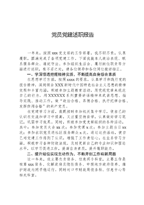 党员党建述职报告一年来,按照xxx党支部的工作部署,我尽职尽责,认真履职,圆满完成了各项党建工作。下面我就本人政治表现、联系服务群众、遵纪守法、参加组织生活会、履行岗位职责等方面进行述职,有不妥之处,请各位领导和各位同仁批评指正。一、学深悟透把握精神实质,不断提高自身综合素质在思想学习方面,按照xxxx的要求,认真学习和践行党的报告精神,深刻领会XXX新时代中国特色社会主义思想的精神实质和丰富内涵,积极参加主题教育活动,用党规党章来规范自己的行为,用XXXXXX系列重要讲话精神来武装思想、指导实践、推动工作,做政治合格、品德合格、执行纪律合格、发挥作用合格的共产党员。在党建学习方面,我既按时参加机关集中学习,使自己的认识在交流和学习中提高,又注重坚持自学,认真做好学习笔记,巩固学习效果。同时,积极参加党支部组织的各种活动,其中:参加党员大会xx次;参加党课x次;参加主题当日xx次;参加在职党员进社区服务群众x次。通过这些活动,使自己对党建工作得到了认识,增强了工作责任心。在业务学习方面,积极学习各种财政法规,及时更新自己的专业知识和理论水平,以学习促进工作,提高自身素质,提升履职能力。二、提升站位实现主动作为,不断开创工作崭新局面这一年来,我主要负责债务、信息两个科室,主要工作是核算xxx债务、化解政府及隐性债务、申报地方政府债券、维护财政内网平稳运行。同时对口市财政局债务科、信息中心等相关科室。1.核算xxx债务,做好xxx年xxx债务还本付息,按计划还本付息。2.申报地方政府债券,xxx年申请地方政府债券项目x个,申请债券额度xx亿元,保障了xxx棚改项目、幼儿园项目的顺利实施。3.维护、升级、录入财政内网,xxx年架构新的一体化财政系统和一卡通系统,使内网能平稳运行。三、自身存在的不足1、政治思想方面。主要体现在:还存在政治理论学习抓得不紧,投入的时间不够多,思想认识有待提高。对政治理论的认识还不够深刻,认为只要自己在思想上和行动上与党中央保持高度一致就可以了,在政治理论的学习上花的功夫不够,学习的自觉性主动性不强,指导实际工作的针对性不强。没有把作风建设同推动改革发展结合起来。2、工作作风方面。主要体现在:深入基层不够,不太了解基层实际情况,个别工作针对性不强;工作方式有时过于简单,缺乏耐心细致的沟通协调;有时没能很好处理原则性和灵活性的关系,对发生的合情不合法的事情,过于强调原则,没能找到合适的解决办法。3、担当作为方面。主要体现在:创新意识不强,工作按部就班;工作中有时有畏难情绪,不愿触及矛盾,得过且过,进取意识不够。工作中遇到公车调度困难,有时没有自力更生,自行解决,有等待车辆再工作的情况。4、廉洁自律方面。主要体现在:对自身要求不够严格,工作中原则性与灵活性把握需进一步提高,纪律观念有松懈现象。主动调研的意识不强,调查研究不深入,不细致。四、改进措施1、加强理论学习,提高自我要求。今后我不仅要系统学习中国特色社会主义理论和XXX新时代中国特色社会主义思想,还要学习熟悉相关法律法规,坚持用学习来提高自己的政治水文可居文库——海量学习资料,手机电脑均可下载www.wenkeju.com平和理论功底,持续在学懂、弄通、做实上下功夫,切实做到学思践悟、知行合一、学以致用。改进工作作风和转变工作方式,提高工作效率和执行力为落脚点,特别要在理论联系实际、科学指导实践上下真功夫,不断提高理论学习的效果。2、增强规矩意识,提高党性修养。严格要求自己,进一步增强纪律观念,自觉遵纪守法,清正廉洁、克己奉公,在工作上力争上游,在生活上方方面面起到表率和带头作用。增强责任感和使命意识,不忘初心、牢记使命,自觉抵制歪风邪气,全面、认真地学习和弘扬璀璨的、博大精深中华传统文化,从传统文化中汲取营养,努力培育和践行社会主义核心价值观,形成正确的人生观、价值观、世界观。3、改进工作作风,提高履职能力。努力求真务实,增强宗旨意识,树立无私奉献和艰苦奋斗的精神,把个人的追求融入党的事业之中、融入xxx的发展建设中,保持思想道德的纯洁性,正确对待权力、金钱、名利;扎实工作作风,坚持实事求是,不搞形式主义、官僚主义。对待工作要认真负责、谨慎细心,时刻保持如临深渊、如履薄冰的态度,坚持今日事今日毕,讲究工作效率。4、始终心系群众,坚持为民务实。牢固树立以人民为中心的发展理念,工作中坚持把群众的批评当成鞭策自己的忠言,把群众答不答应、满不满意作为一切工作的出发点和落脚点。通过到基层锻炼机会,深入开展调查研究,了解实际情况、解决困难问题,不断丰富自己的人生经历,提高服务基层服务群众的能力和水平。最后,衷心感谢近些年来领导和同事对我工作的支持和帮助。在今后的工作中