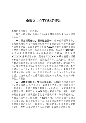 全媒体中心工作述职报告尊敬的各位领导、同志们:按照会议安排,现就本人2023年履行职责和廉洁自律情况报告如下:一、坚定理想信念,提升政治素养。作为党员领导干部,我始终把理论学习和党性锤炼作为首要政治任务和提升履职能力的重要途径。认真参加学习贯彻XXX新时代中国特色社会主义思想主题教育活动,系统研读必读书目,深入学习XXXXXX关于应急管理重要论述和重要指示批示精神,深入学习XXXXXX重要训词精神,跟进学习XXXXXX最新重要讲话精神和党中央新部署新要求,坚持联系实际、立足岗位,通过学习提高理论素养、坚定理想信念、升华觉悟境界、增强能力本领。作为党支部书记,带领支部全体党员开展专题研讨、集中学习和个人自学,提升党员干部政治理论修养。对支部党员开展经常性谈心谈话,关心党员思想动态,以及个人身体和家庭状况,让支部党员切实感受到组织的关心与支持,营造良好和谐的工作氛围。二、强化责任担当,做强主责主业。在xx局党委正确领导下,紧紧围绕xx局中心主业,认真履职尽责,各项工作取得了一定成效。一是抓好制度机制建设。4次提请xx局党委召开议宣研宣会议,制定下发《2023年度全省宣传工作计划》,重新修订全省宣传工作通报内容及考评量化标准。与省委宣传处、网信办建立长效工作机制,与xx邮政总、沈阳大学美术学院签订合作协议,联合省教育厅下发《关于做好高等学校实验室安全管理规范的通知》,制定出台《新闻宣传处政府专职员管理规定》《2023年全省宣传月活动方案》等8项制度机制和11个专项活动方案。二是抓好社会化宣传工作。部署全省开展安全常识普及,重点针对燃气、医院、高层建筑、九小场所、石化企业等进行宣传教育,累计受教人数110余万人次。组织全省志愿者、宣传大使、派驻街道文员、小区楼长等3.8万余人开展敲门入户、火灾隐患排查等行动,入户宣传率超过70%。举办xx省2023年度宣传月活动启动仪式,省常务副省长王健出席仪式并讲话。部署开展防灾减灾日、安全生产月、燃气安全专项行动等8个主题宣传活动,推动党政机关、职能部门落实宣传责任。联合省教育厅对全省630名中小学校园安全教育管理干部开展安全培训,组织全省290万名中小学师生收听收看开学第一课视频直播。常态化开展全省安全隐患曝光工作,开设隐患曝光专栏15个,曝光隐患单位72家。三是抓好全媒体中心工作。xx局全媒体中心全年发布新媒体稿件9844篇,制作视频1300余条,阅读总量3.9亿余次。平面设计作品小九获中国博物馆IP形象创意设计大赛星火奖,xx局获得优秀组织单位奖。xx微博账号在xx局级政务微博榜全国排名稳居前10位,政务微博xx榜跃居第1位。微信公众号单月阅读量创历史新高,今年首次排名进入应急管理部新闻宣传司微信榜单前五十。四是抓好主题教育工作。xx局主题教育期间,制定出台《主题教育宣传工作方案》和《主题教育新闻稿件审批管理规定》。从去年9月20日到今年1月20日,我参加了xx队伍第二批主题教育巡回督导组工作,作为督导组第三组副组长,对两个xx局27个支队的主题教育工作,开展了五轮全覆盖式实地督导检查,历时4个月,圆满完成上级交办的专项任务。三、严格要求自身,保持廉洁自律。我严格遵守党的政治纪律和廉政准则,在工作上,以身作则,克己奉公,在生活中,不奢侈浪费,不追求享受。通过参加主题教育学习活动,进一步巩固强化自律意识,常修为政之德,常思贪欲之害,坚持锤炼党性、强化素质,真正做到自省、自重、自警、自励。文可居文库——海量学习资料,手机电脑均可下载www.wenkeju.com本人婚姻稳定、家庭和谐,妻子从事教师工作,两个孩子分别在初中和高中读书,没有亲属从事相关行业。回顾一年来的工作,虽然在政治素养和履职能力上有了一些提高,但我也清醒的认识到自己在领导水平和创新能力上距离xx局党委的标准要求还存在一定的差距。新的一年,我将严格按照xx局党委的各项工作指示要求,努力学习,勇于创新,恪尽职守,奋发赶超,以更好的工作业绩回报组织的培养和同志们的关心。以上述职述廉,敬请各位领导和同志们评议。文可居文库——海量学习资料,手机电脑均可下载www.wenkeju.com