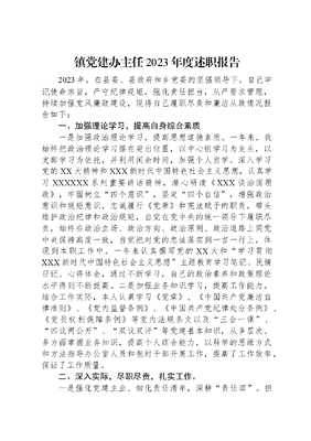 镇党建办主任2023年度述职报告2023年,在县委、县政府和乡党委的坚强领导下,自己牢记使命宗旨,严守纪律规矩,强化责任担当,从严要求管理,持续加强党风廉政建设,现将自己履职尽责和廉洁从政情况报告如下:一、加强理论学习,提高自身综合素质一是加强政治理论学习,提高思想道德素质。一年来,我始终把政治理论学习摆在突出位置,以中心组学习为龙头,以支部学习为依托,并利用闲余时间,加强个人自学。深入学习党的XX大精神和XXX新时代中国特色社会主义思想,认真学习XXXXXX系列重要讲话精神,潜心研读《XXX谈治国理政》,牢固树立四个意识,坚定四个自信,增强政治意识和规矩意识,忠诚履行《党章》和宪法赋予的职责,带头维护政治纪律和政治规矩,自觉在党中央的统一领导下履职尽责,始终在政治立场、政治方向、政治原则、政治道路上同党中央保持高度一致,自觉把对党的忠诚落实到一言一行上,体现到本职工作中。一年来认真撰写党的XX大和学习贯彻XXX新时代中国特色社会主义思想主题教育学习笔记、民情日记、心得体会,通过不断学习,自己的政治素养和政策理论水平得到不断提高。二是加强业务知识学习,提高工作能力。结合工作实际,本人认真学习《党章》、《中国共产党廉洁自律准则》、《党内监督条例》、《中国共产党纪律处分条例》、《党员权利保障条例》等党内法规条文以及三会一课、四议两公开、双议双评等党建基本知识,从多层次、多方面掌握业务知识,提高个人综合能力,以科学的思维方式和方法指导办公室人员和包村干部开展工作,提高了工作效率,保证了工作质量。二、深入实际,尽职尽责,扎实工作。一是强化党建主业、细化责任清单,深耕责任田。担主责、唱主角。坚持每周一例会部署,每周一、周四晚上统一组织学习,每月一调度推进,主持召开党建工作专题会议4次,为村级党员带头讲党课2次,与乡村干部谈心谈话6余人次。定清单、传压力。明确基层党建责任、问题、整改、考核四张清单,按季对村级党建工作进行督查考评、对第一书记进行述职考核。强基层、打基础。党员和党组织信息采集工作高效高质完成;规范党员发展管理,党建工作100%全覆盖,打造了党建示范点,增强了辐射带动作用。二是突出补齐短板、坚持问题导向,勇啃硬骨头。去年以来,在包抓X村的农业农村工作中,针对工作中存在问题,开展脱贫攻坚工作,完成新村部选址和后期建设协调工作。三是着眼固本强基、围绕服务发展,盘活一盘棋。抓载体、增活力。采取四学形式开展经常性学习教育;10余党员回炉淬火,党员党性得到了增强、服务群众的能力得到了提升。抓党建、促振兴。聚精会神打造党建示范点,积极组织党员干部结对帮扶困难户,驻村帮扶工作进展明显。抓统筹、谋发展。以党建为统领推进其他各项工作,农村三变改革全面铺开、生态建设持续加强、环境保护不断深化、基础设施不断改善。三、以三抓三促行动为契机,增强党性修养,加强党风廉政建设。在镇党委、政府正确领导下,认真贯彻落实中央、省、市县各项决策部署,主动适应新常态,按照全面从严治党要求,筑牢基层党建基础,把党风廉政建设贯彻于各项工作始终,推动各项工作有效落实。以《党章》为准绳,积极履行作为一名党员的权利和义务,增强全心全意为人民服务的宗旨思想,争做一名合格党员,加强党性锻炼,不断提高驾驭全局的能力,增强紧迫感和责任感,在廉政建设方面,自己能够廉洁奉公,拒腐蚀,不贪占,遵守党纪党规,遵守法律法规,加强组织纪律性,严格要求自己,在基层工作中决不吃拿卡要,保持艰苦奋斗的优良本色,在思想上、政治上始终同党中央保持高度一致,把上级组织的意图变为自己的正确行动。四、存在的问题及整改措施对照组织要求和群众期望,自己在履职尽责、廉洁从政方面还存在一些差距和不足,主要是廉政建设一岗双责主体责任发挥得还不够充分,对分管领域的干部职工经常性的廉政教育抓得还不够紧;一些干部法纪观念还不强,依法行政还不够规范。今后,我将以这次述责述廉为契机,认真履行职责,从严从实管理,确保党的各项纪律规定和政策措施不折不扣落实到位。一是强化理论武装,筑牢思想根基。坚持把政治理论学习作为坚定理想信念、增强党性修养、筑牢四个意识的重要途径,结合三抓三促行动教育常态化制度化和主题教育,深入学习《党章》《党规》《中国共产党廉洁自律准则》等制度规定,在学懂弄通做实党的XX大精神和XXX新时代中国特色社会主义思想上下功夫,时刻拧紧世界观、人生观、价值观这个总开关,筑牢信仰之基、补足精神之钙,增强政治定力,在思想上、政治上、行动上始终同以XXX同志为核心的党中央保持高度一致,任何时候、任何情况下都做到党中央提倡的坚决响应、党中央决定的坚决执行、党中央禁止的坚决不做,做到心有方向、心有定力。认真对照XXXXXX指出的七个有之问题,不越底线红线。二是强