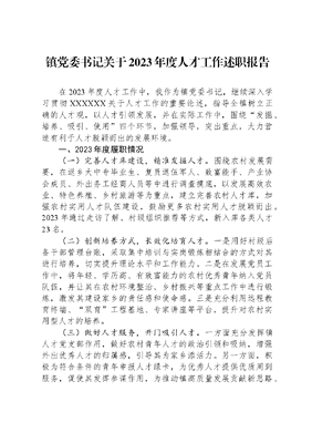 镇党委书记关于2023年度人才工作述职报告在2023年度人才工作中,我作为镇党委书记,继续深入学习贯彻XXXXXX关于人才工作的重要论述,指导全镇树立正确的人才观,以人才引领发展,并在实际工作中,围绕发掘、培养、吸引、使用四个环节,加强领导,突出重点,大力营造有利于人才脱颖而出的发展环境。一、2023年度履职情况(一)完善人才库建设,精准发掘人才。围绕农村发展需要,在返乡大中专毕业生、复员退伍军人、致富能手、产业协会成员、外出务工经商人员等中进行调查摸底,以发展高效农业、特色养殖、乡村旅游等为重点,建立完善农村人才库,加强农村实用人才队伍建设,鼓励更多农村实用人才脱颖而出。2023年通过走访了解、村级组织推荐等方式,新入库各类人才23名。(二)创新培养方式,长效化培育人才。一是用好村级后备干部管理台账,采取集中培训与实岗锻炼相结合的方式对其进行培养,切实提升理论水平和工作能力。二是在发展党员工作中,将年轻、学历高、有致富能力的农村优秀青年纳入党员队伍,并让其在农村环境整治、乡村振兴等重点工作中进行锻炼,激发其建设家乡的责任感和使命感。三是充分利用远程教育终端、双育工程基地、专家讲座等平台,提升对农村实用型人才的培养。(三)做好人才服务,开门吸引人才。一方面充分发挥镇人才党支部作用,做好农村青年人才的政治引领和吸纳,增强外出优秀人才的归属感,引导其为家乡添活力。另一方面,积极为符合条件的青年申报人才绿卡,为优秀人才提供优质周到服务,促使其发挥参谋作用,为推动镇高质量发展贡献新思路、注入新动力。(四)注重各尽其才,高质量用好人才。一是选配3名90后年轻干部进入镇机关中层,并将其派到重点任务一线去进行锻炼,培养年轻干部能力,激发干部队伍活力。二是通过村两委换届选举,6名农村优秀青年、9名致富带头人进入村班子,进一步优化了村级班子结构。三是将现有的12名新入职公务员,全部安排到农村信访、扶贫、宣传等一线岗位进行锻炼,通过压担子、交任务,促其成长进步。二、存在问题分析一是与乡村振兴发展需要相比,农村实用人才发掘和利用程度还远远不够,引领带动作用仍需继续增强。二是人才引进仍然不足,存在制度上缺乏创新、经费投入不足、优惠政策不完备等问题。这些问题从很大程度上影响了人才引进和自主创新工作,需要在今后的工作中认真调查研究,不断改进提高。三、2024年工作打算一是支持重点项目的发展壮大,带动全镇农业基地整体发展,带动种植大户做优做强,培育一批农户成为成熟的高效农业产业工人。二是鼓励引导农村实用人才参与到企业+村集体+农户新型镇域经济发展模式中来,继续增强农村实用人才示范带动能力。三是与企业、各村共同探索吸引、留住人才的有效措施,增强人才服务水平,提升人才吸引能力。