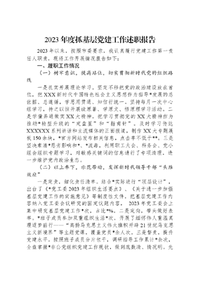 2023年度抓基层党建工作述职报告2023年以来,按照市委要求,我认真履行党建工作第一责任人职责,现将工作开展情况报告如下:一、履职工作情况(一)树牢意识,提高站位,切实贯彻新时代党的组织路线一是扎实开展理论学习。坚定不移把党的政治建设放在首位,把XXX新时代中国特色社会主义思想作为指导*发展的总依据、总遵循,学思用贯通、知信行统一。坚持每月一次中心组学习,持之以恒开展读原著、学原文、悟原理学习活动。二是学懂弄通做实XX大精神。把学习贯彻党的XX大精神作为推动*转型升级的定盘星和指南针。及时学习传达XXXXXX系列讲话和主流媒体的正面报道,制作XX大专题展板150余块,*官方网站发布相关信息,点击率不低于**。三是坚决肃清*恶劣影响和*、*流毒,利用职工大会、科务会、党小组会组织专题学习,对敏感关键词的信息进行了专项清理,进一步维护党内政治生态。(二)以上率下,示范带动,发挥新时代领导干部头雁效应一是定责,细化责任清单。结合*实际进行顶层设计,出台了《*党工委2023年组织生活要点》、《关于进一步加强基层党建工作的实施意见》等制度性文件,把基层党建工作内容纳入党工委会议研究的固定议题内容, 2023年党工委会上集中研究基层党建工作*次,占比*%。二是定向,带头做好表率。*班子成员参加双重组织生活*次,开展了缅怀伟人重温真理逐梦前行——高扬马克思主义伟大旗帜开辟21世纪马克思主义新境界等主题党课,覆盖党员*余人次。三是督责,提升党建水平。按照班子成员分片包干,调研指导工作累计*余次,全盘掌握*非公党组织党建工作现状,做到底数清、情况明。先后*次召开党建工作督查结果通报会,对软弱涣散的基层党组织书记进行约谈,巩固好的、帮助一般的、整顿差的。(三)常学常新,常态长效,由点及面提升新时代基层党建水平一是突出深学,确保学习效果。依托三会一课、清风讲堂、党群服务中心等学习平台,采取主题推荐+内容引导+实时反馈的方式,指导基层党组织定期开展学习教育*次,在*公众号推送学习教育动态*篇次。二是突出实做,开展主题活动。组织开展党员观看爱国主义教育影片、参观建川博物馆、举办党建知识竞赛等*余次主题活动。做好党建典型以点带面工作,通过开展不忘初心党建兴企党建工作现场交流会,推动党组织结对共建,形成资源共享、优势互补、同创品牌的党建工作共促模式。三是抓住重点,补齐党建短板。扎实推进党建*项重点任务,对新注册的*家企业进行了党建情况摸排,新成立支部*个,查找出党员*名口袋党员、隐形党员,纳入党组织有效管理,对*名失联党员进行了处置。将*个规模小或因企业经营不善党员流失严重无法正常开展党组织活动的空壳党支部向上级组织部门备案。形成党组织换届提醒制,指导*家基层党组织进行了换届,按期换届率100%。二、存在的主要问题及解决措施结合市委巡察反馈的意见以及述职评议查摆出的问题,*党工委在抓基层党建工作中还存在一些问题和不足,为此,*进行专题研究,对整改问题实行销号管理,做到即知即改、立行立改、真改实改、全面整改。主要体现在:(一)主体责任还须落实落细班子成员在履行党建主体责任方面依然存在抓业务建设实,抓党建虚的现象,党建主体责任盲区还在一定程度上存在,对分管领域的党建工作口头布置多,痕迹化管理意识还不到位,没有真正形成齐抓共管的党建工作格局。对此,*党工委分片负责包干到人,并出台了《*基层党建工作督导考核清单》,对组织建设、党建工作宣传及开展情况等进行督查,确保了管党治党力度不减、压力层层传导。(二)党建载体还需创新做实对新时代基层党建工作研究还不够深入,没有完全形成符合非公企业实际的党建工作新思路,缺乏创新载体、打造品牌的新路径,不能主动有效地运用新媒体开展党建工作。对此,*党工委将党建是生产力、创造力和凝*聚力的三力党建理念与智慧党建工程相结合,引导民营企业突出改革创新、提质增效等重点工作,把党旗插在产业链上,实现党建工作与业务工作同向发力、互促共进的党建工作新格局。(三)党性修养有待千锤百炼少数基层党组织没有把党员的教育管理与企业的管理提升可持续发展有机结合起来,存在活动形式缺乏自主创新,学习内容流于形式的情况。企业人员频繁流动,导致一些党员存在雇员心态,再加上企业给予党员发挥作用的平台不够,存在不愿意亮明党员身份,履行党员义务的问题。对此,*党工委坚持定期开展一次党建专题调研,做好企业业主和管理层思想教育工作,转变非公企业重经营、轻党建的价值导向。三、下步工作打算(一)推进两个覆盖,夯实基层基础一是主动适应*非公企业占比较大的特点,优化组织设置,扩大组织覆盖。对企业入驻情况实行动态监测。继续采取单独组建*、市域联建、行业统建等方式建立党组织,推进两个覆盖。二是对