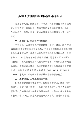 乡镇人大主席2023年述职述廉报告我现分管人大、经济工作。一年来,认真履行自己的岗位职责,务实创新,勤奋工作,圆满地完成了各项工作任务。现将一年来的学习、思想、工作、廉洁自律等情况述职报告如下,请予评议。一、加强学习,政治素养得到提高。今年以来,认真贯彻执行党的路线、方针、政策,深入学习XXX新时代中国特色社会主义思想,主动学习和钻研与本职工作相关的法律法规知识,始终坚持集体学习与个人学习相结合。认真参加XXXX主题教育的各项学习调研,原原本本学《纲要》《摘编》,深入农村调查研究撰写调研报告,并组织开展专题党课XX次,专题研讨会XX次,保证党的路线方针政策在工作中贯彻执行。组织主席团成员深入学习了《XXXXXXXX》《XXXXXX》《XXXX》等文件,不断提高主席团履职水平和服务能力。二、敢于担当,工作成效较为明显。1.坚决把党的领导摆在首位。旗帜鲜明讲政治,树牢四个意识,坚定四个自信,做到两个维护。坚持在镇党委领导下,严格落实重大事项请示报告制度,一年来,向镇党委请示报告工作XXXX次。自觉从全镇发展大局出发,统筹安排各项工作,确保人大工作的正确政治方向。2.坚持依法治镇。高标准召开镇XXXX人代会,听取审议工作报告XXX项,作出决定决议XXX项。依法补选XXXXX名,确保区委主张通过法定程序成为全镇人民的共同意志。3.着力推进绿色高质量发展。按照镇党委要求,镇人大主席团将全域清洁化、民生项目建设、园区企业发展等作为工作监督的重中之重,及时组织跟进视察检查。围绕XXXX主题,组织部分代表参加XXXX,并就煤改清洁能源、美丽村庄建设、污水处理设施建设等进行深度调研,提出意见建议XX条。围绕工业集聚区提升改造,改善营商环境主题,组织部分代表参加了XXXX企业家座谈会,并针对双万双服促发展中发现的XX个重难点问题,进行研究破解,进一步凝聚推进高质量发展的决心和信心。4.助力完成重点任务。引导代表参与到扫黑除恶专项斗争,针对选区进行宣传发动、排查线索。在创文创卫等工作中,传达党的方针政策,宣传区委和镇党委的决策主张,架起党委、政府联系人民群众的连心桥,切实当好区委和镇党委政府决策部署的监督者和推动者。5.深入落实双联系制度。坚持主席团成员联系代表制度广泛听取意见建议,鼓励和支持镇区两级代表依法履职。坚持代表联系选民制度,组织开展好人大代表联系选民周活动,宣传党的路线方针政策和党委政府推动高质量发展成果,广泛听取选民意见建议,及时转送政府办理。共召开XX次座谈会,联系选民XX名,代表入户走访选民XXX名,归纳梳理意见XX条。6.大力提升代表履职能力。把代表培训作为基础性工作,组织部分代表参加乡镇党校培训班,不断提高理论素养和履职能力。推动乡镇代表之家平台建设,提高标准化、规范化、常态化管理水平。加强代表履职监督,完善代表履职档案,开展区级代表向选民述职工作,促进代表工作真正活起来、实起来、严起来。7.稳步推进经济工作。坚持把提升发展质量和效益作为第一要务,主动适应经济发展新常态,经济保持持续、健康、稳定发展。预计,全年完成国内生产总值XX亿元,较去年有所下降;固定资产投入XXX万元,占任务的XXX%;公共财政收入XXX万元;农民人均可支配收入XXXX元。三、强化责任落实,狠抓分管领域作风建设。1.严守党的政治纪律和政治规矩。牢固树立四个意识、XXX,对区委和镇党委部署的重点任务,做到迅速学习传达、认真研究落实,态度坚决、不打折扣、不搞变通。坚持民主集中制,严格履行议事规则,涉及三重一大问题提请党委会审议,严格按照集体领导、个人分工、民主集中、会议决定的原则开展工作,并对全镇涉及到财政的重大事项做到细致把关,不出疏漏。2.着力推进全面从严治党。落实管党治党责任,将人大工作列入《2023年全面从严治党任务清单》,并严格按照时间节点完成任务。发扬刀刃向内的自我革命精神,紧扣XXX专项整治,深刻检视问题XX条,剖析思想根源,制定整改措施,到11月底全部完成整改。3.健全岗位目标管理责任制。将工作职责、任务和目标科学明确地落实到每个岗位,使每项工作任务具体落实到人,并定期听取工作汇报,同时,落实好内部控制,财政所两位所长在业务上明确分工互相监督,会计出纳交叉管理,确保全镇财务的健康运行。注重思想引导,对财政所成员、人大秘书每季度开展谈心谈话工作,及时掌握思想认识,对履职尽责、廉洁从政情况检查提醒,促进干部努力学习、勤奋工作、正确履职、健康成长。4.深入学法用法。积极参加集中培训学习,先后参加了区人大、区委组织部举办的培训班XXX期,同时,认真开展自学,对《教育法》、《环境保护法》、《土地管理法》等有关知识进行了深入学习。进一步强化法律运用,在招商引资、人大监督等工作中,强化法治