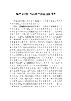 2023年履行全面从严治党述职报告根据工作安排,现将本人2023年上半年履行全面从严治党第一责任人责任情况报告如下。第一,坚持把政治建设摆在首位,切实抓好主题教育。坚持自加压力、不等不靠,在4月份主题教育启动后,制定《关于在领导干部中开展主题教育先学安排部署方案》,同步推动领导干部预热升温,以头雁作用学在前、做在前、改在前,立标杆、作表率。坚持推动各级领导班子和领导干部从思想作风上深查细照,对群众诉求解决情况进行深入分析,瞄准影响*高质量发展的散漫症、漂浮症、苟且症、萎靡症、低能症等五种症状,对标对表中央和省委要求,针对群众反映问题深刻检视反思,推动各级领导班子和领导干部从理论学习、政治素质、能力本领、担当作为、工作作风、廉洁自律等六个方面查找思想根源差距不足*条,制定整改措施*条,不断充实完善个人检视清单。坚持立行立改,针对省委书记*同志省委常委、省委组织部部长*同志调研指出问题,逐一开展整改,*个问题全部整改到位。开展*暖活动,*名网格员深入到户、见到人,排查解决问题*个,用党的关怀暖人心、聚人心。深入开展*专项整治,梳理各类问题*个,制定整改措施*条,已经整改*个、长期推进*,整改任务基本完成,常行点题式调查研究。调查研究是谋事之基、成事之道。调查研究的过程就是科学决策的过程,省略不得、马虎不得。调查研究与科学决策哪个在前,哪个在后,是有一定之规的,须先进行调查研究,方能再进行科学决策,否则,就可能犯拍脑袋乱决策、瞎指挥的弊病。以自我革命的斗争精神经常开展点题式调查研究,自觉主动把搞好调查研究,作为提高履职能力素质的必修课,勇于从日常事务性工作中抽身出来,积极深入基层,切实沉到一线,面对面了解基层实际,心贴心倾听群众诉求。只有戒骄戒躁、虚心请教,让基层干部群众感受到足够的诚心敬意,才能听到更多发自肺腑的心里话、大实话。第二,坚持持之以恒推进作风建设,全面强化基础保障。全面落实中央和省委为基层减负工作部署要求,举一反三整改省委解决形式主义官僚主义为基层减负专项督察反馈问题,制定《关于进一步整治形式主义为基层减负的若干措施》,明确了*制度等*条具体举措,与去年同期相比文件、会议总量下降*%,各类督查检查减少*%,全面叫停层层签订责任状和制定责任书,清理机关部门要求基层上报台账表格*项。进一步梳理和调整*权责清单,出台新的《*依法履行职责主要事项》和《*依法协助政府工作主要事项》,减少*工作职责*项。第三,坚持大兴调查研究之风,深入查摆短板弱项。大兴调查研究之风,将2023确定为*调研年,以学习贯彻XXX新时代中国特色社会主义思想主题教育深入调查研究的要求为契机,开展大走访大调研活动,先后发现问题*余个,解决420个,其余问题全部形成解决方案。从领导干部做起,制定《领导干部接访下访工作安排》,截至本月底,领导接访*人次,接待群众*批*人次,化解群众信访问题*件,督办*件。第四,坚持围绕高质量发展目标任务,全力夯实基础。以*次全会通过的《关于加强党的政治建设的意见》为根本,研究制定《中共*委关于加快绿色高质量发展的意见》,截至*年三季度,生产总值*亿元,增长*%,一般公共预算收入实现*亿元,国内招商引资完成*亿元;居民人均可支配收入*元,增长*%,稳中向好的发展态势得到进一步巩固。积极承接*疏解,落地*优质项目*个,协议投资额*亿元,储备*项目*个,协议投资额*亿元。制定《关于加快推进全域城深化的实施方案》,聚焦*地块逐项落实精准拆迁,全力弥补拆迁工作历史欠账,滞留户清零*户,*万平方米,预计年底前将完成拆迁*万平方米拆迁任务。聚焦查漏洞补短板,全面排查剩余房源和未还迁人员情况,实现以拆迁促还迁,以还迁促拆迁,*户双倍租房费已清零,预计年底前全面解决双倍租房费和滞留户问题。第五,坚持健全传导链条,层层压实党建责任。坚持*常委会研究党建工作机制。今年以来,*常委会会议专题研究基层党建工作*次。强化统筹领导和安排部署,制定《*党的建设工作领导小组2023年工作要点》《*开展全面实施基层党组织组织力提升工程专项行动工作方案》,压紧压实责任链条。抓好带头人队伍建设。坚持问题导向,结合基层党建存在的突出问题,制定整改工作任务书,明确工作任务和责任,以问题整改落实强化责任落地。规范干部选用,严格程序防止不正之风滋生。认真落实《党政领导干部选拔任用工作条例》,严格按照规定选人用人,始终以公开、平等、竞争的方式进行干部的提拔和任用,注重选拔群众公认、注重实绩、在本职岗位上表现优秀的干部,严把干部入口关,防止和纠正选人用人上的不正之风和腐败问题。坚持把《干部选拔任用条例》和四项监督制度等政策法规纳入夜学重要内容,进一步增强了干部选拔任用工作的自觉性、紧迫感和责任感。在总结工作的同时,我也清醒地认识到工作中存在的
