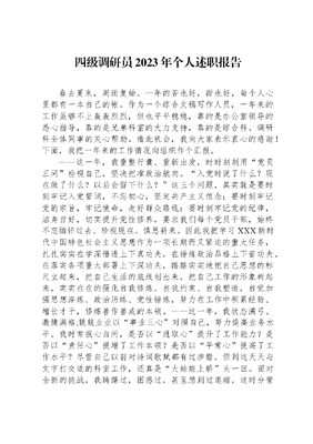 四级调研员2023年个人述职报告春去夏来,周而复始。一年的苦也好,甜也好,每个人心里都有一本自己的帐。作为一个综合文稿写作人员,一年来的工作虽够不上轰轰烈烈,但也平平稳稳,靠的是办公室领导的悉心指导,靠的是兄弟科室的大力支持,靠的是综合科、调研科全体同事的关心帮助。借此机会,我向大家表示衷心的感谢!下面,我把一年来的工作情况向组织作个汇报。——这一年,我重整行囊、重新出发,时时刻刻用党员三问检视自己,坚决把准政治航向。入党时说了什么?现在做了什么?以后会留下什么?这三个问题,其实就是要时刻牢记入党誓词,不忘初心,坚定共产主义信念;要时刻牢记党的宗旨,牢记使命,走好群众路线;要时刻牢记党的纪律,洁身自好,切实提升党性修养。要求我们每个党员干部,始终不忘缅怀过去、珍视现在、慎思将来。因此我把学习XXX新时代中国特色社会主义思想作为一项长期而又紧迫的重大任务,扎扎实实在学深悟透上下真功夫,在锤炼政治品格上下苦功夫,在落实各项重大部署上下深功夫,踏踏实实地把自己思想的标尺立起来,把自己生活的底线划出来,把自己工作的形象树起来,实实在在的强化自我修炼、自我约束、自我塑造,自觉加强思想淬炼、政治历练、党性锤炼,努力在工作中积累经验、增长才干,修炼善作善成的本领。——这一年,我状态满弓、激情满格,兢兢业业以事业三心对照自己,努力提高业务水平。我时常抿心自问,是否以进取心提升了工作能力?是否以责任心提增了工作本领?是否以平常心提高了工作水平?尽管自己以前对诗词歌赋都有过涉猎,但到这天天与文字打交道的科室工作,还真是大姑娘上轿头一回。面对全新的挑战,我踌躇过,困惑过,甚至想到过退缩,这时分管领导和科里同事们不断地为我鼓劲儿、打气儿,让我很快打消了顾虑、稳定了心神、积攒了信心。初学三年,口出狂言。再学三年,不敢妄言,又学三年,沉默寡言,是我在综合科切心的感受和体会。众多高手的文章磨平了我的棱角,在这里我迎接自己的不仅仅是简简单单的往事归零、从头开始,更是一场任重道远的爬坡过坎、自我转型。对于文稿人员来说,无论是起草工作报告,还是领导讲话稿,都应该站在领导的高度,换位思考、同频思考,写出领导需要讲的话和应该讲的话,这样的稿子才算合格。于是我常怀进取之心,以书本为师,以前辈为师,以同事为师,努力提高自己的写作水平。责任心是文稿人员重要的职业要求。最忌讳的就是粗心大意、一字之差,谬之千里。写错一个字,都有可能影响一件重要工作、延误一项重大活动。因此我经常对文稿进行反复地校对修改,力求做到精雕细琢、精益求精。人们常说,能不能干好是能力问题,想不想干好是态度问题。我深知勤能补拙,于是我常让节假日、双休日办公桌上一份份文件、一叠叠稿纸、一堆堆资料见证和涵养我那平常的心境。——这一年,我如履薄冰、如鉴明镜,坦坦荡荡以自律三线对照自己,不断筑牢拒腐防变堤坝。党的百年征程充分证明,唯有坚定理想信念、才能行稳致远。我时刻警醒自己是否坚守了政治上的红线?是否越过了工作上的准线,是否碰触了生活上的底线?于是我勤掸思想灰,时刻对照理论理想、党章党纪,让自己看得清大势,站得稳脚跟,辨得清方向,不当糊涂虫墙头草两面人。常破心中贼,始终做到心存敬畏、手握戒尺,从严要求自己、从严管理自己,做到执行纪律不变通,落实政策不走样。多思贪欲害,用心用情用力做好岗位职责,净化朋友圈,纯洁社交圈,切实走好新时代赶考路。回首一年的工作,还有很多地方努力了,没有成功。一些具体工作还做得不够细致。文稿起草水平距离领导要求还有很大差距。工作中还时有急躁忙乱的现象。与其它科室同事交流不多,等等问题,我将在今后的工作中努力加以解决。新起点,新征程。希望与困难同在、机遇与挑战并存、未来任重而道远。我相信,只要始终保持谦虚谨慎、砥砺前行,自己憧憬的提笔能写、开口能说、遇事能办的愿景就一定会实现。