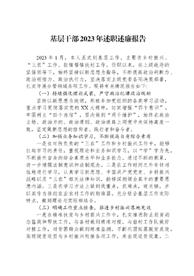 基层干部2023年述职述廉报告2023年1月,本人正式到基层工作,主要责乡村振兴、三农工作、驻镇帮镇扶村工作。任职以来,在上级政府的坚强领导下,始终坚持以新思想为指导,不断提高政治判断力、政治领悟力、政治执行力,坚决落实上级党委各项决策部署,扎实开展分管领域各项工作。现将有关情况报告如下:(一)持续强化理论武装,严守政治纪律政治规矩坚持以新思想为统领,积极参加党组织的各类学习活动,重点学习贯彻落实党的XX大精神,切实增强四个意识,牢固树立四个自信,坚决做到两个维护,始终在政治立场、政治方向、政治原则、政治道路上同党中央保持高度一致,坚定做新思想的信仰者、践行者和奋斗者。(二)加强业务知识学习,不断提高自身综合素质一是在对所负责的三农工作和乡村振兴工作中,能够扛起学习的责任,重视理论和业务知识学习,以学字为先,不断提升自身的综合素质水平和业务能力。通过不断的积累,进一步增强法制意识和法制观念。二是在工作时间之外有针对性地进行学习,认真学习新思想、中国共产党党史、乡村振兴战略以及三农相关法律知识,能够深刻领会其中的重要思想内涵。三是在学习方法上做到找重点,抓难点,破关键,并以其作为推动农业农村工作的助推器。充分结合基层工作实际特点,做到理论与实际相结合。(三)明确工作重点任务,推进乡村振兴落地见效一是在精准扶贫与乡村振兴工作中,扎实推进防止返贫动态监测和帮扶工作,与各村做到精准对接,与驻村工作队做好对接工作,对贫困群众做到精准监测,不断巩固拓展脱贫成效,实现脱贫攻坚与乡村振兴衔接各项工作,未出现返贫现象。二是坚持农业产业主导地位,持续抓好特色产品品质提升工作,积极培育、申报一村一品、一镇一业产业,将农业工作推向实处。三是全力推进撂荒耕地复耕复种工作,深入到田间地头指导各村工作,并加强整治撂荒耕地,复耕复种面积超x亩,以零容忍的态度坚决遏制新增违法占用耕地行为。四是发动各村做好三清三拆三整治工作,积极做好环境保护宣传工作,深入推进美丽宜居乡村建设,实现农村卫生保洁全覆盖,及时落实好环保督查要求。五是扎实推进河长制工作,明确各级河长职责,做到每一巡河,每月一总结,各级河长累计巡河次数超过x人次。六是做好森林防火工作,坚持以预防为主,明确x名护林员的工作职责,形成巡护常态化,并要求每日一报送。七是做好红火蚁防控工作,成立防控工作小组,切实做好红火蚁排查防控宣传、培训工作。(四)严守廉洁自律底线,保持务实清廉政治本色本人严格遵守《中国共产党廉洁自律准则》,带头贯彻执行中央八项规定精神,严格执行个人有关事项的报告制度,按时如实向组织报告个人有关事项。始终以谦虚谨慎、不骄不躁、艰苦奋斗的作风要求自我,从未有特权主义思想和行为,做到清正廉洁干工作、依法依规办事情,对家人子女也严格教育,做到廉洁修身、廉洁齐家。工作期间,能够经常到各村调研走访,倾听人民群众的心声,聚焦三农问题,抓好乡村振兴,把解决好人民群众最关心、最直接、最现实的问题作为工作导向和目标开拓思路、创新工作方式方法探索富有实效的服务和举措。(一)政治理论学习还不够。未能从战略的高度充分认识到系统的理论知识和成熟的战略思维。没有养成时时汲取新知识新理论的良好习惯,对学习抓得不紧,没有做到持之以恒,缺乏激情。(二)方法方式成效还不够。刚到基层工作,对当地的实际情况了解还不够深入,与基层群众没有进一步拉近距离。(三)工作创新意识还不够。工作存在惯性思维,凭经验办事,有时还习惯凭经验考虑问题和办事,习惯用一些老办法、老套路、老思维来想问题,缺乏创造性开展工作。(四)把强化理论武装作为动力源泉。坚持把学习党的创新理论作为终身必修课,在学深悟透中加强理论修养,在融会贯通中强化系统把握,在知行合一中提高工作水平,推动学习贯彻往深里走、往心里走、往实里走,持之以恒补精神之钙,坚持把理论知识转化为实践,推动农发展迈上新台阶。(五)把勇于担当干事作为不懈追求。坚持把担当作为一种责任和使命。积极推进撂荒复耕工作,确保现有耕地应种尽种。在总结中不断提出新思路,对各村现有的产业的发展情况进行分析调研,拿出新举措,做大做强一镇一业,一村一品产业,突出特点特色,推动高质量发展。(六)把坚守为民初心作为价值取向。牢固树立为民服务思想,将保障和改善民生作为一切工作的出发点和落脚点,扎实推进农村基础设施建设,补齐乡村振兴基础设施短板。集中精力抓重点难点和薄弱环节的突破,着力解决好人民群众的忧心事、烦心事,不断增强人民群众的获得感幸福感安全感。