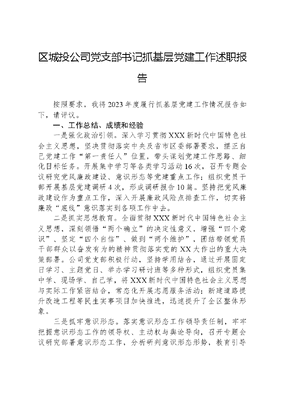 区城投公司党支部书记抓基层党建工作述职报告按照要求,我将2023年度履行抓基层党建工作情况报告如下,请评议。一、工作总结、成绩和经验一是强化政治引领。深入学习贯彻XXX新时代中国特色社会主义思想,坚决贯彻落实中央及省市区委部署要求,摆正自己党建工作第一责任人位置,带头谋划党建工作思路、细化目标任务。开展集中学习等各类学习活动16次,召开专题会议研究党风廉政建设、意识形态等党建重点工作;组织党员干部开展基层党建调研4次,形成调研报告10篇。坚持把党风廉政建设作为重点工作,深入开展廉政风险点排查工作,切实将廉政底线意识落实到各项工作中去。二是抓实思想教育。全面贯彻XXX新时代中国特色社会主义思想,深刻领悟两个确立的决定性意义,增强四个意识、坚定四个自信、做到两个维护,团结带领党员干部群众以奋发有为的精神贯彻落实党的XX大作出的重大决策部署。公司党支部积极行动,坚持学用结合,通过开展固定日学习、主题党日、举办学习研讨班等多种形式,组织党员集中学、现场学、自己学,将XXX新时代中国特色社会主义思想与实际工作紧密结合,常态化开展志愿服务活动;新建道路提升改造工程等民生实事项目加快推进,迅速提升了全区整体形象。三是抓牢意识形态。落实意识形态工作领导责任制,牢牢把握意识形态工作的领导权、主动权与舆论导向,召开专题会议研究部署意识形态工作,分析研判意识形态形势,教育引导党员干部提高政治站位,坚定理想信念,规范党员干部网络行为。注重自学和集中学相结合,坚持带头学,当标杆,组织深入学习贯彻党的XX大精神,推动了公司宣传思想工作迈上新台阶。二、抓基层党建方面存在的突出问题一是党建工作的新思路、新办法不多。党建工作眼界不宽,思路不够创新,还仍然习惯沿用过去的思维去推进党建工作,存在只要把上级要求落实好就行了的保守思想,导致支部党建工作创新意识不强。缺少先行先试、勇于创新的胆识和魄力,对如何加强公司支部党建工作一直没能提出独具特色的方式方法,对新平台、新途径研究尝试不够深入。二是教育活动形式不够多样。党员学习和公司实际工作结合不够紧密,学习形式较为单一;党员学习特色彰显、经验总结力度不够;学习教育的创新意识不强,部分同志限于落实上级的部署、阅读指定书目等活动,对于党史学习精神的领悟不够深入,学习的发散性不足;部分同志存在学思践悟、知行合一做得不够好,学习成果转化为实际工作举措的办法不够多,学习和实践的有效融合仍需优化完善。三、2024年度书记抓基层党建工作的思路、重点和措施一是提高思想认识,在抓支部党建工作上出实招。牢固树立党建第一责任人意识,持续深入学习宣传贯彻党的XX大精神,把学习贯彻XXX新时代中国特色社会主义思想作为首要政治任务,作为中心组学习的主题主线,深入学习XXXXXX系列讲话精神,坚持政治理论学习常态化,创新学习形式,深刻领悟两个确立的决定性意义,增强四个意识、坚定四个自信、做到两个维护,保持政治自觉、思想自觉、行动自觉。强化科学理论武装,牢牢把握XXX新时代中国特色社会主义思想的世界观和方法论以及贯穿其中的立场观点方法,做到学思用贯通,知信行合一。严格落实三会一课、固定学习日、谈心谈话制度,丰富党建工作载体,积极开展多样化的党建主题文化活动,努力提升党组织的凝聚力、创新力、执行力、战斗力。加强党员学习培训,用党的先进理论武装头脑,补足精神之钙。二是严肃政治生活,在抓支部规范化建设上见真章。在严肃组织和政治生活上,进一步加强党组织建设,增强党支部活力,充分发挥党组织战斗堡垒作用,健全党员经常性学习、日常管理制度,发挥模范带头作用。推动支部党员教育经常化、组织生活正常化、作用发挥常态化,严防出现党员纪律松弛、组织生活随意化的问题;充分利用学习强国等新媒介,开展形式多样实效明显的学习教育活动,加强互动教育,深化机关讲堂,在三会一课、固定学习日、专题学习中,进一步集思广益,大胆创新,增强学习成效,让全体党员都识大体、顾大局,做到心中有党、心中有责、心中有戒、心中有民。三是坚持全面从严治党,在抓党建促队伍上见实效。紧紧围绕新时代党的建设新要求,不断加强领导班子和干部队伍建设。贯彻全面从严治党责任体系,认真落实中央八项规定及其实施细则精神,坚决纠正四风,提升一体推进三不腐的能力水平和工作效能。落实全面从严治党新要求,从严监督管理党员干部,做实做细党风廉政建设,开展纪律教育、廉洁教育和警示教育,切实把思想和行动统一到党中央决策部署和省委、市委、区委精神上来,为现代化幸福美好新城区建设作出更大贡献。